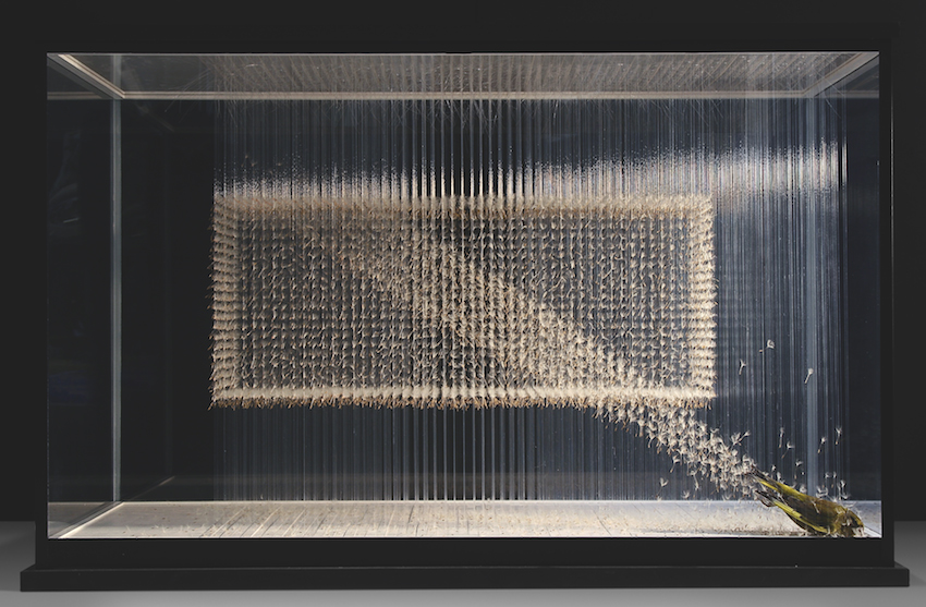Greenfinch (taxidermy), dandelion seeds, nylon, in vitrine, 53.5 x 83.5 x 43.5 cm, 2013