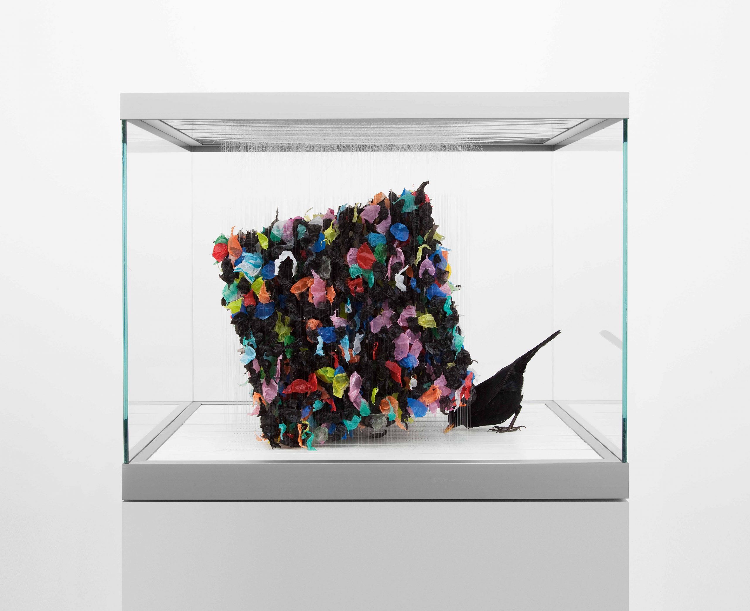 Blackbird (taxidermy), torn polythene, nylon, in vitrine, 58.4 x 71.6 x 71.6 cm, 2013