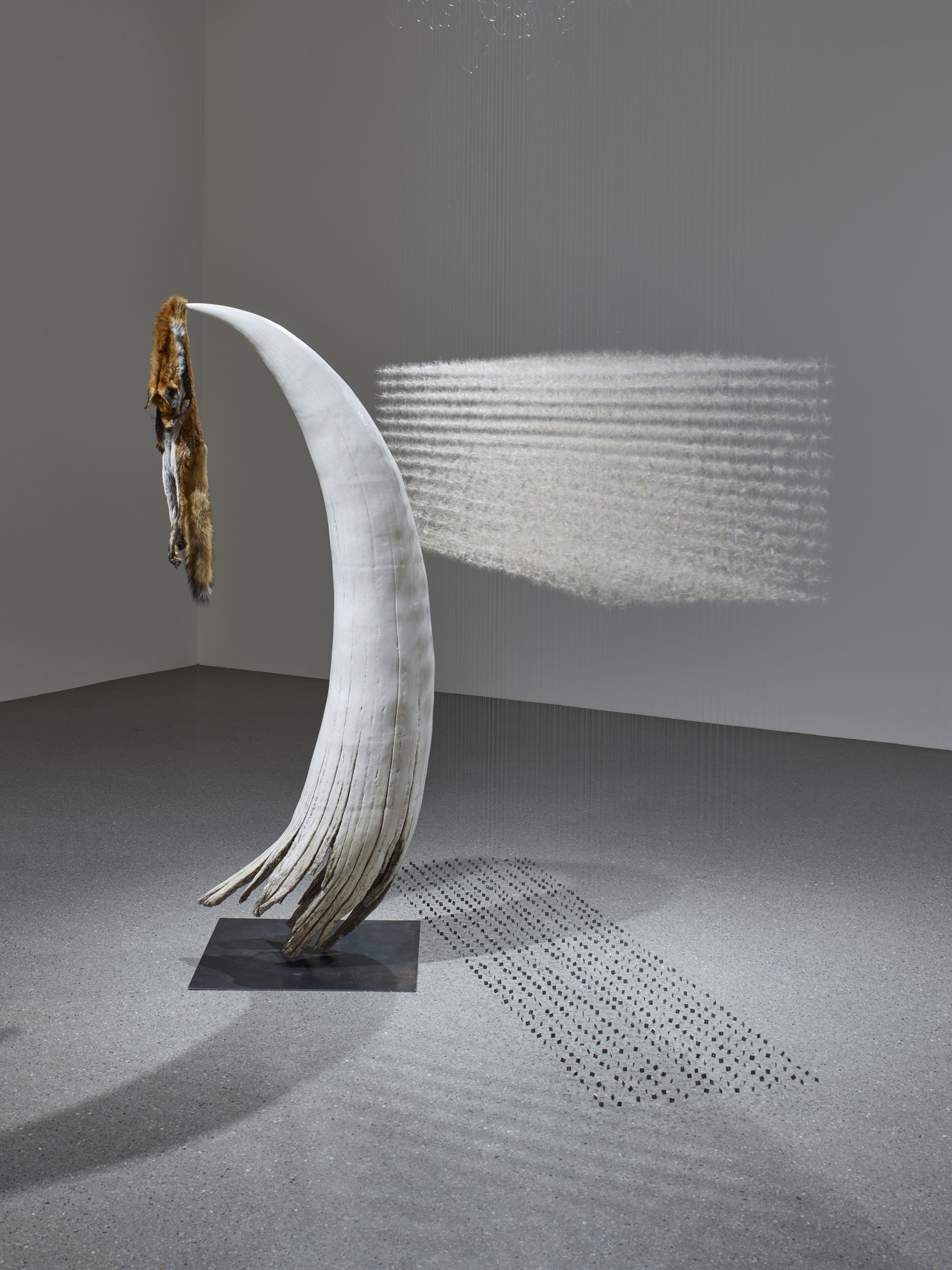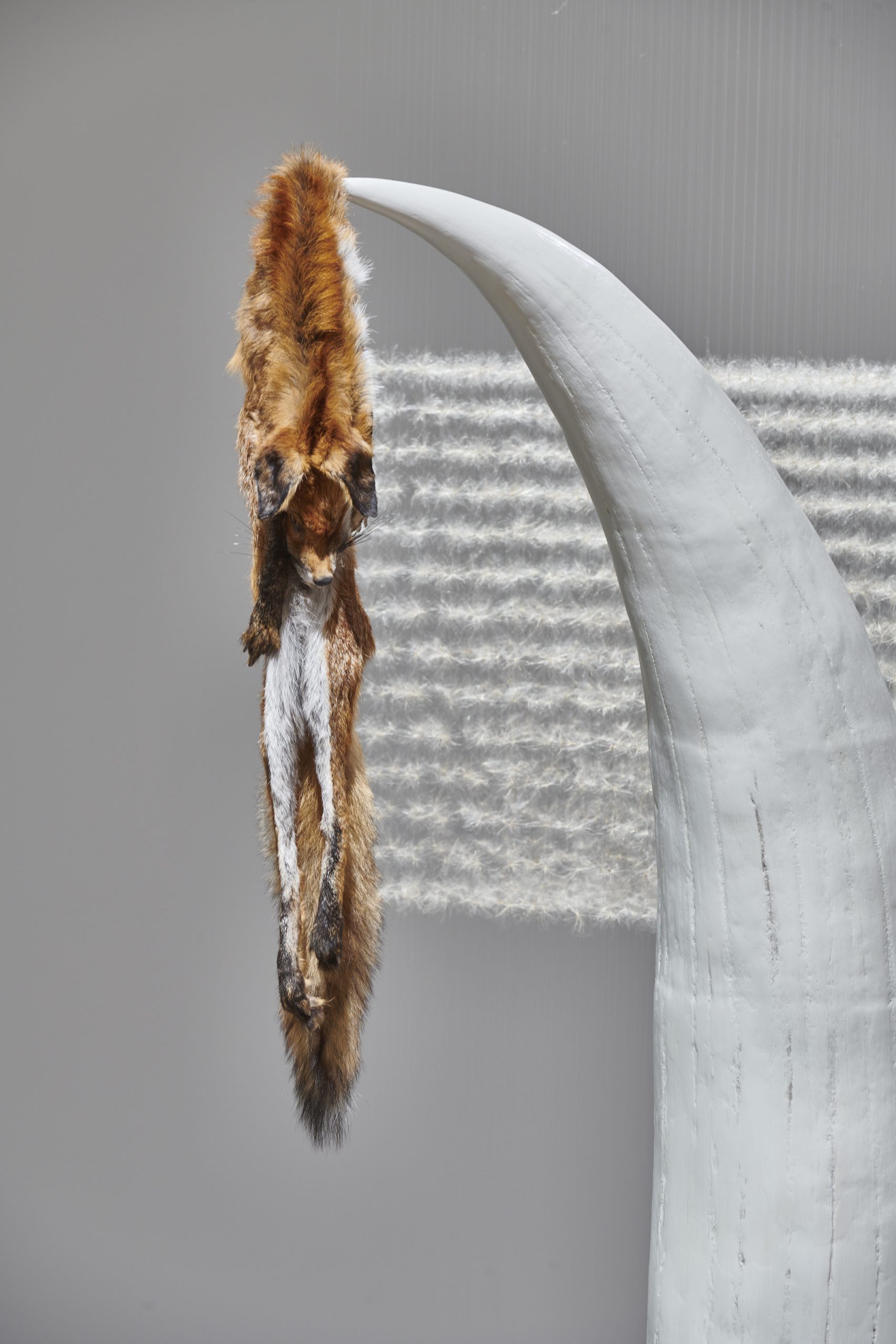 2021, Stoneware, fox skin, thistle seeds, nylon, lead, mixed media, 300 x 196 x 135 cm