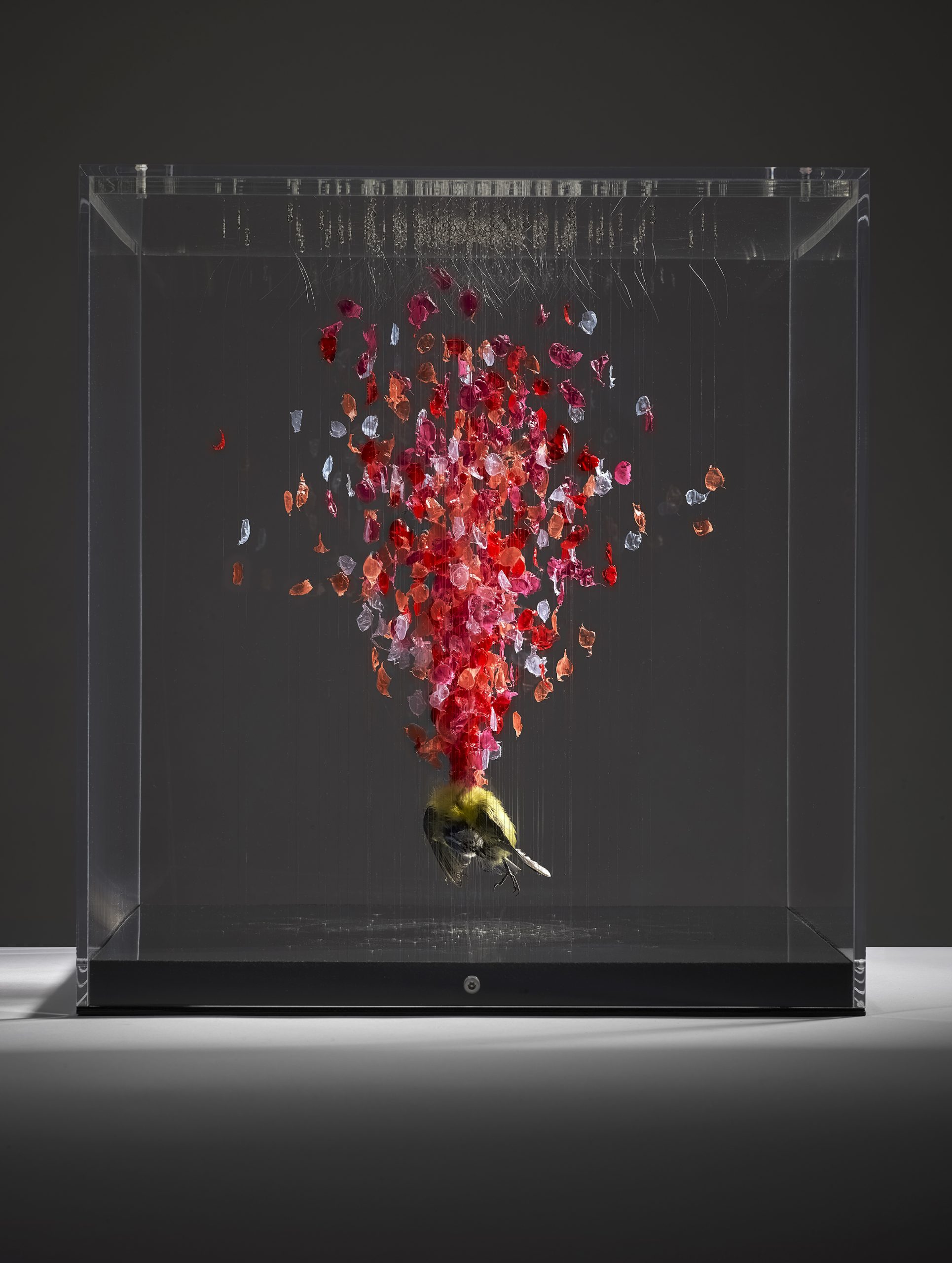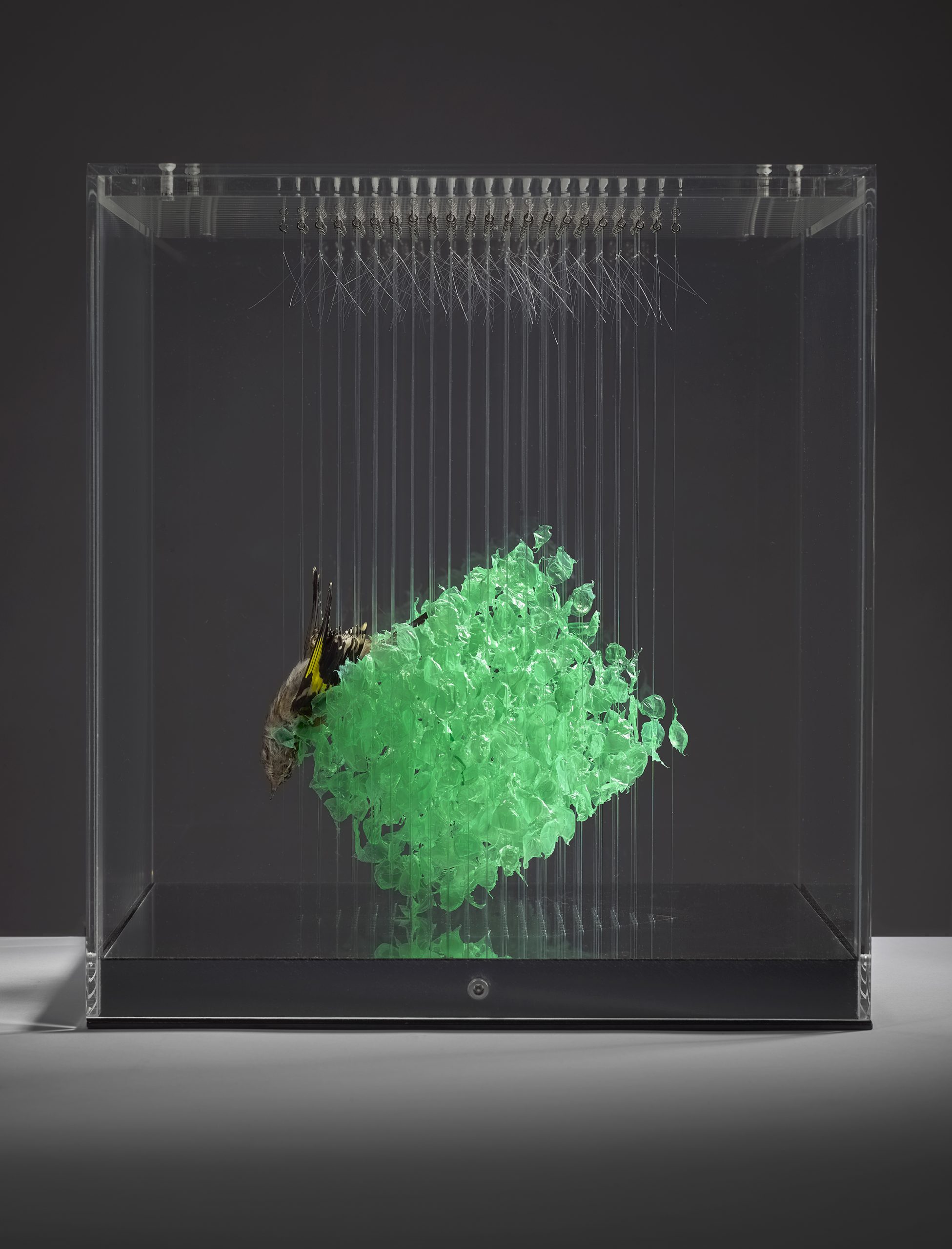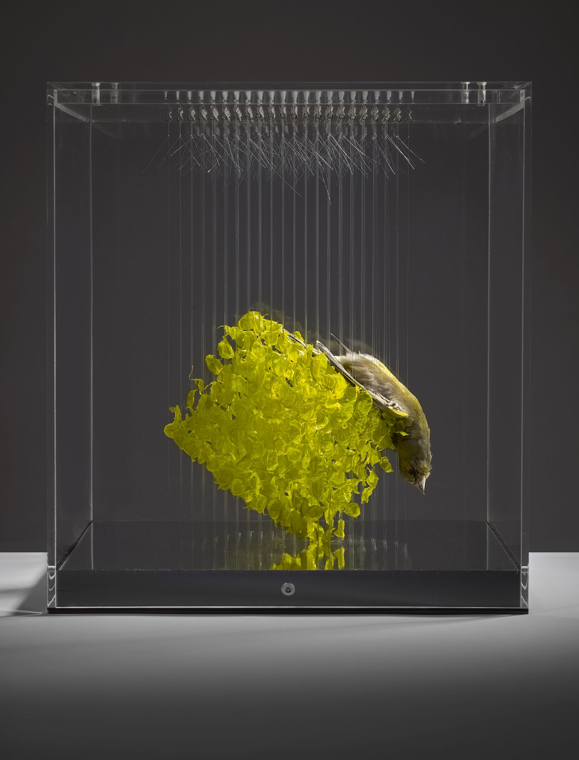 2021, Greenfinch skin, polythene, nylon, mirror, in vitrine, 34.4 x 31.1 x 31.1 cm