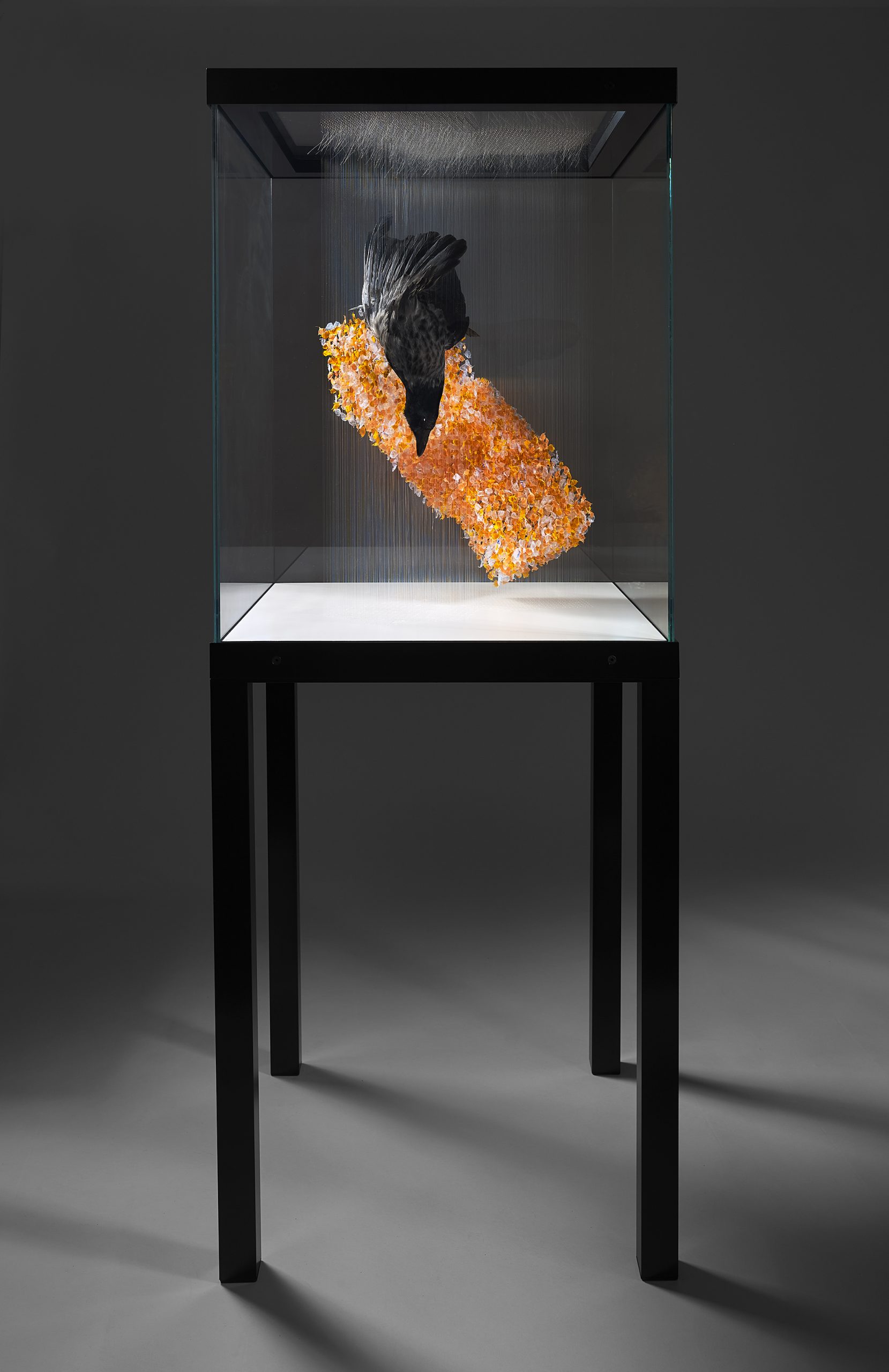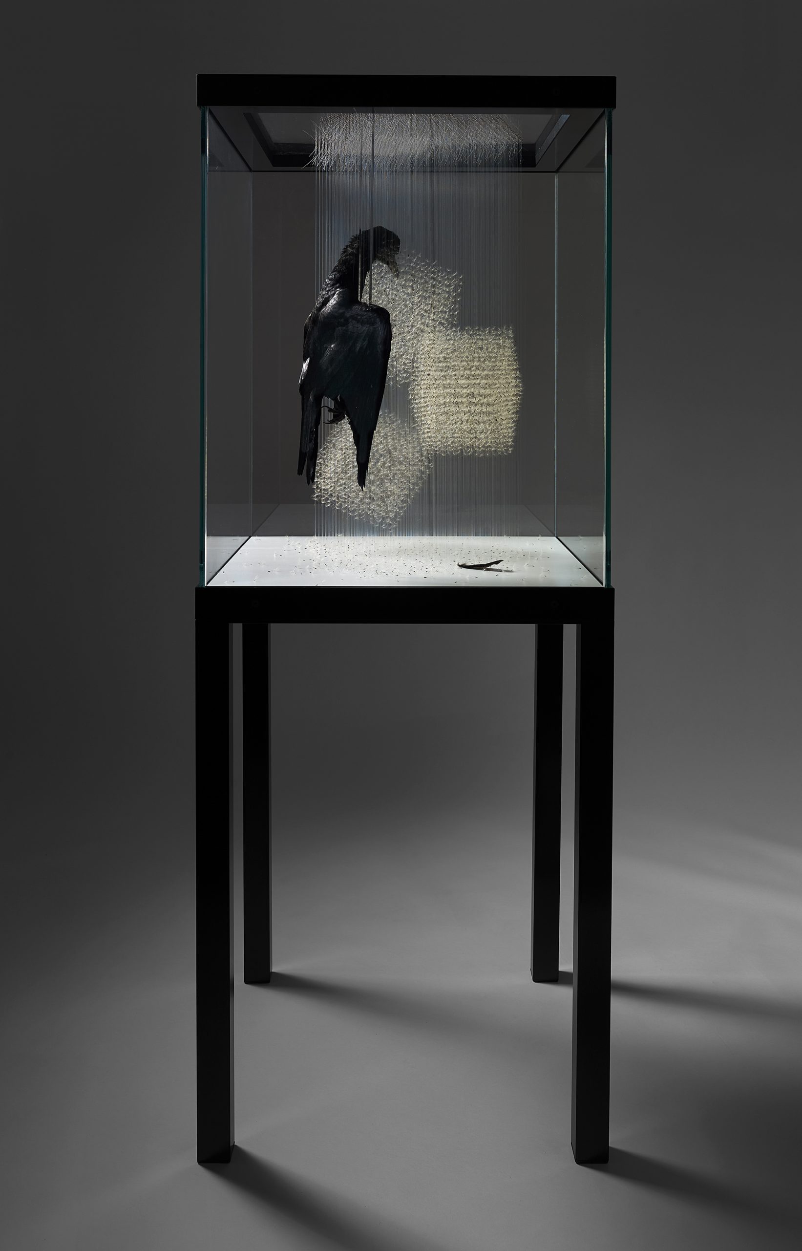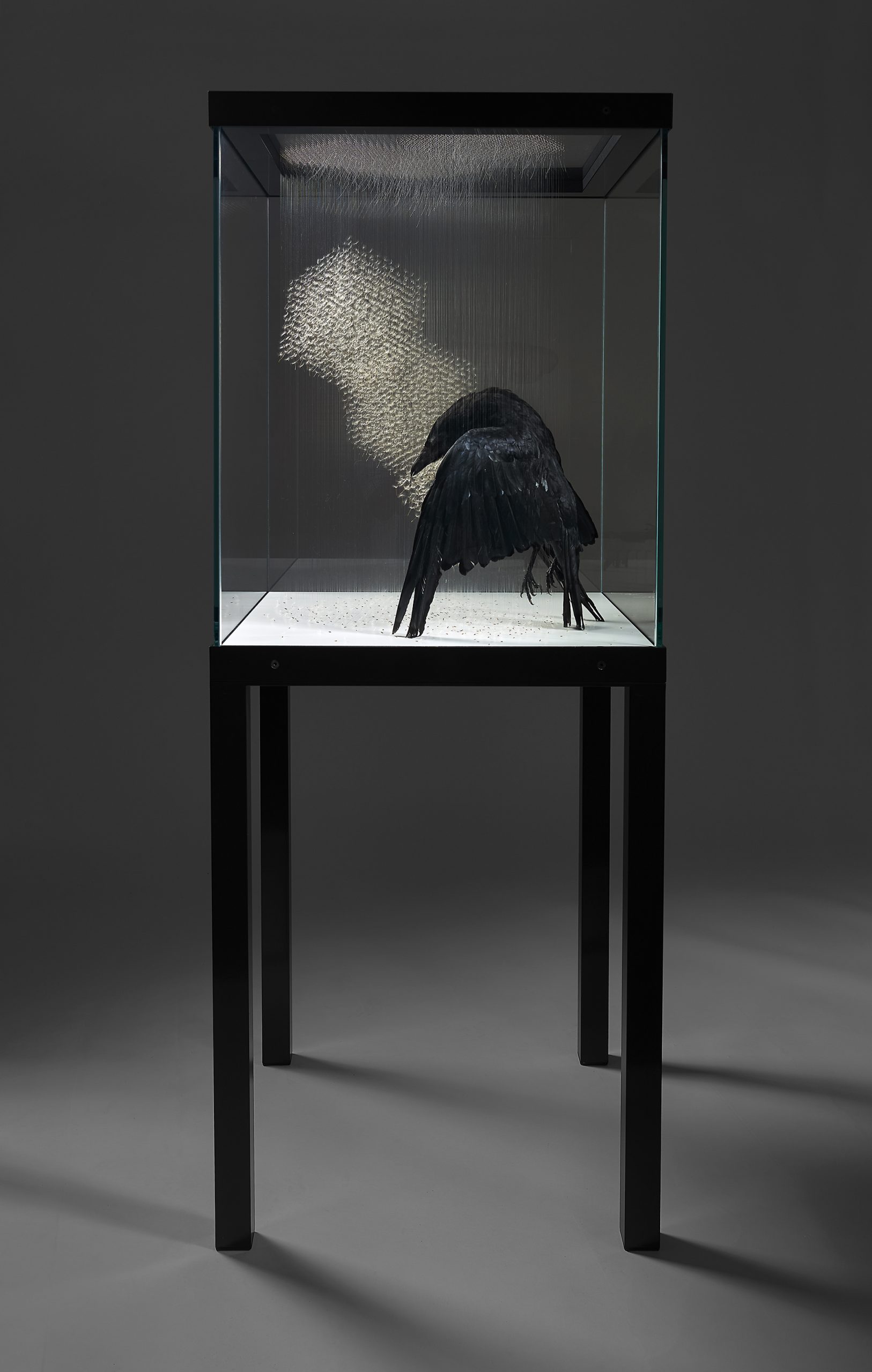 2021, Hooded crow skin, polythene, nylon, in vitrine, 170 x 63.3 x 63.3 cm