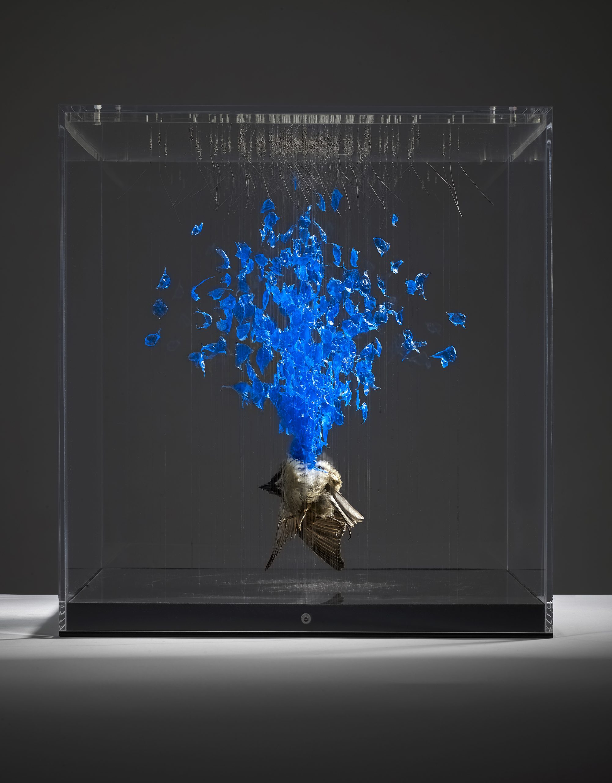 2021, Blue tit skin, polythene, nylon, mirror, in vitrine⁠, 44.3 x 41.3 x 41.2 cm