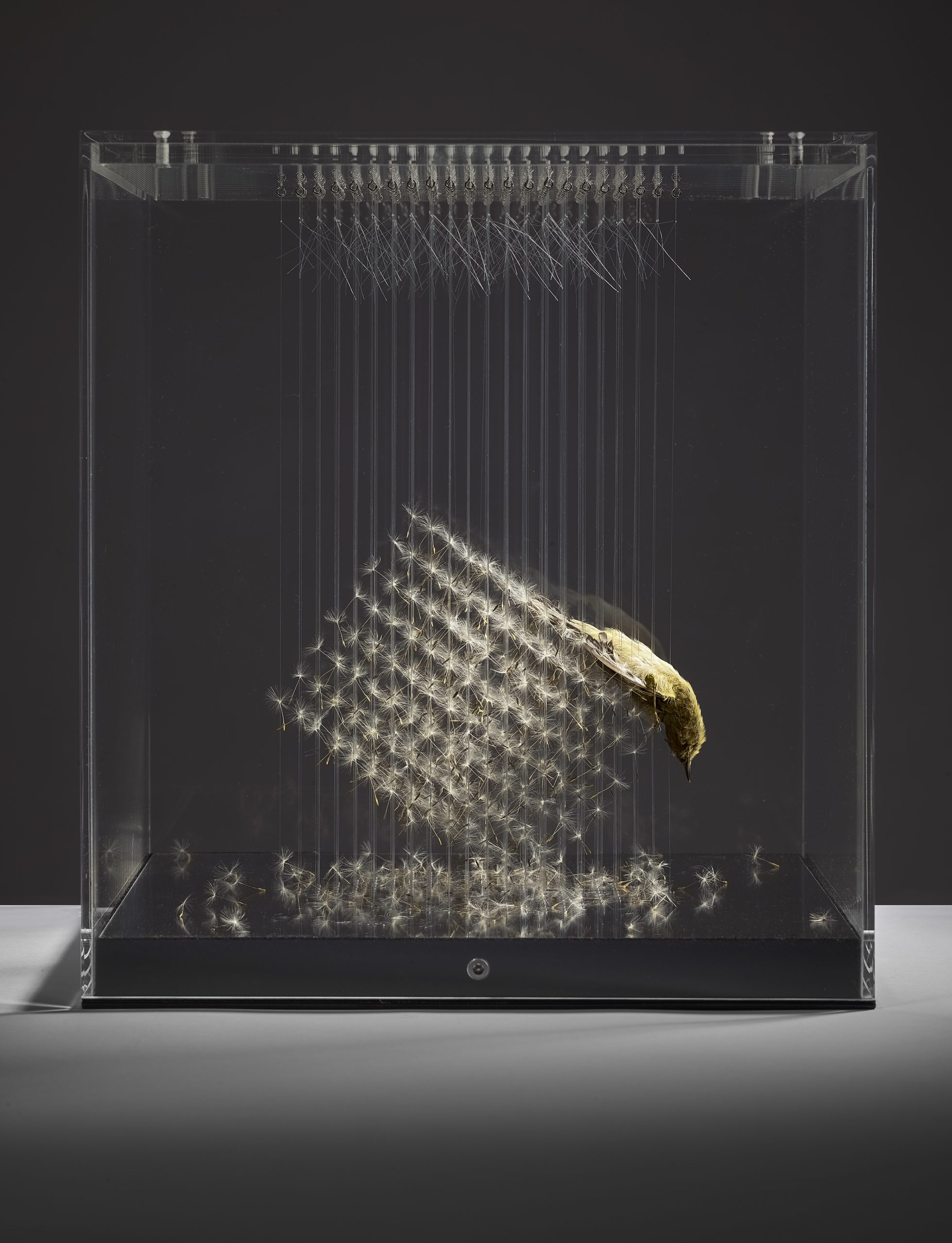 2021, Willow warbler skin, dandelion seeds, nylon, mirror, in vitrine, 34.3 x 30.1 x 30.2 cm
