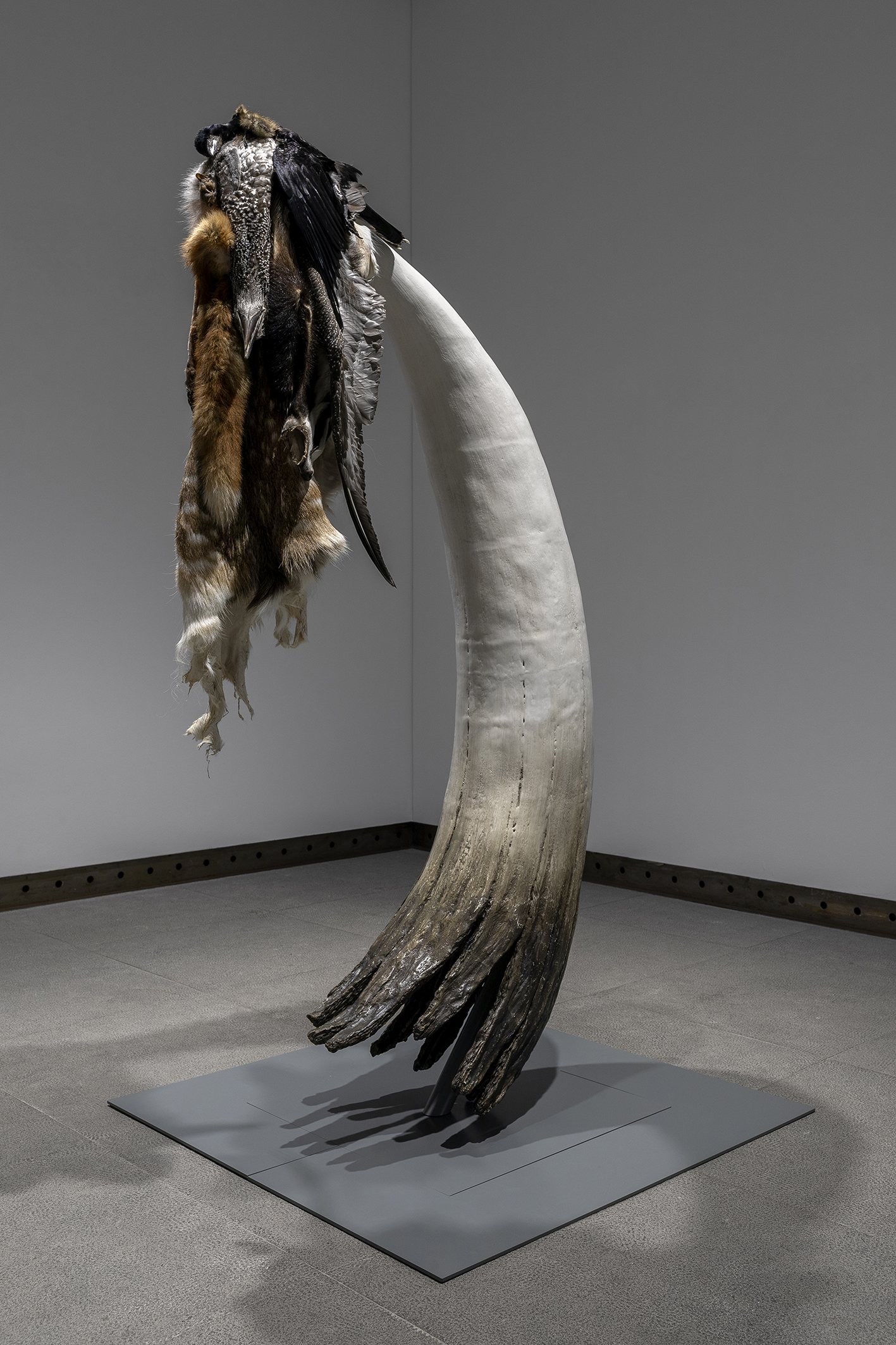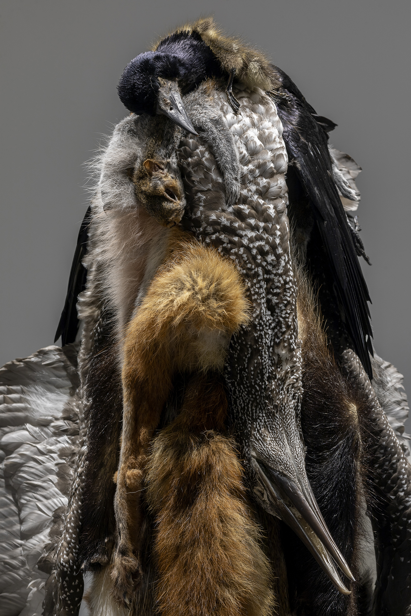 Stoneware, animal skins (deer, fox, badger, gannet, squirrel, crow, duckling), mixed media
