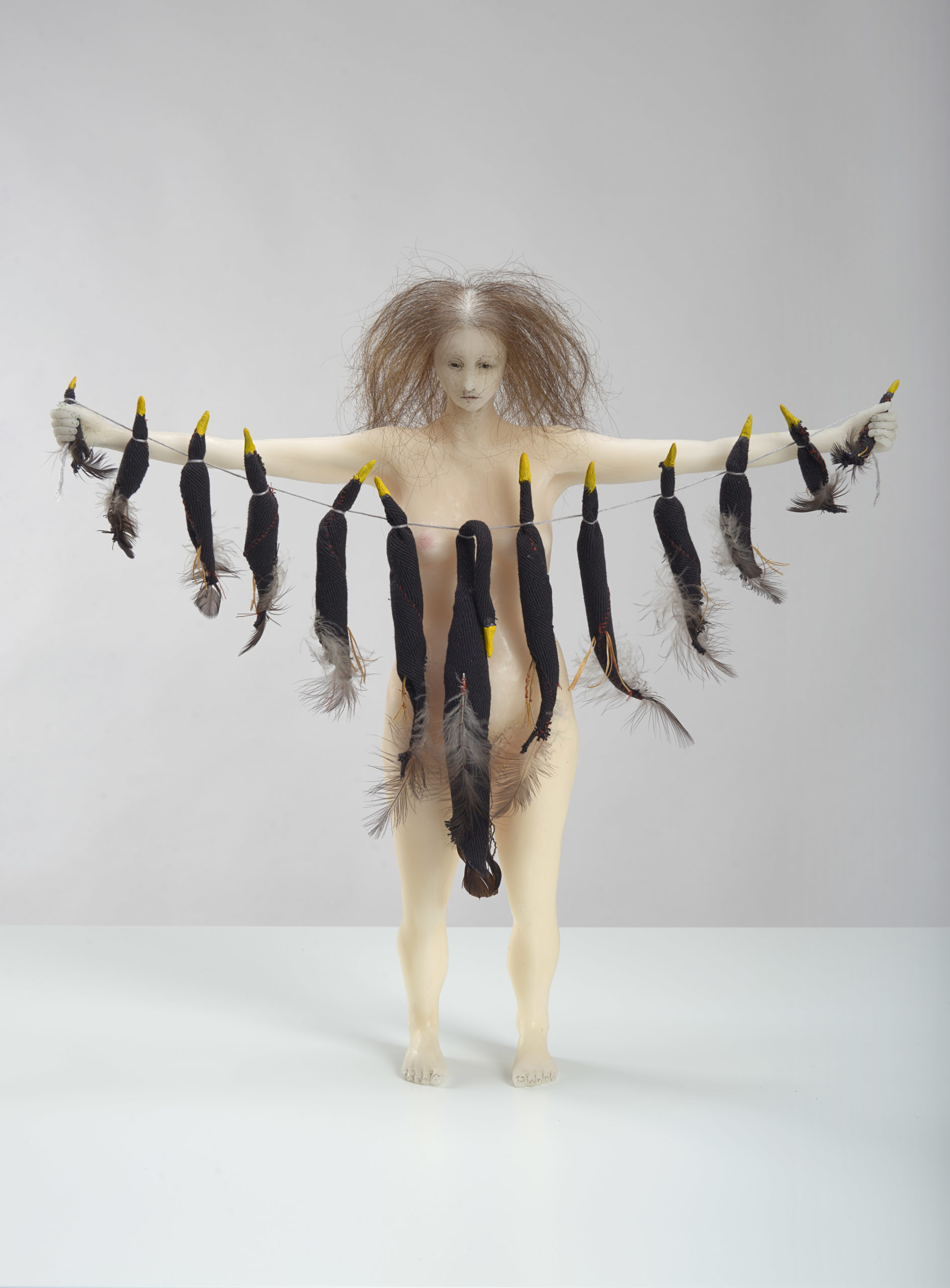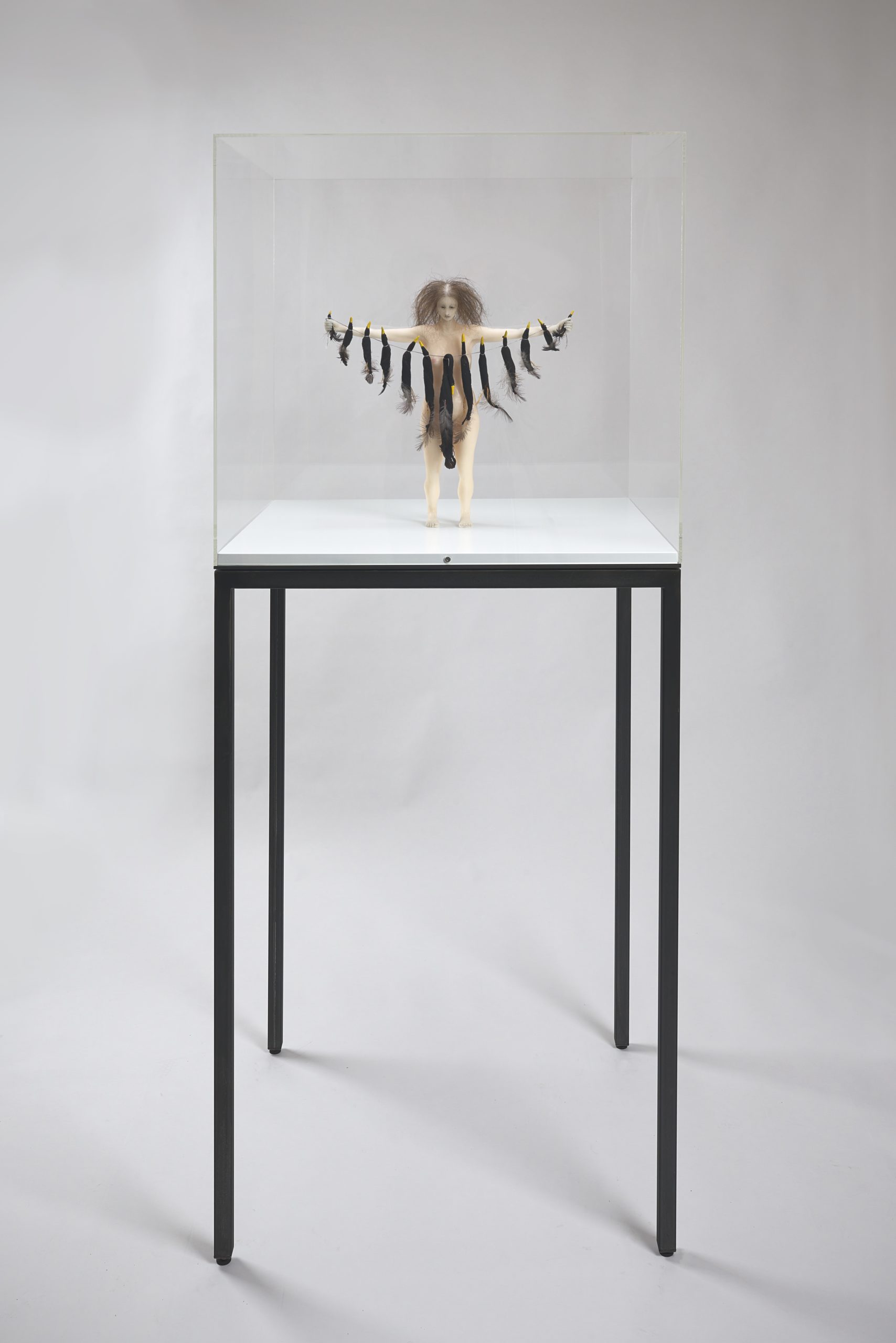2023, Wax, human hair, feathers, mixed media, in vitrine, 184 x 78 x 68 cm