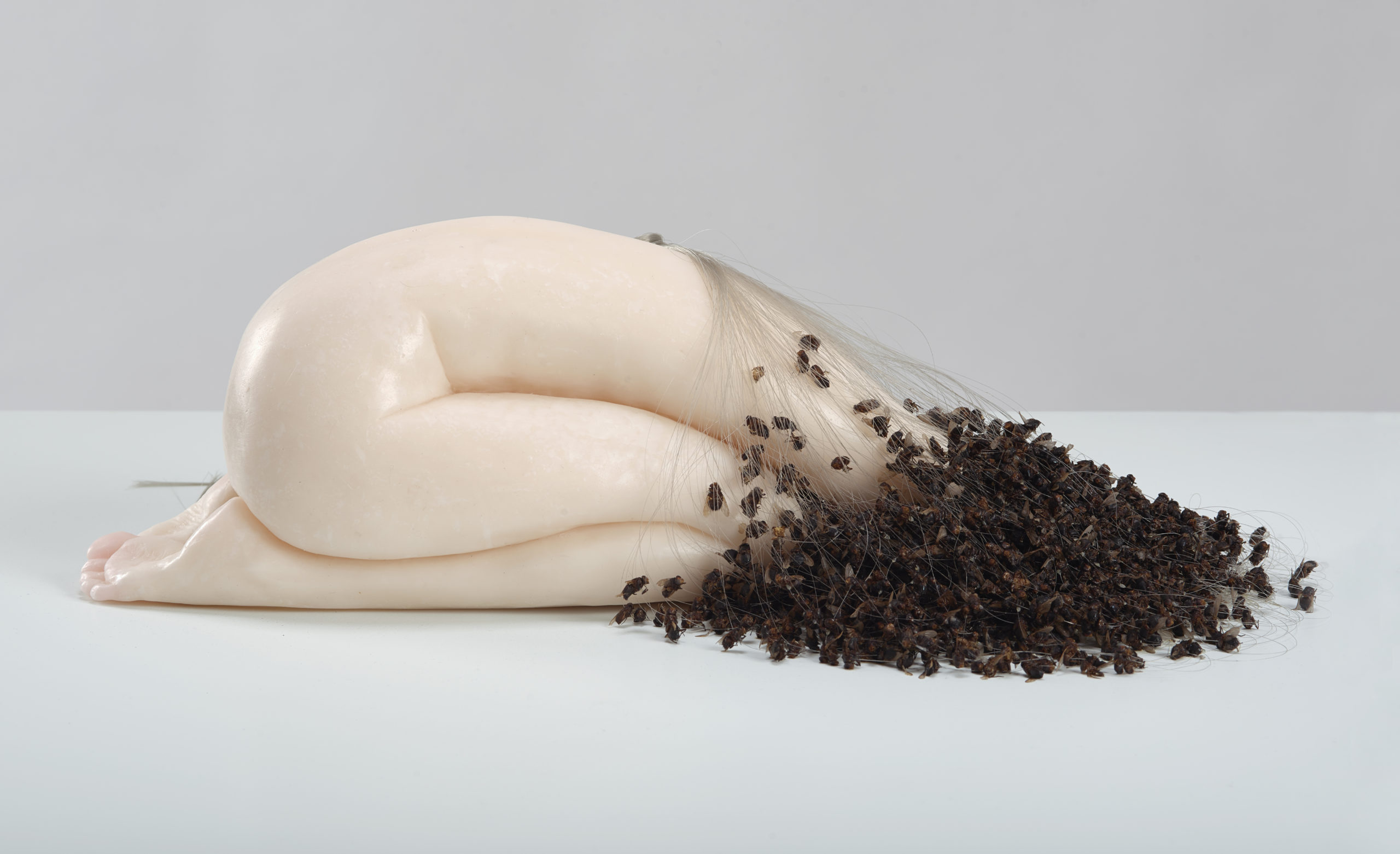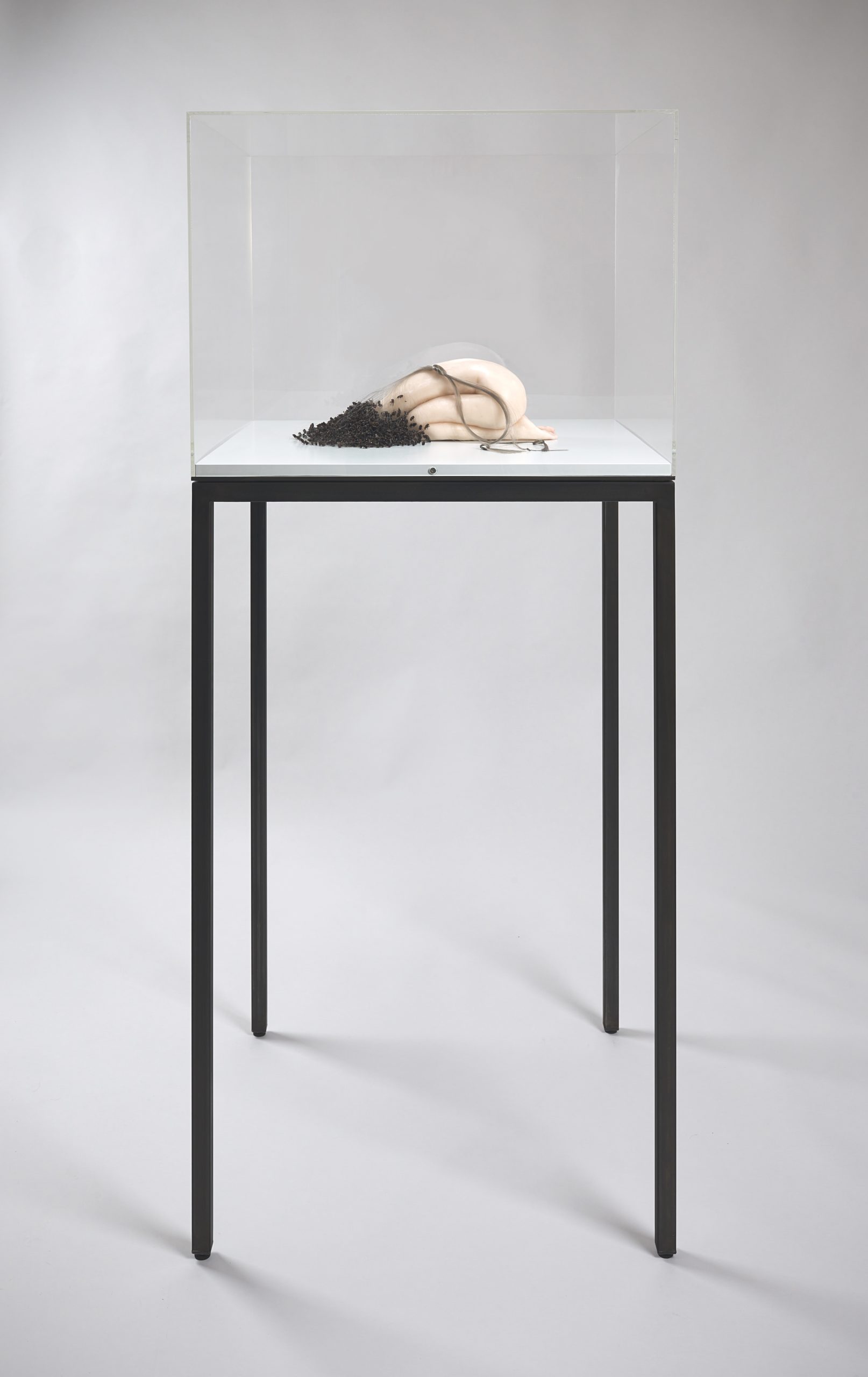 2023, Wax, flies, nylon thread, in vitrine, 176.5 x 73 x 73 cm
