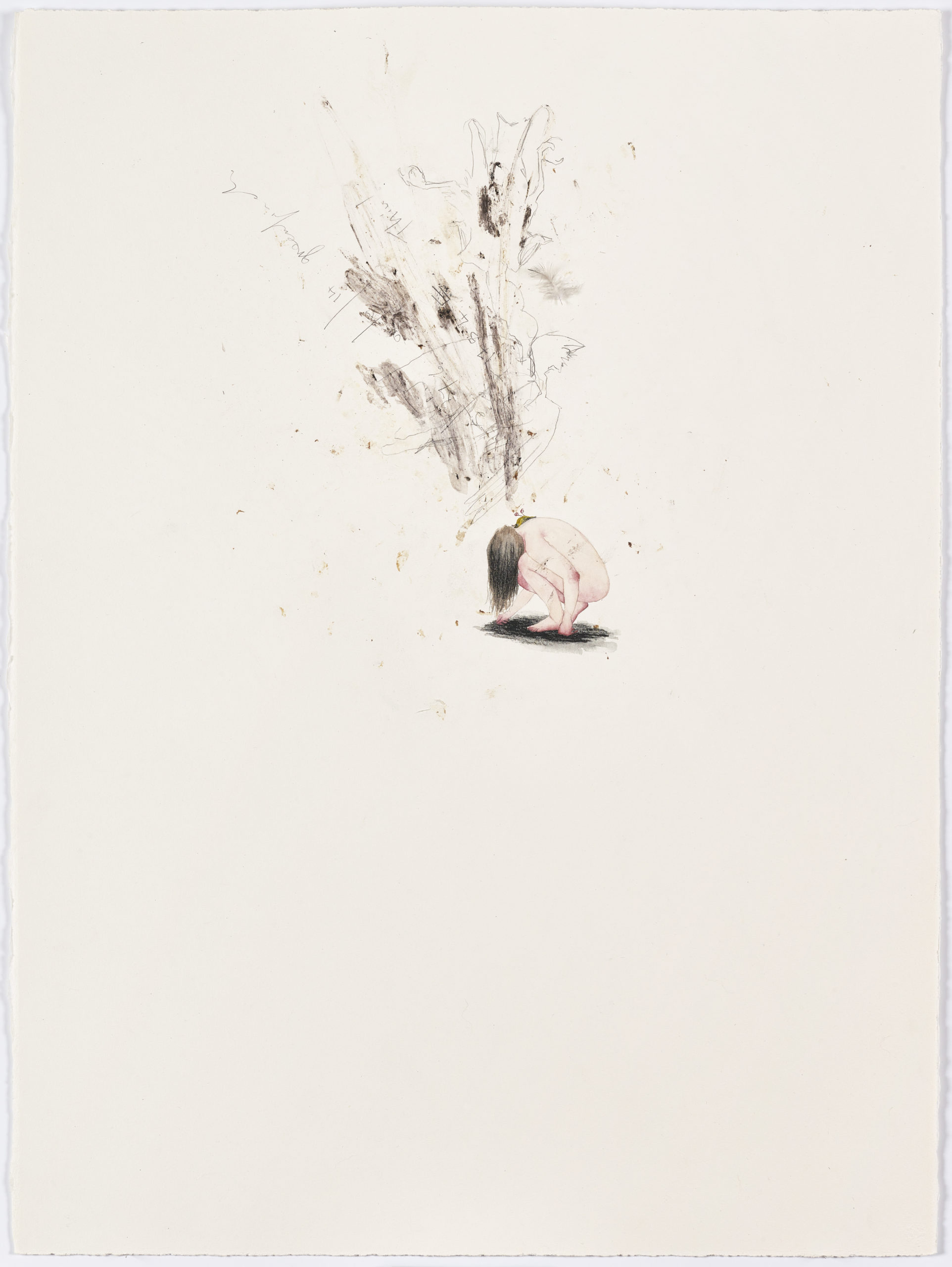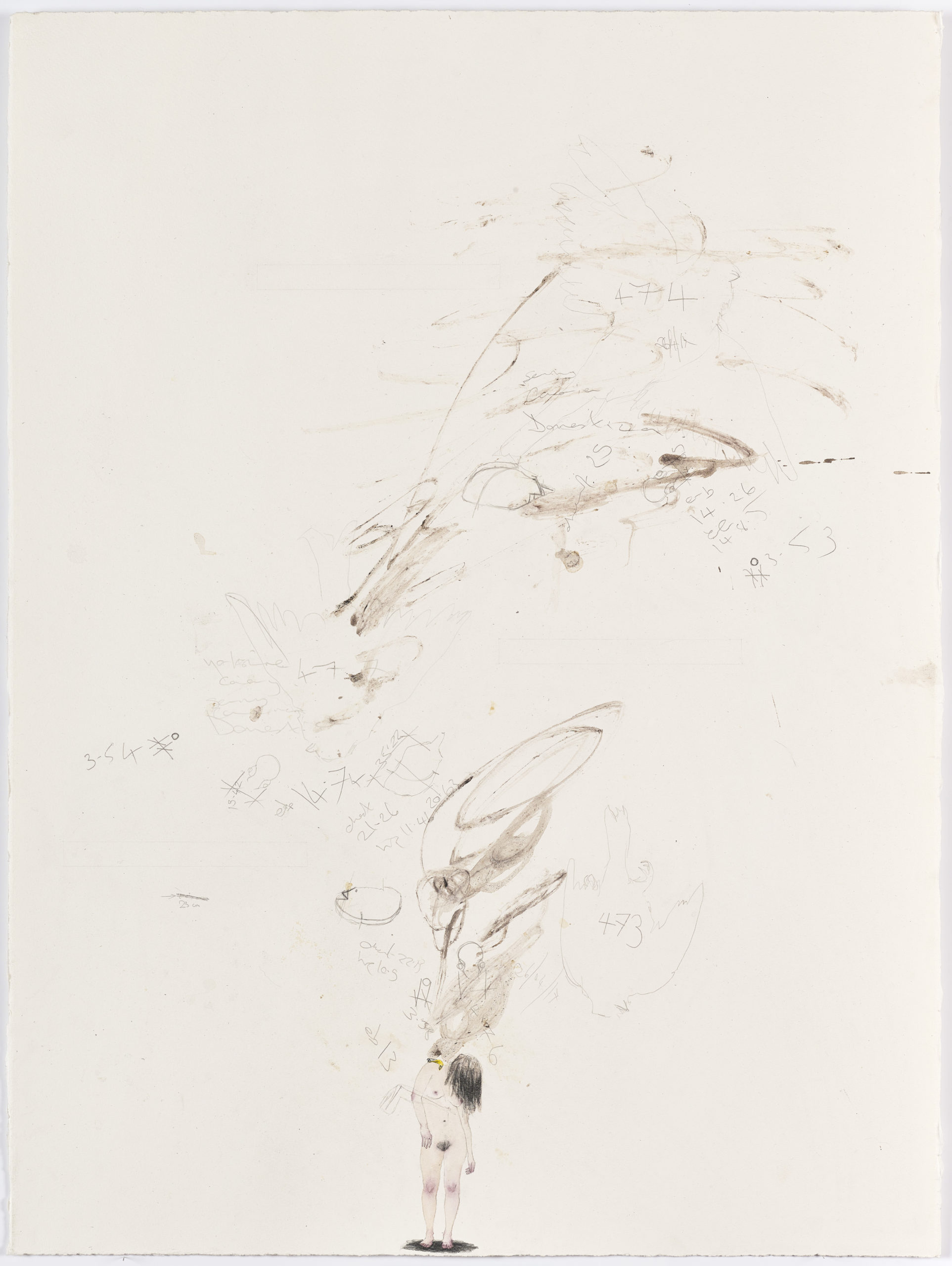 2023, Traces of taxidermy process, feather, watercolour, pastel, pencil, on paper, 76.4 x 57.5 cm