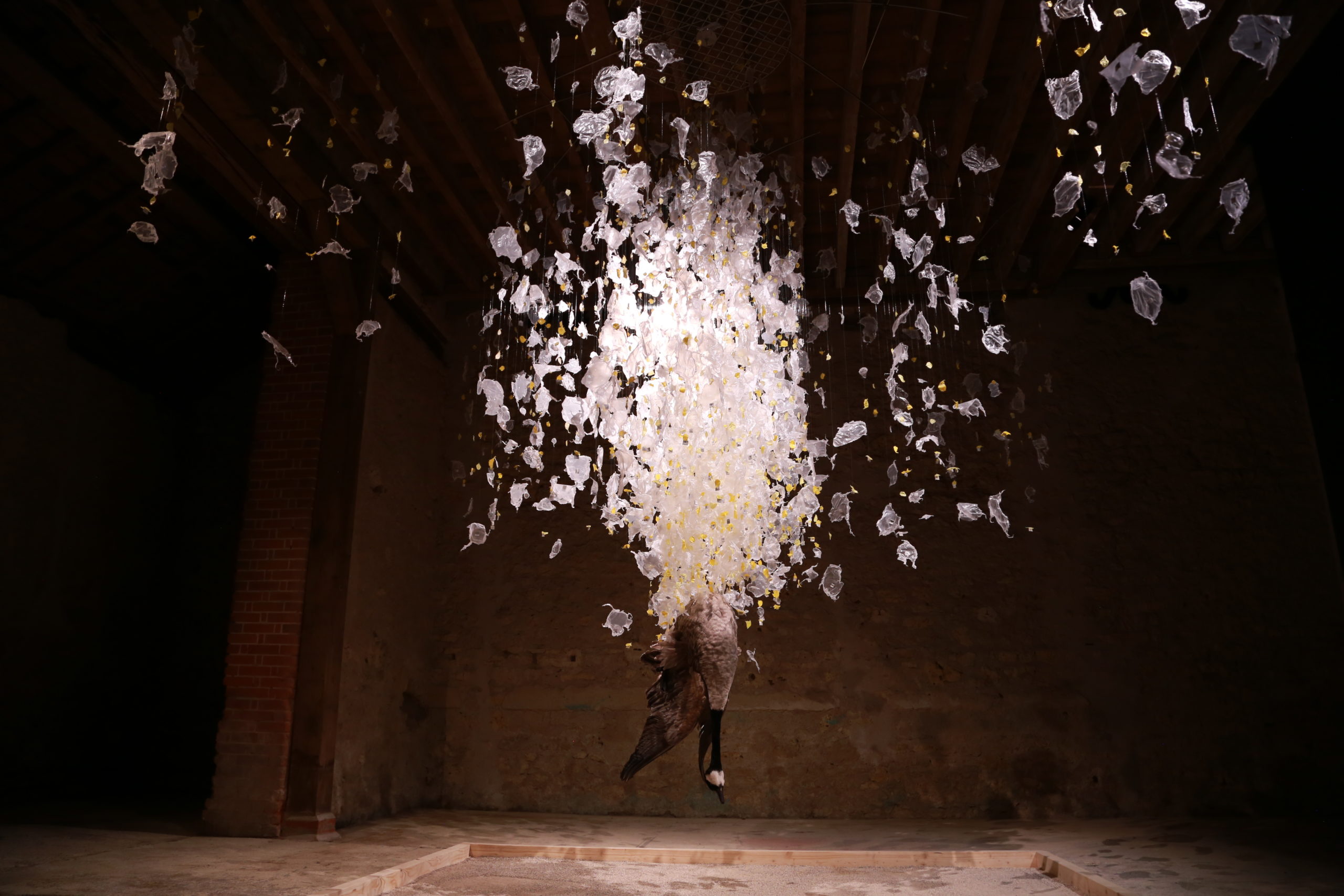 2023, canada goose skin, polythene, nylon, lead, mixed media,