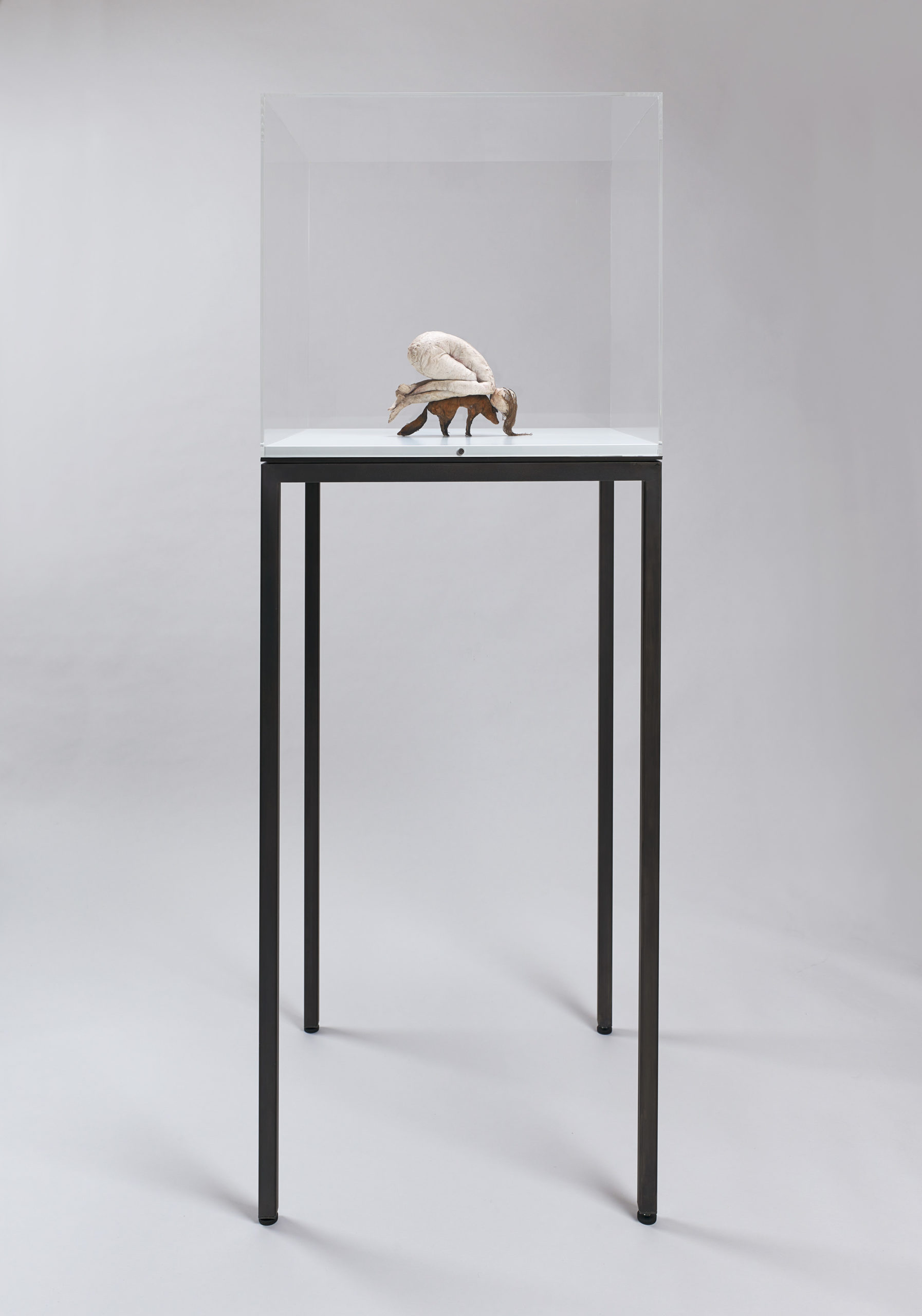 2023, Found textiles, fox skin, mixed media, in vitrine, 186.5 x 71 x 71 cm