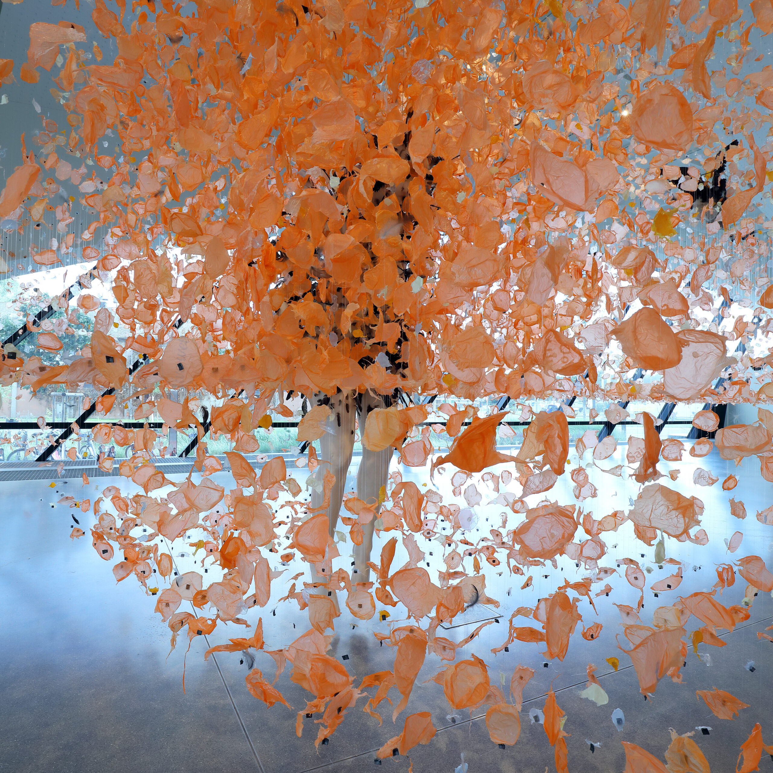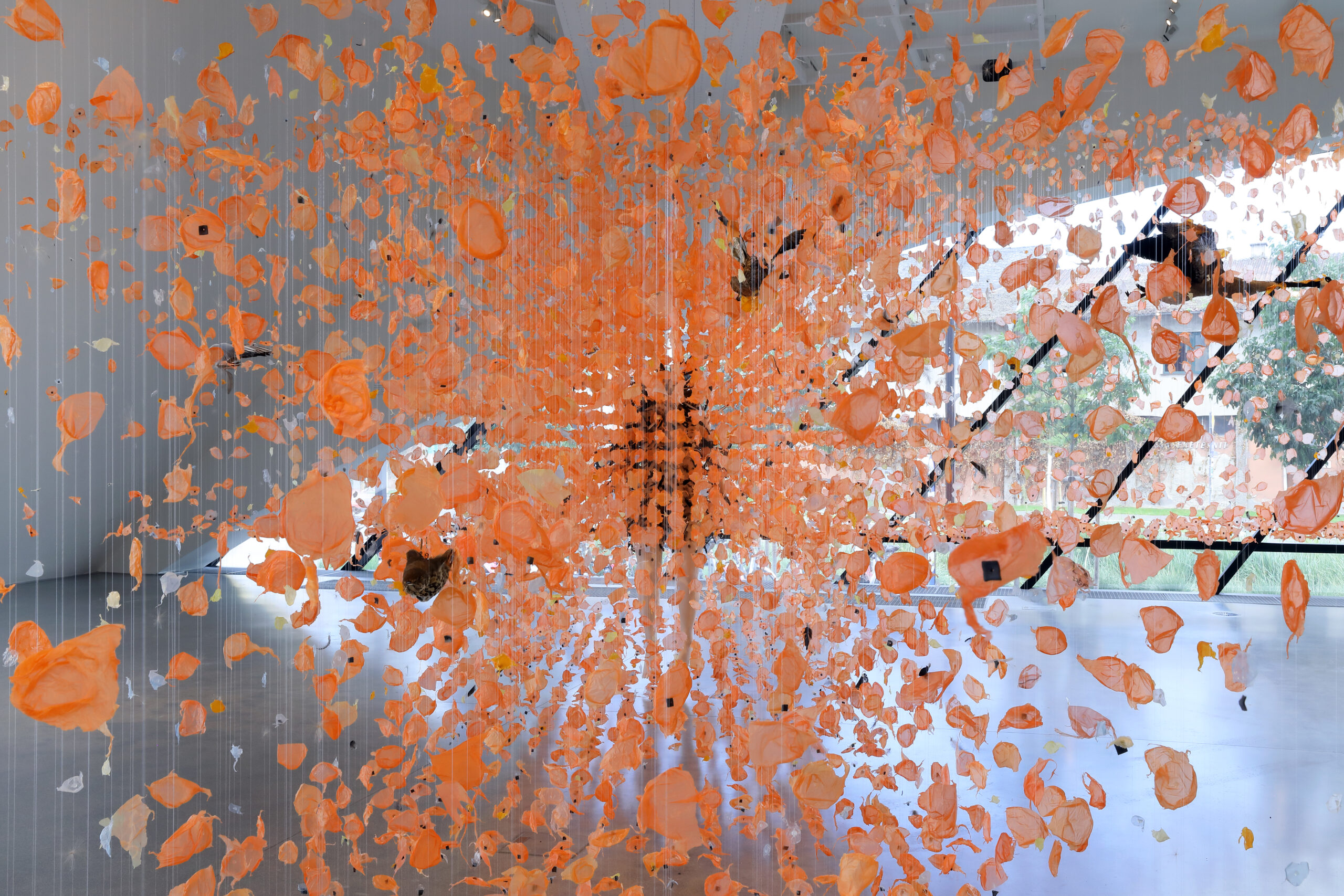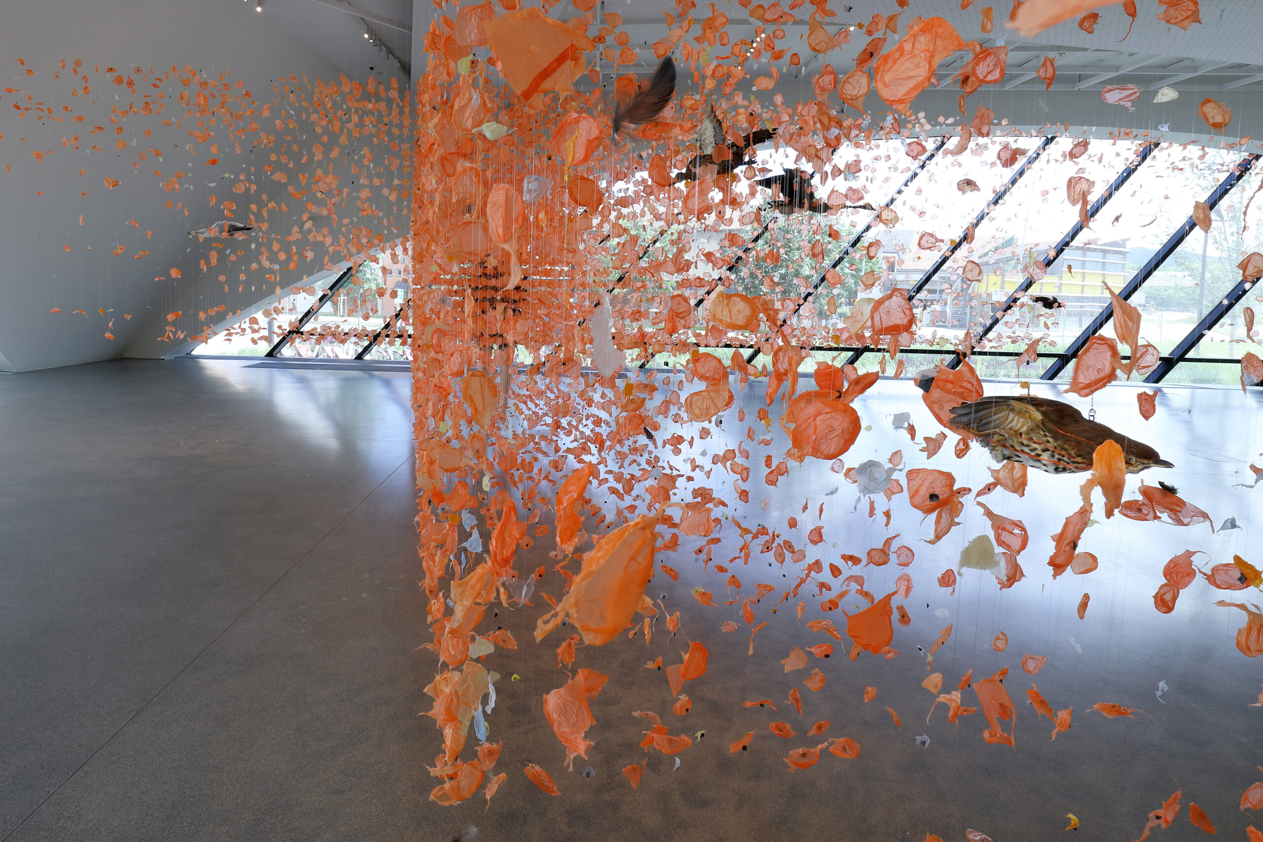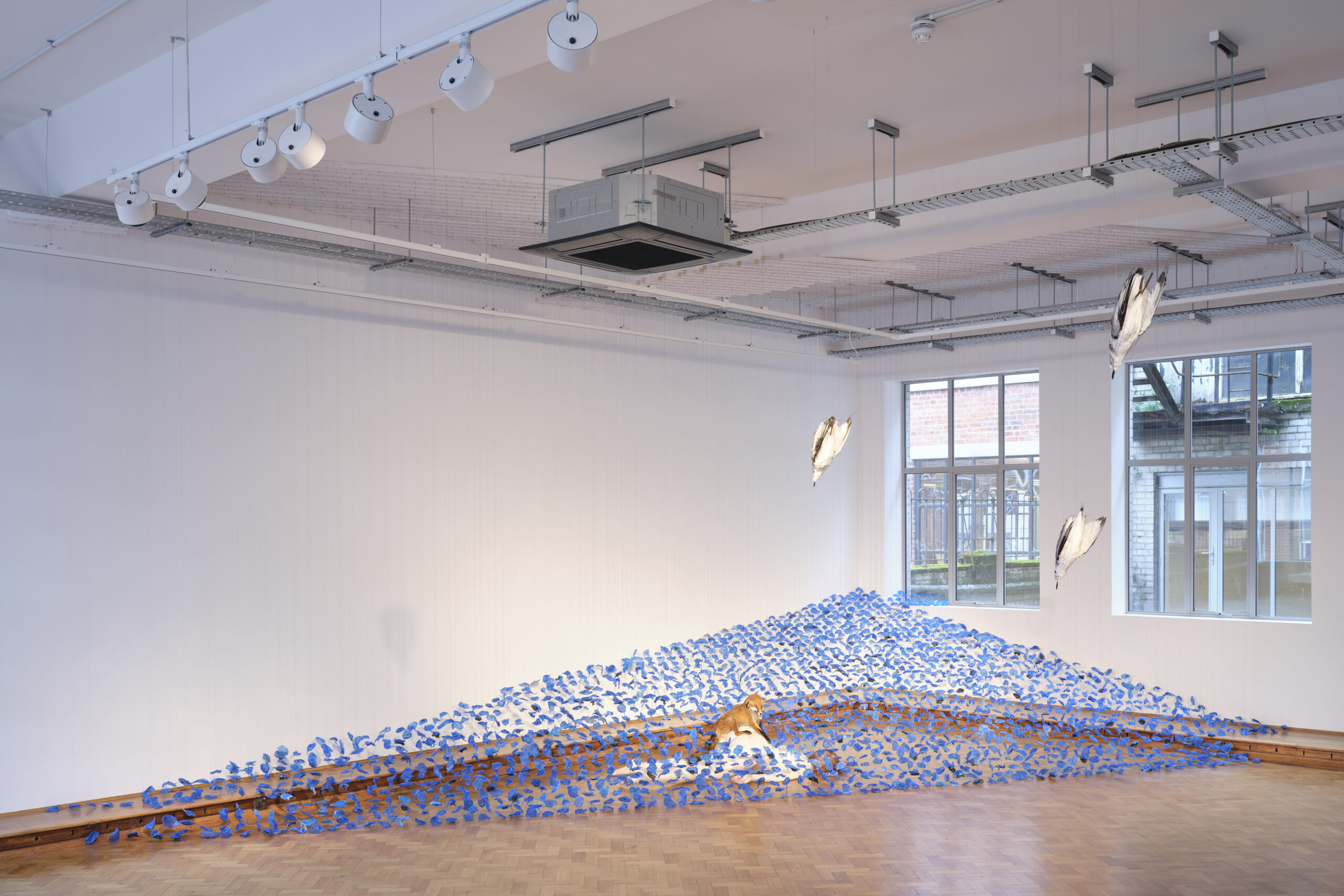 2024, Bird skins, feathers, thistle seeds, Polythene, nylon, lead, wax, mixed media, 440 x 2000 x 2000 cm