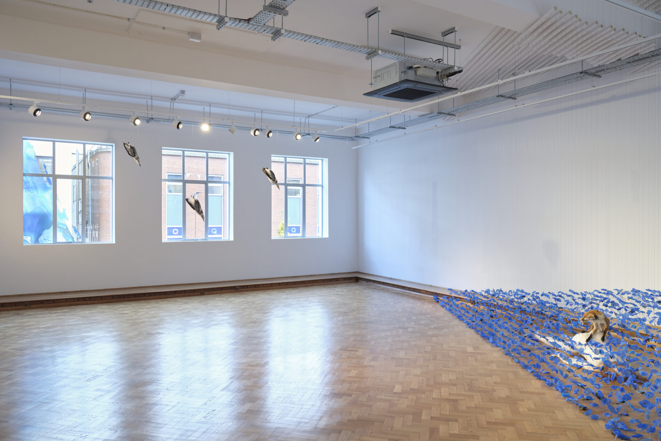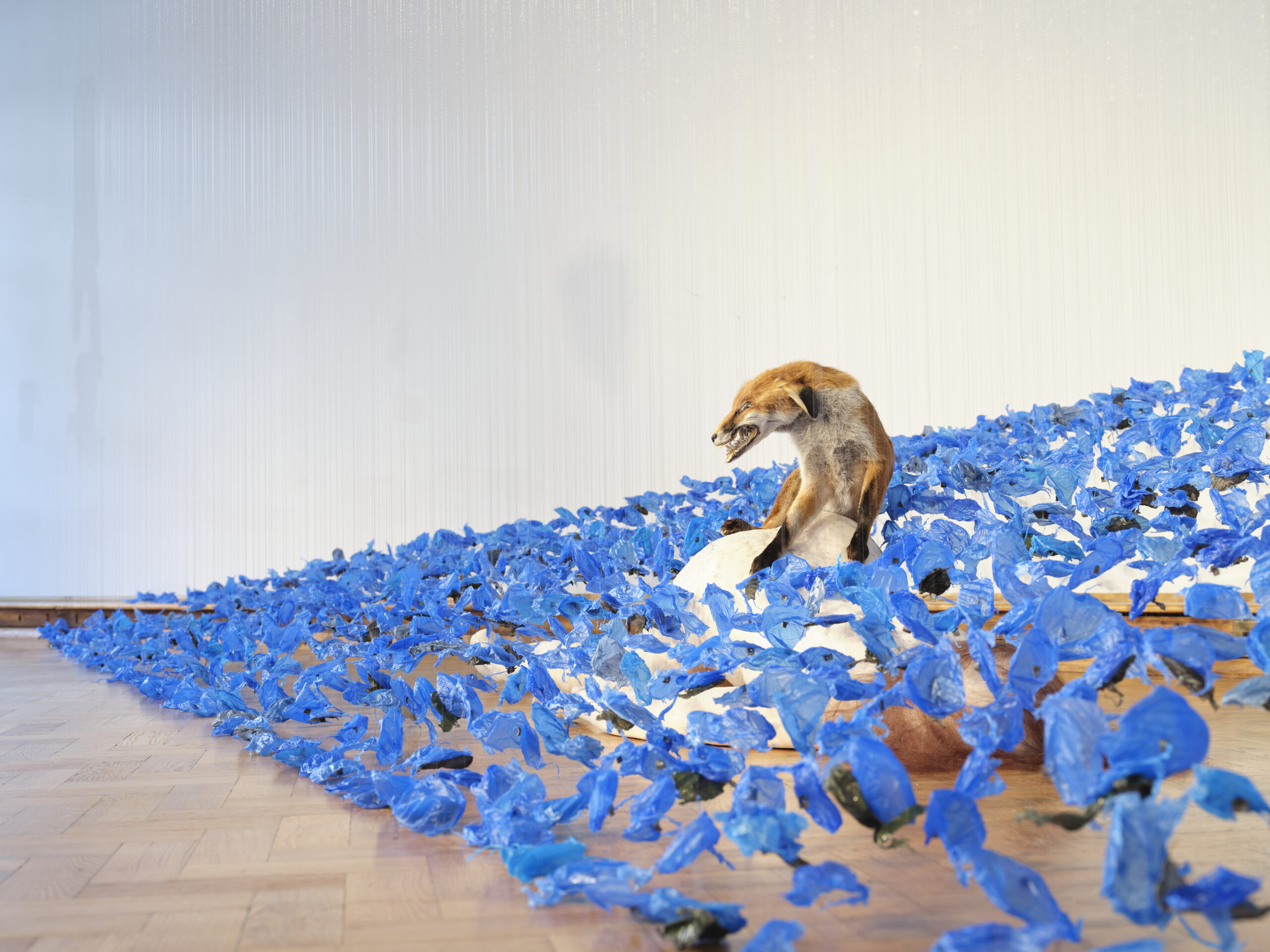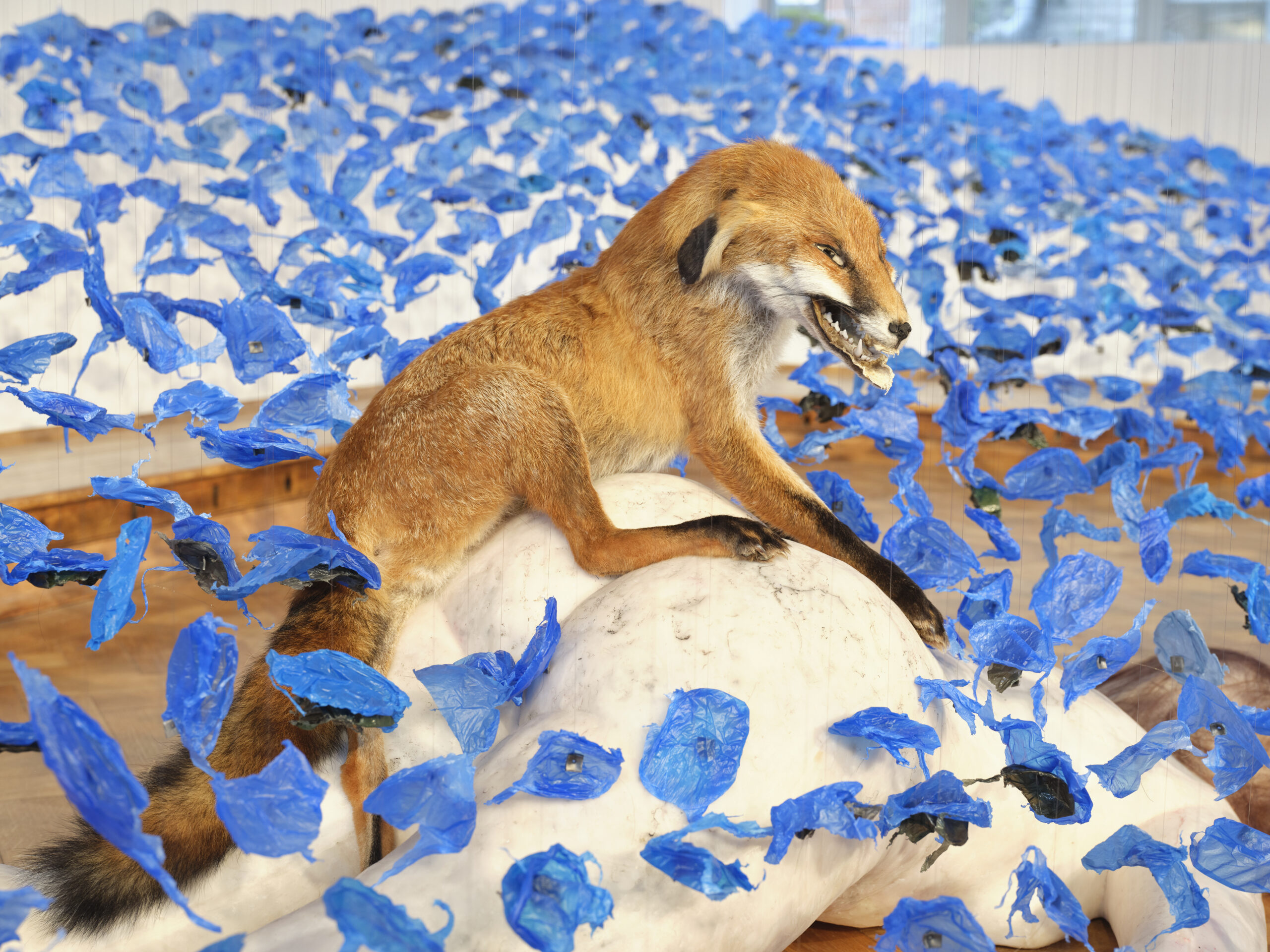 2024, Bird skins, fox skin, polythene, nylon, lead, wax, mixed media, 407 x 1146 x 1175 cm