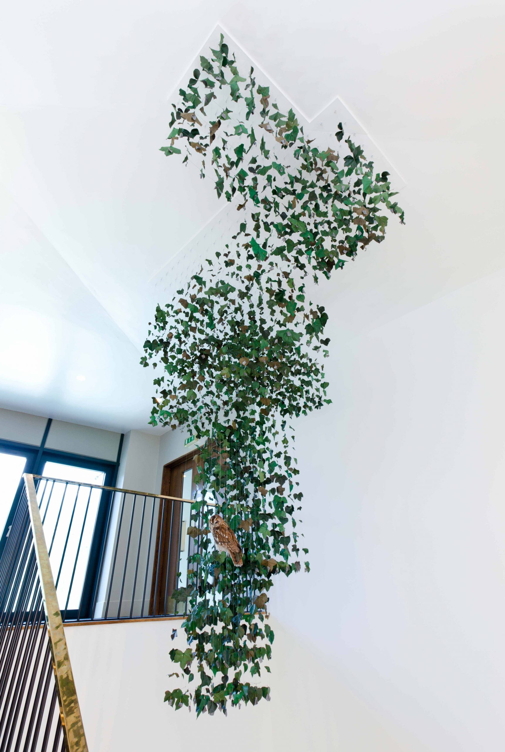 Tawny owl (taxidermy), preserved ivy leaves, stainless steel, brass, 350 x 240 x 200 cm, 2010
