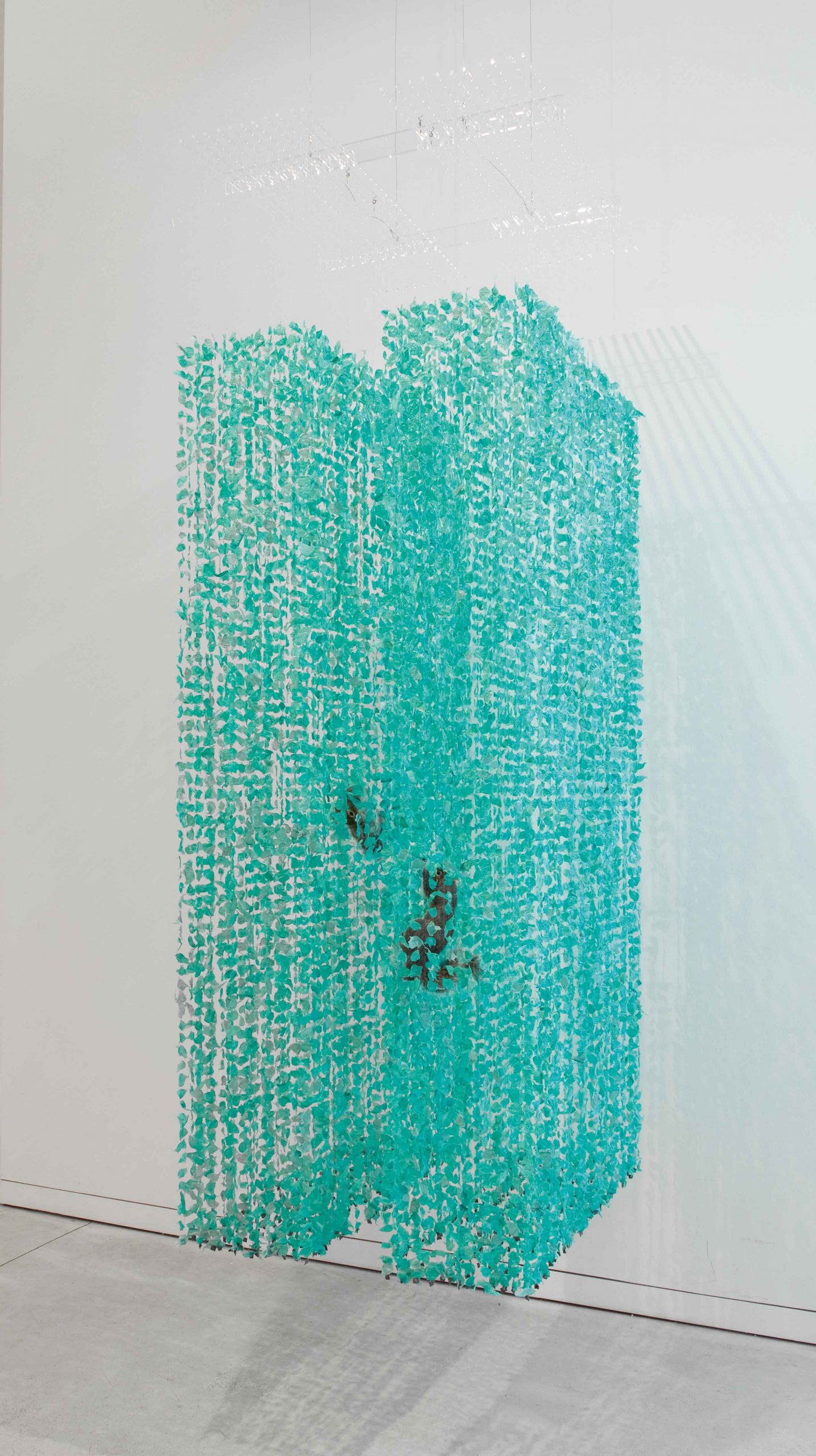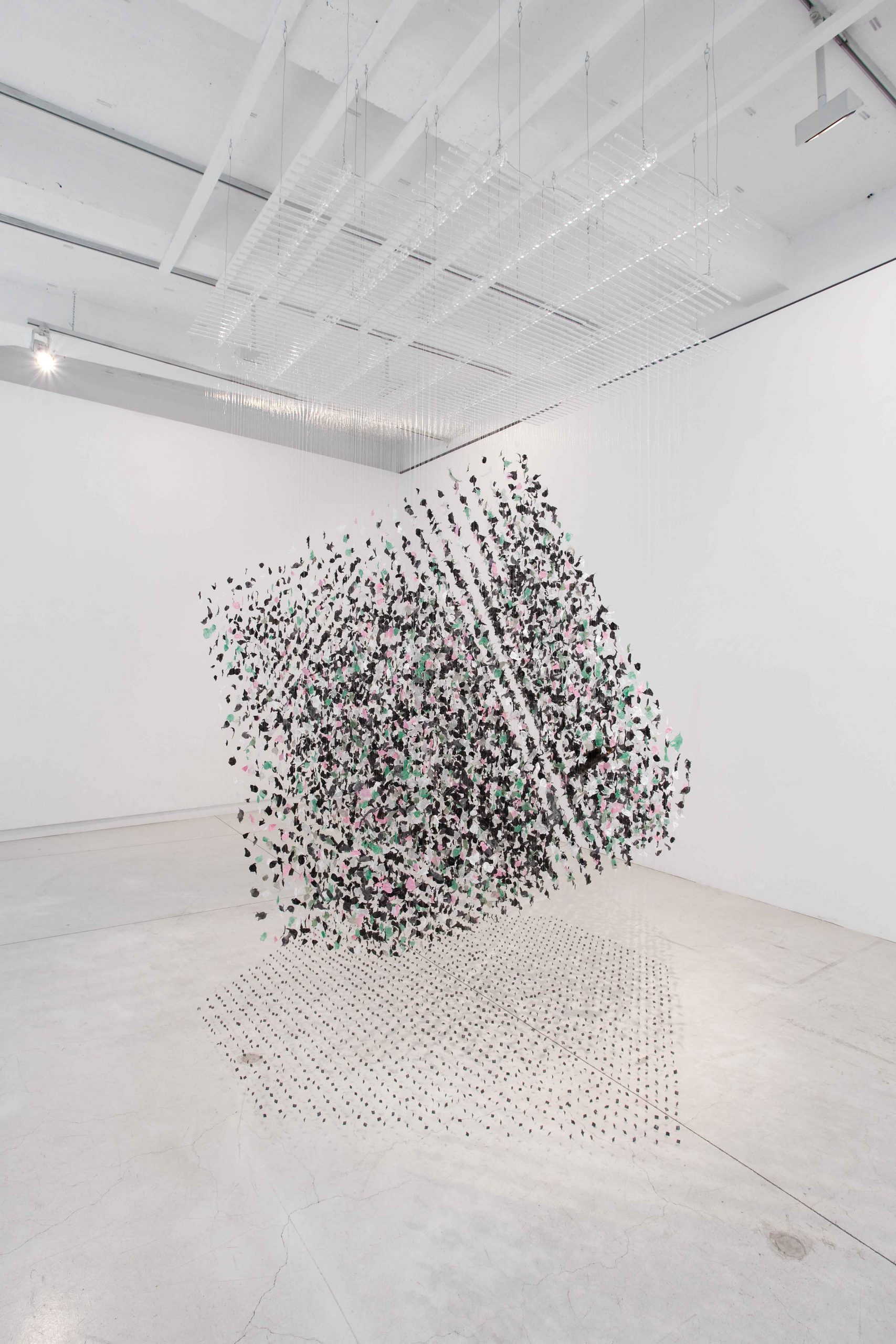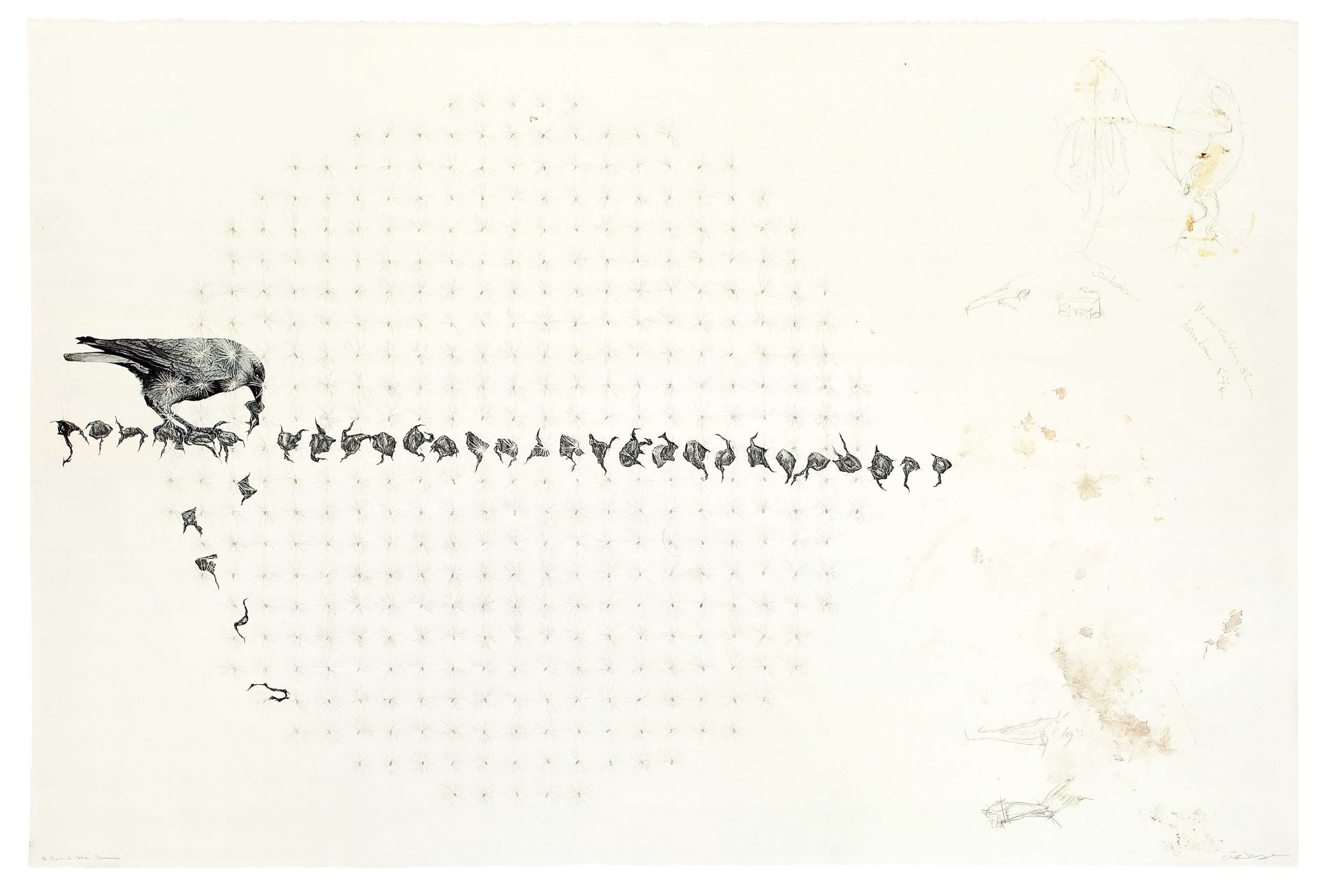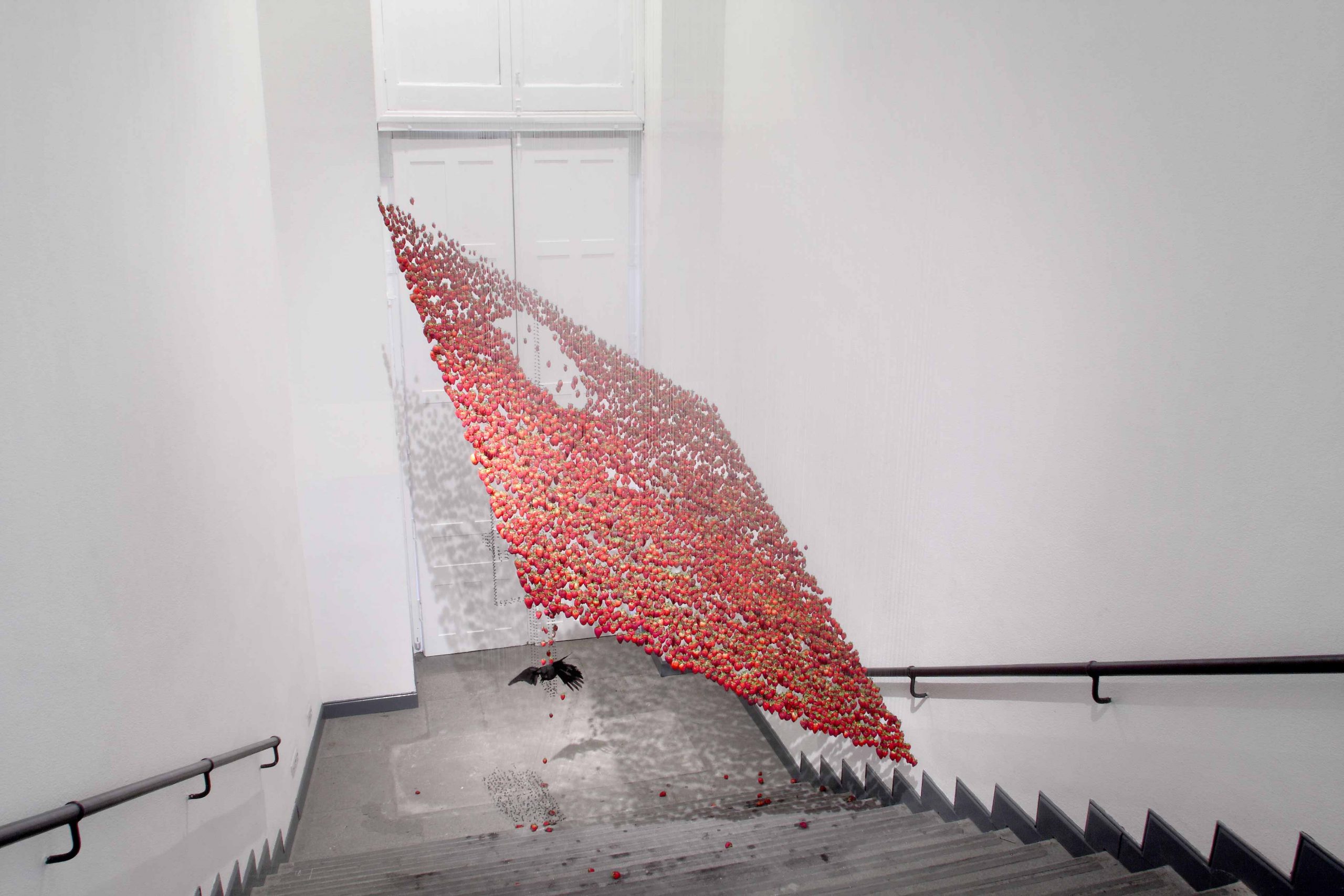 2010, Thistle seeds, rooks (taxidermy) , nylon, lead, acrylic, 300 x 180 x 180 cm