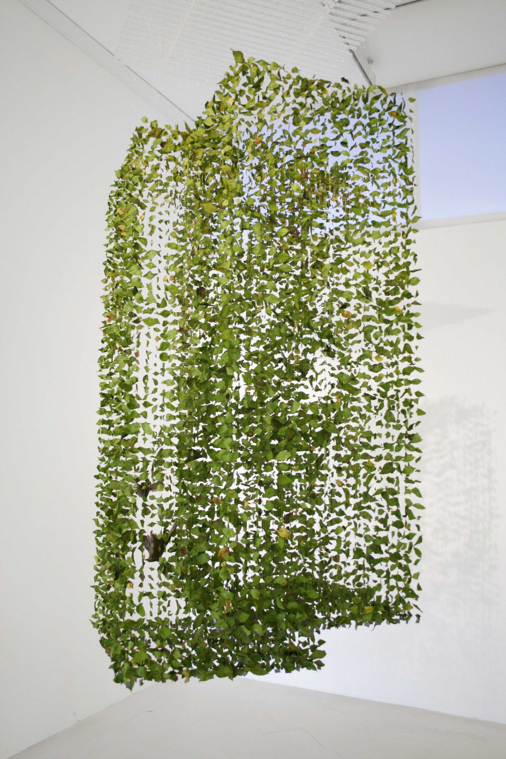 Dunnocks (taxidermy), privet leaves, lead, nylon, acrylic, 220 x 80 x 80 cm, 2010