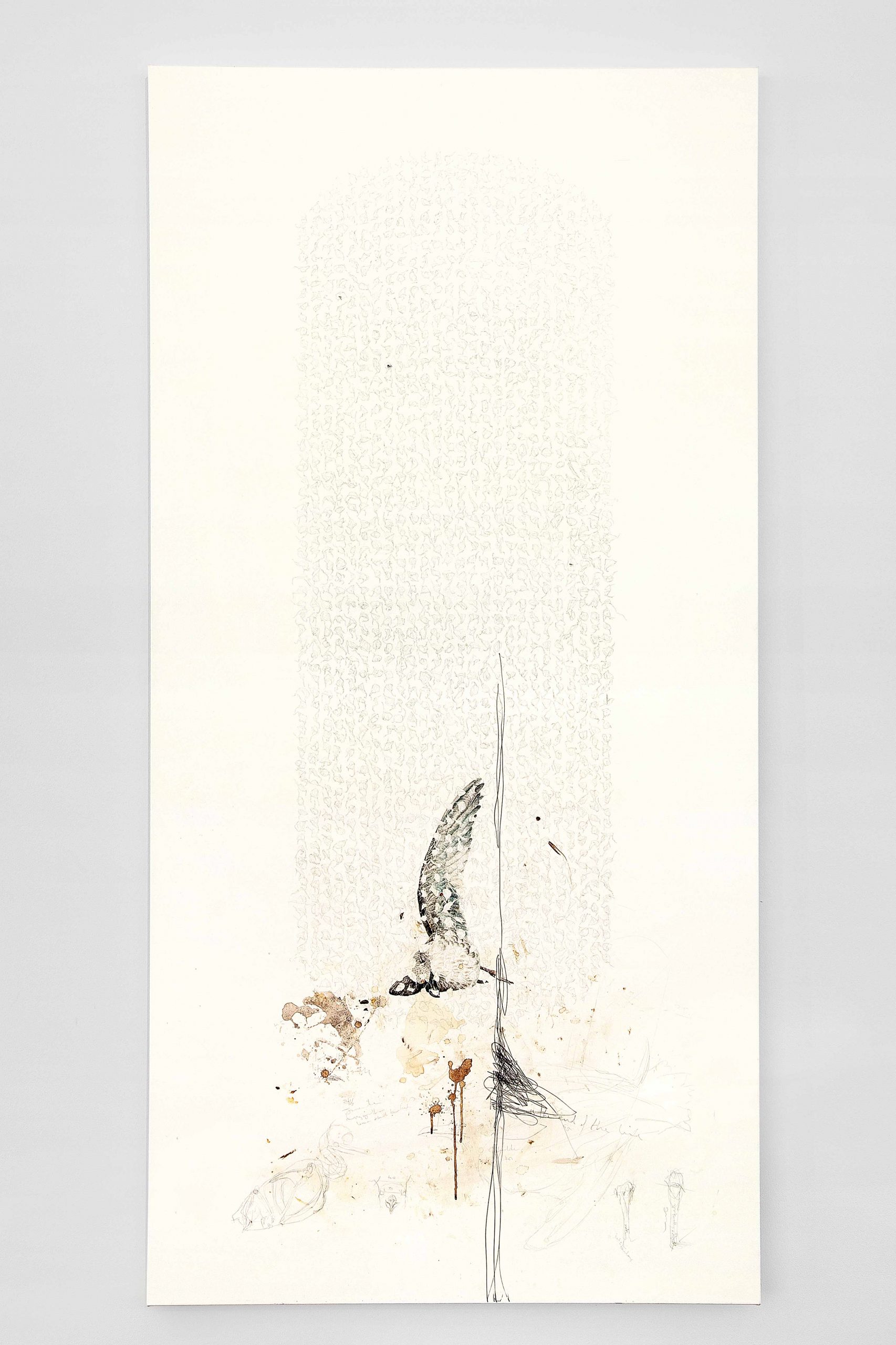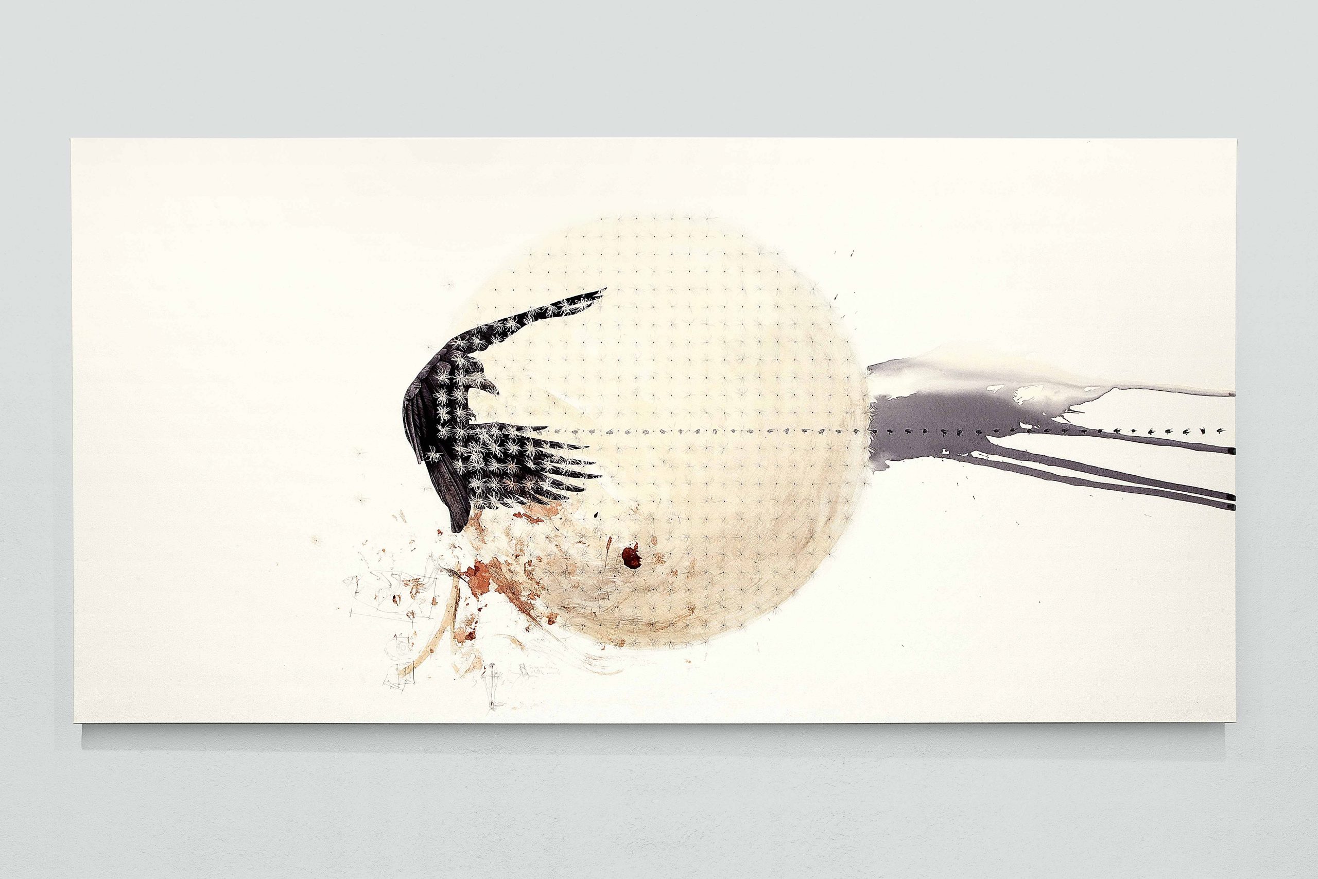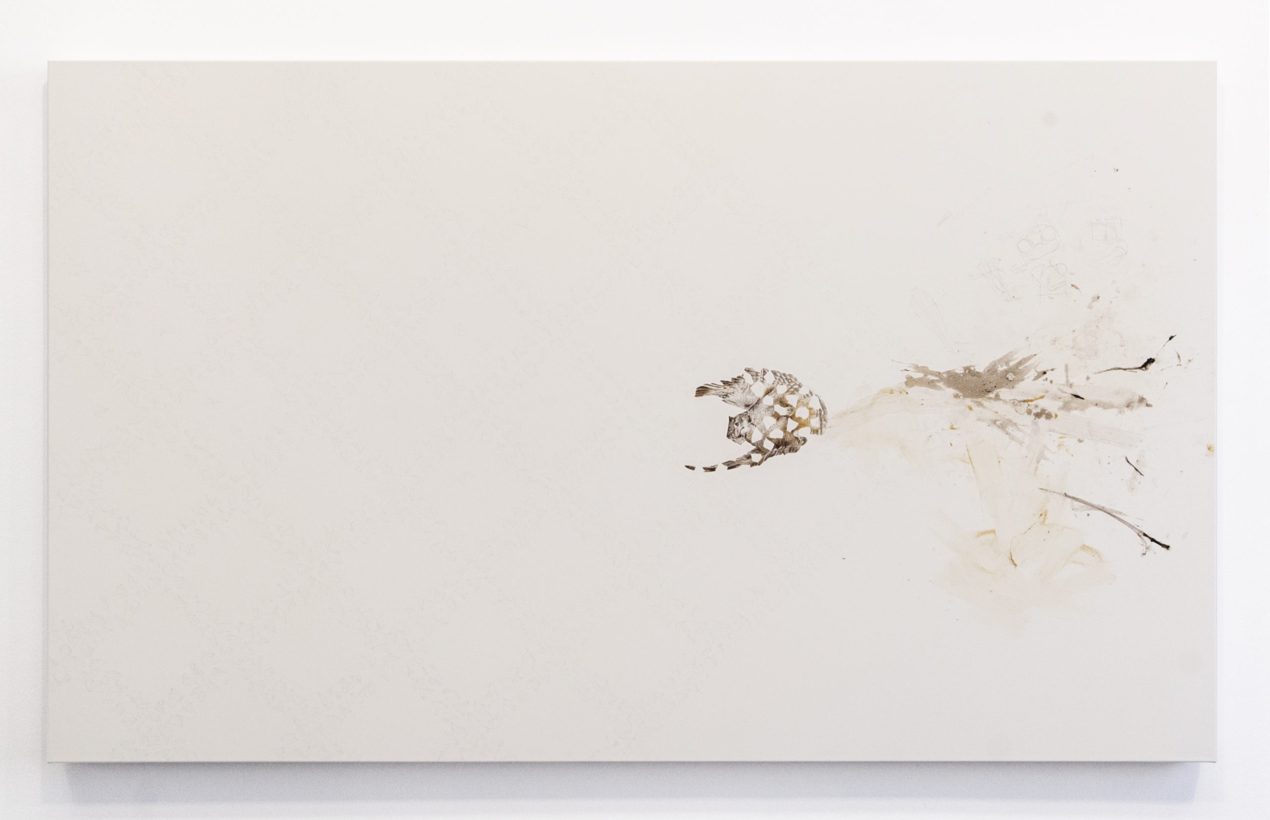 Pencil, watercolour, residues of the taxidermy process on canvas, 120 x 200 cm, 2012