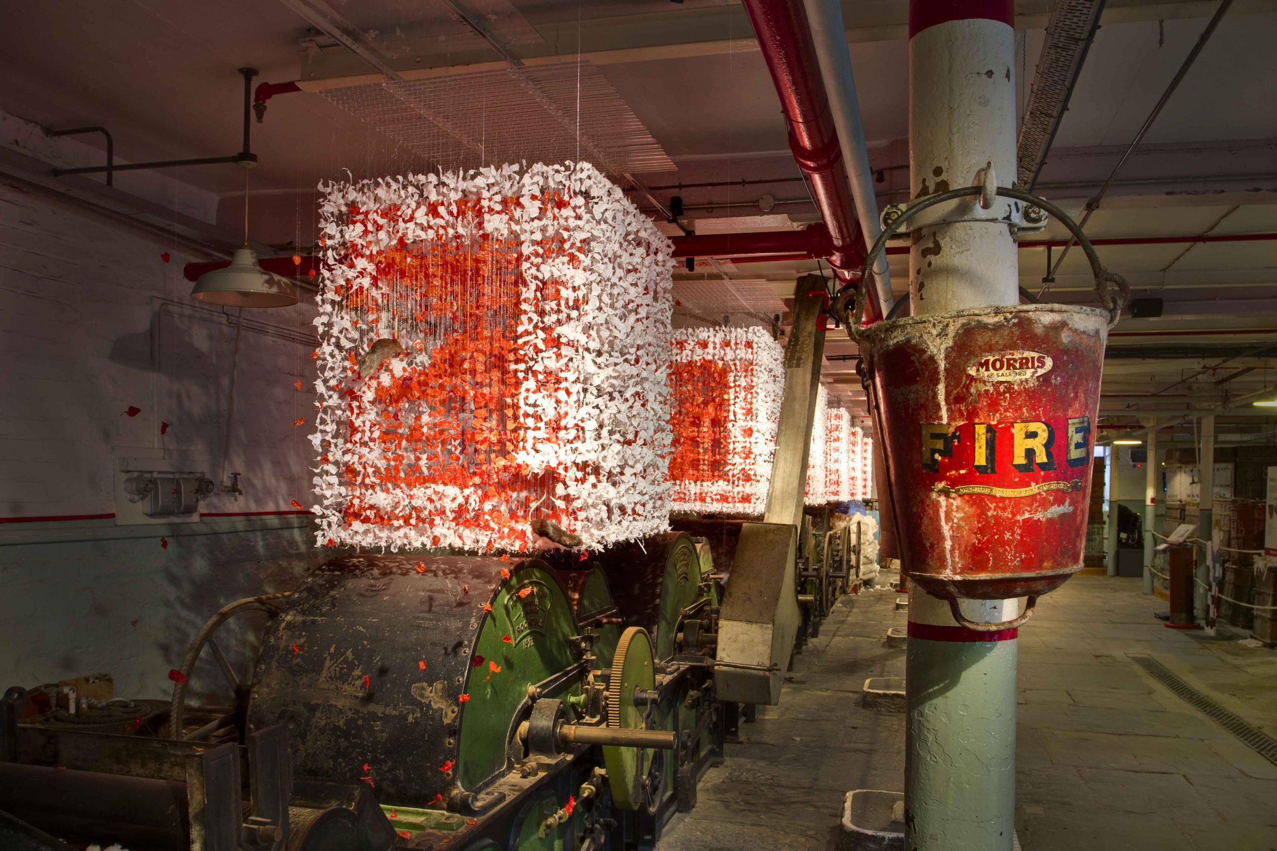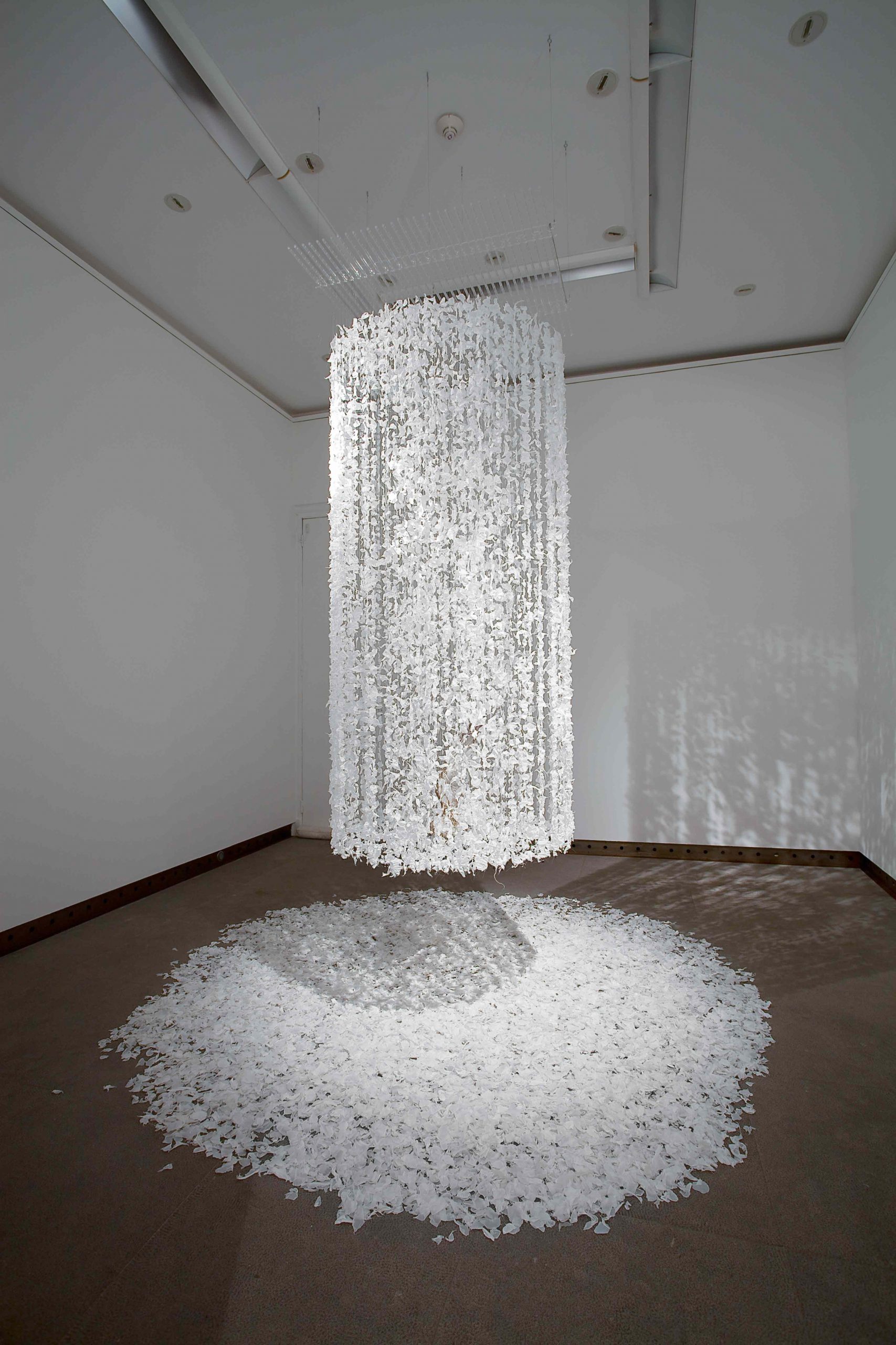 Juvenile herring gull (taxidermy), torn polythene, nylon, lead, acrylic, 250 x 99 x 99 cm, 2012