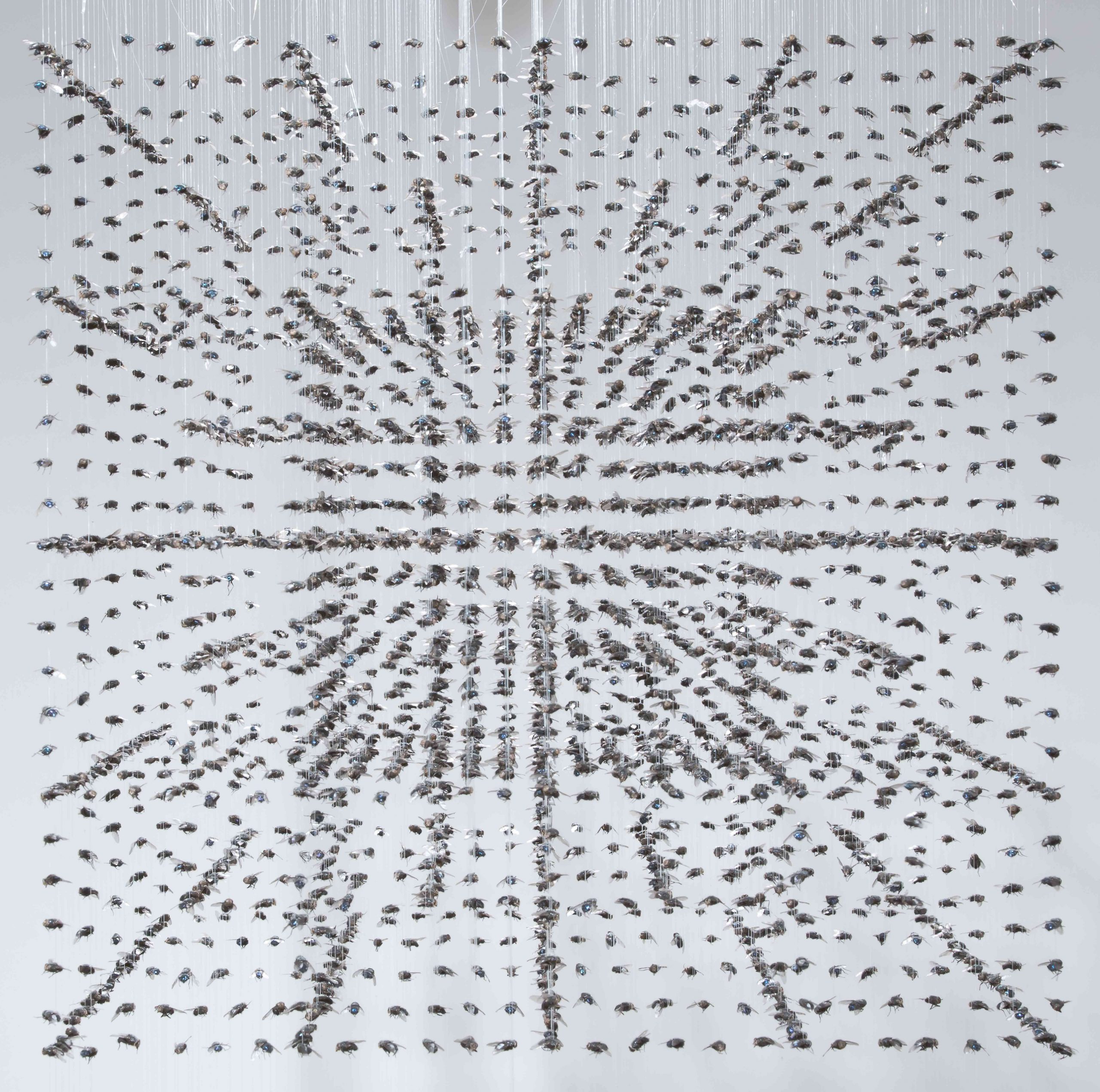 Honey bees, blackbirds (taxidermy), saffron plant pigment, nylon, lead, acrylic, 240 x 84 x 84 cm, 2012