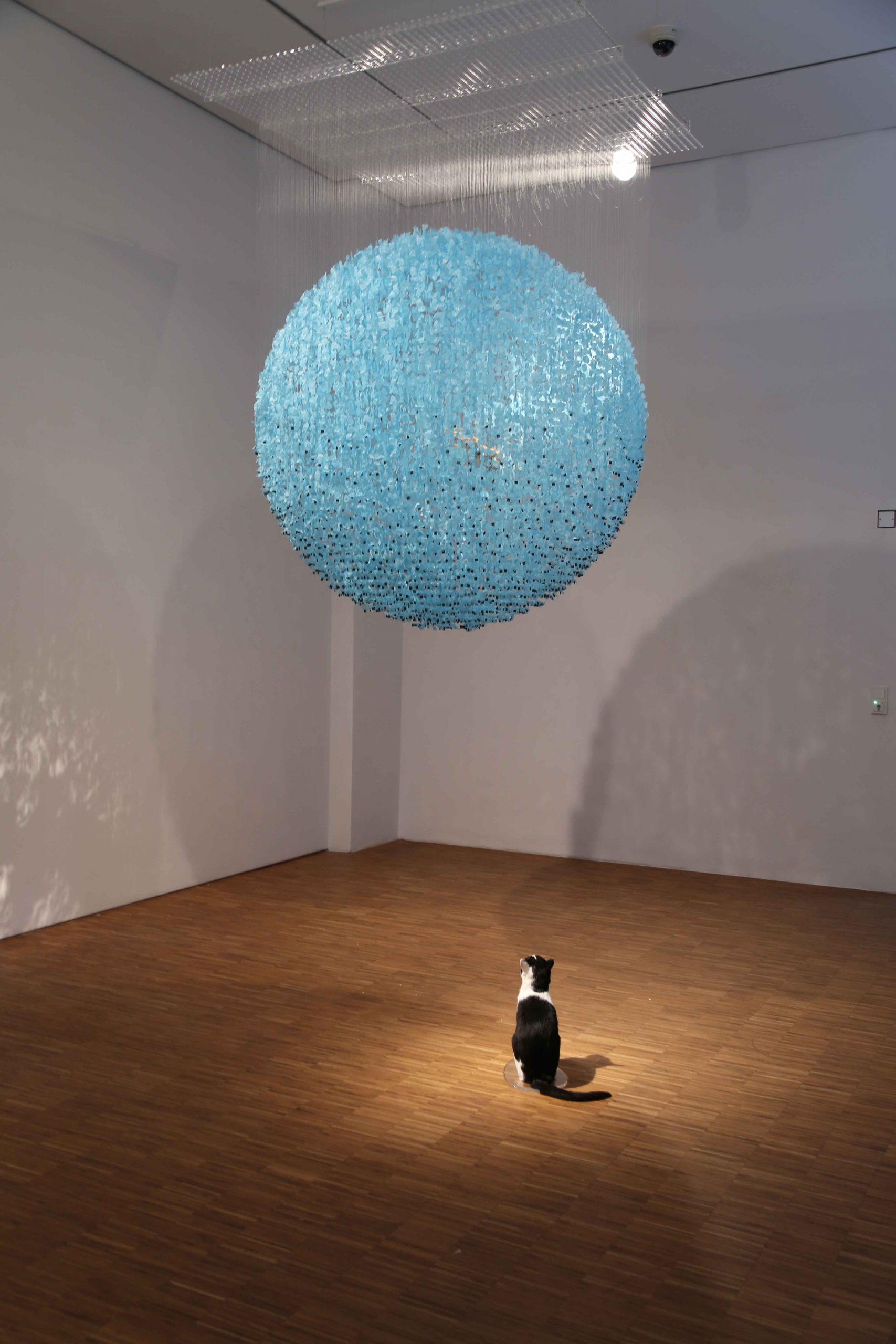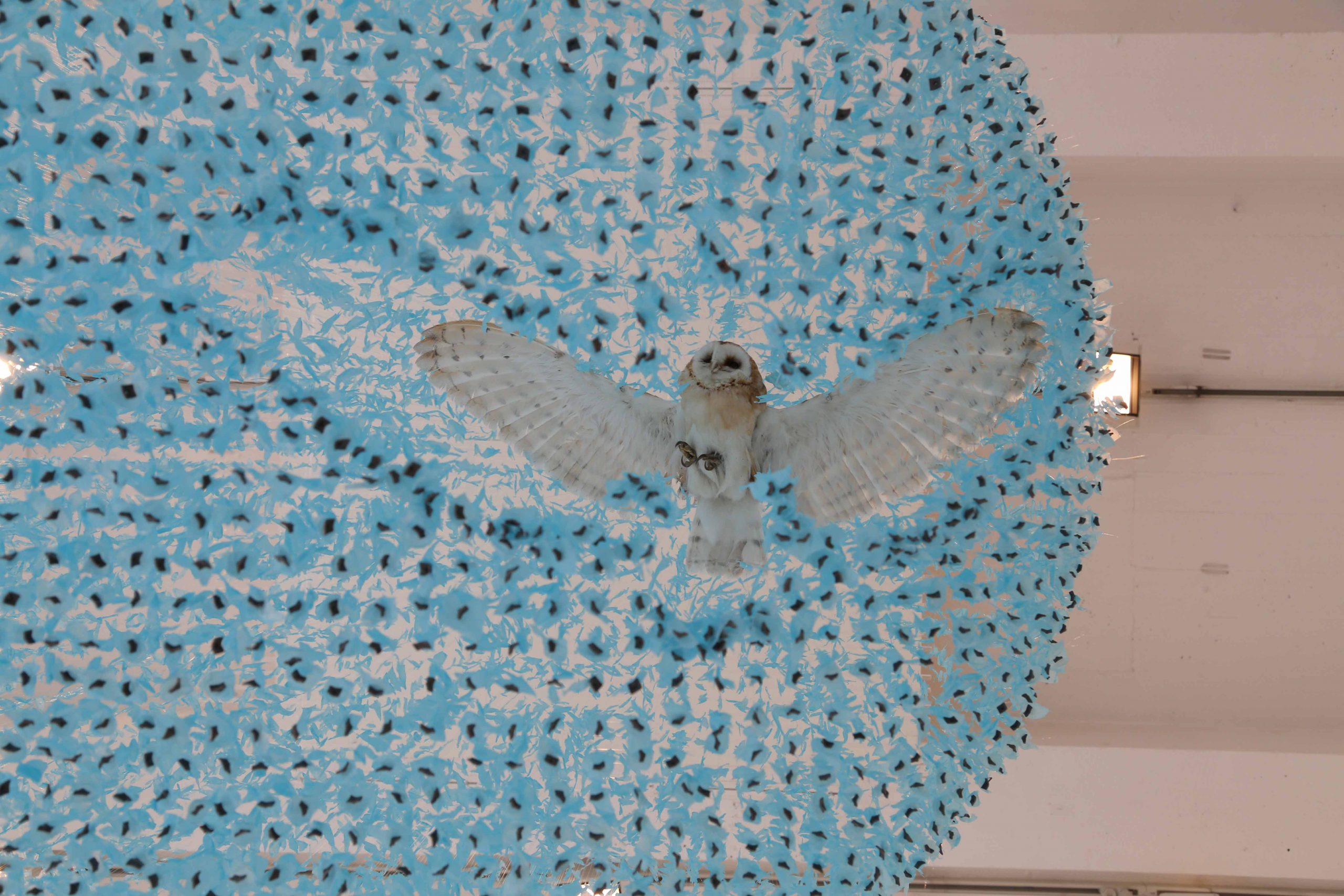 Barn owl and domestic cat (taxidermy), torn pale blue polythene, nylon, lead, 300 x 150 x 150 cm, 2014