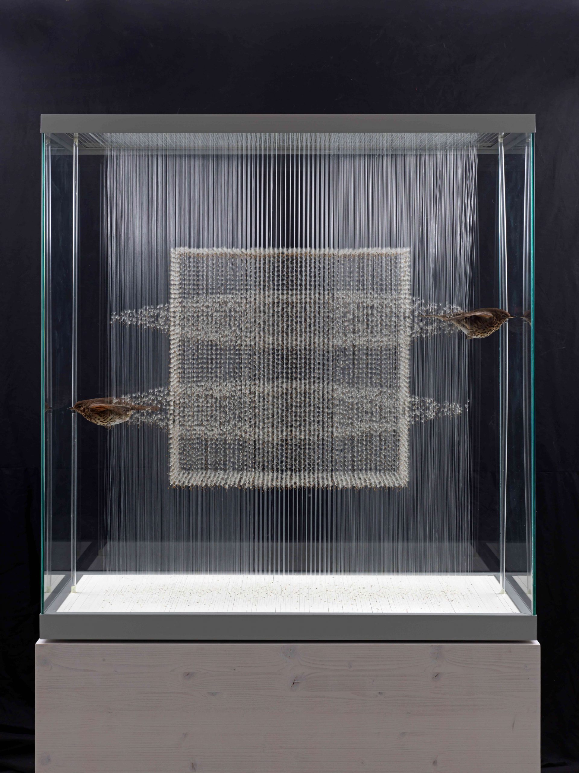 Two thrushes (taxidermy), dandelion seeds, nylon in vitrine, 108.4 x 101.6 x 101.6 cm, 2014