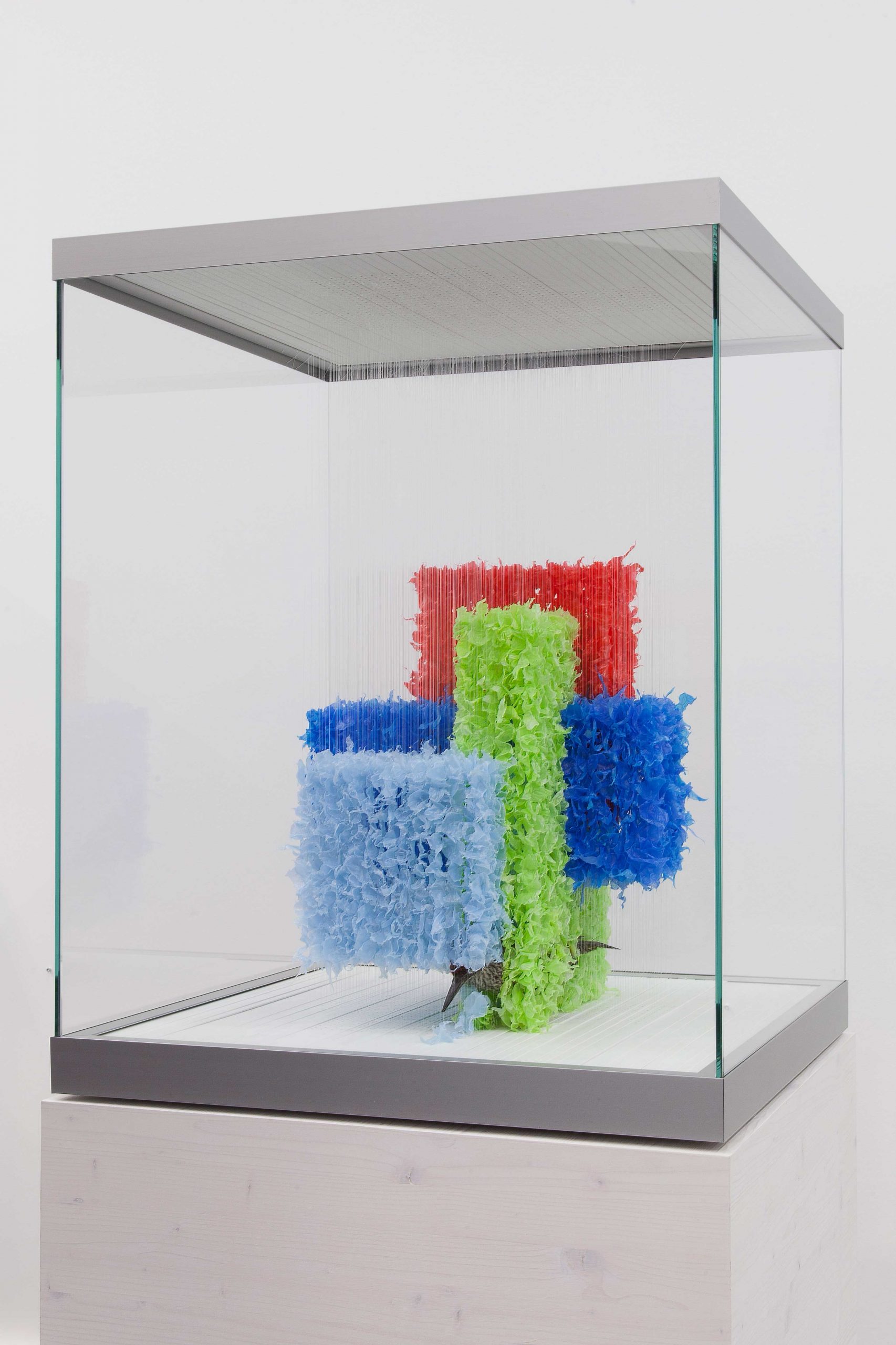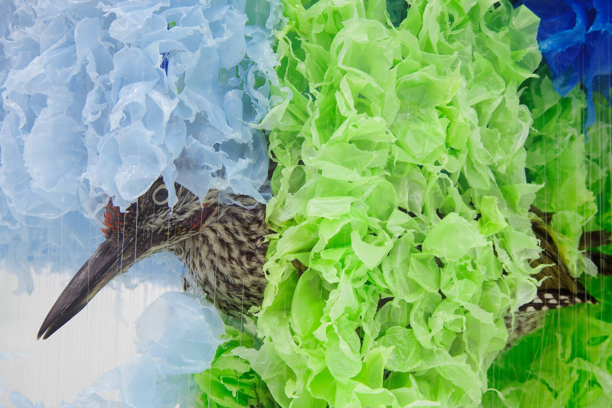 Woodpecker (taxidermy) torn polythene, nylon in vitrine; 78.4 x 61.6 x 61.6 cm, 2014