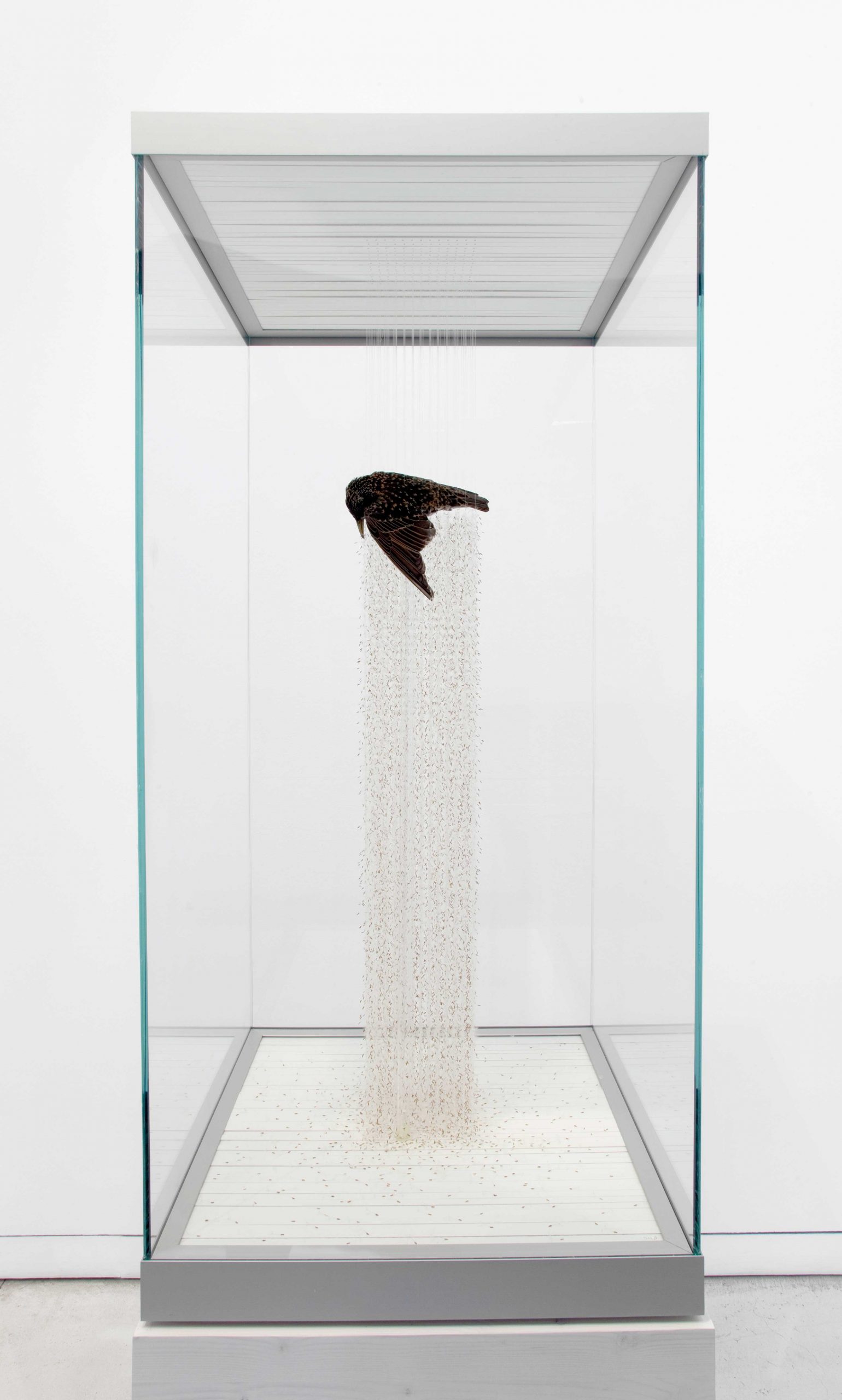 Starling (taxidermy) dandelion seeds, nylon in vitrine, 108.4 x 51.6 x 51.6 cm, 2014