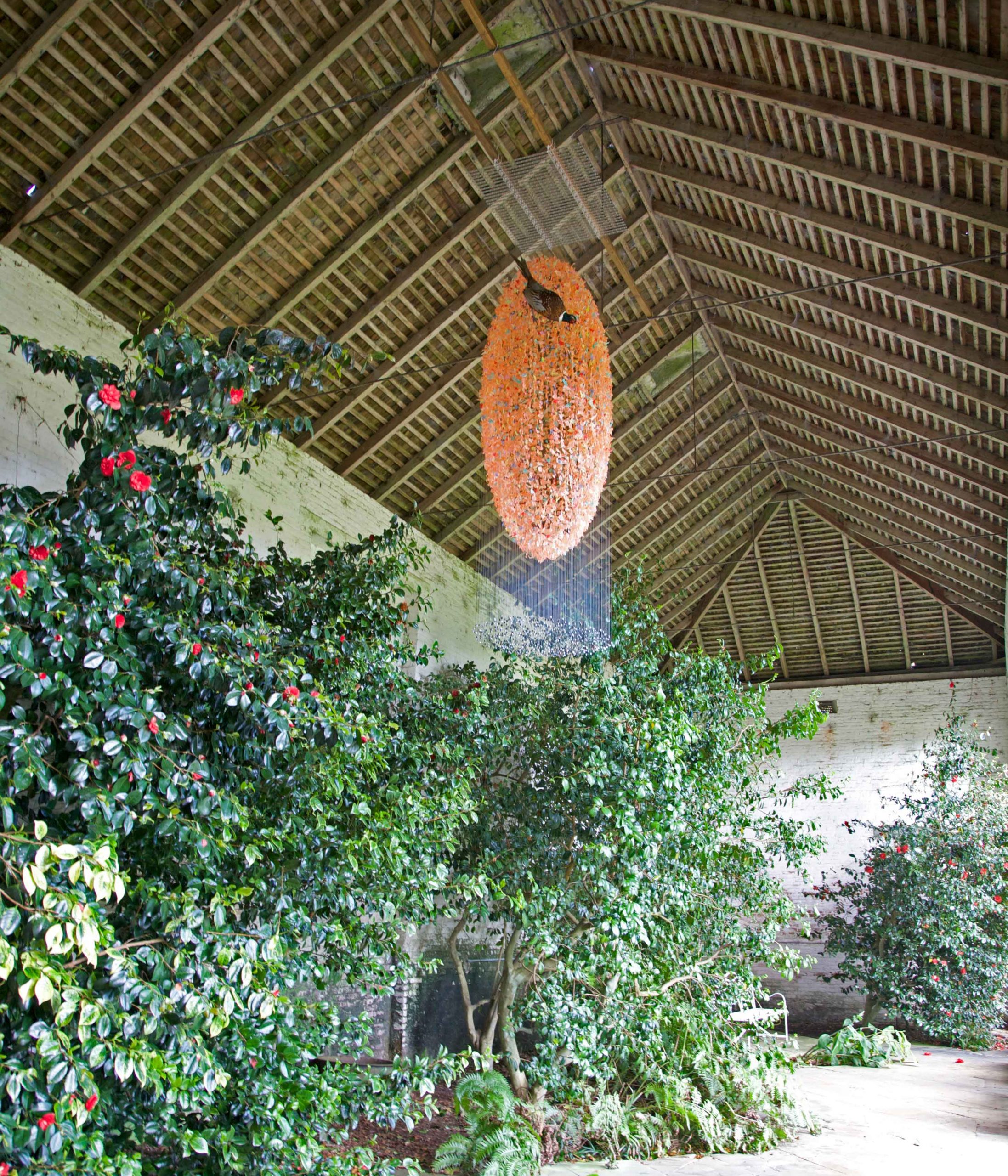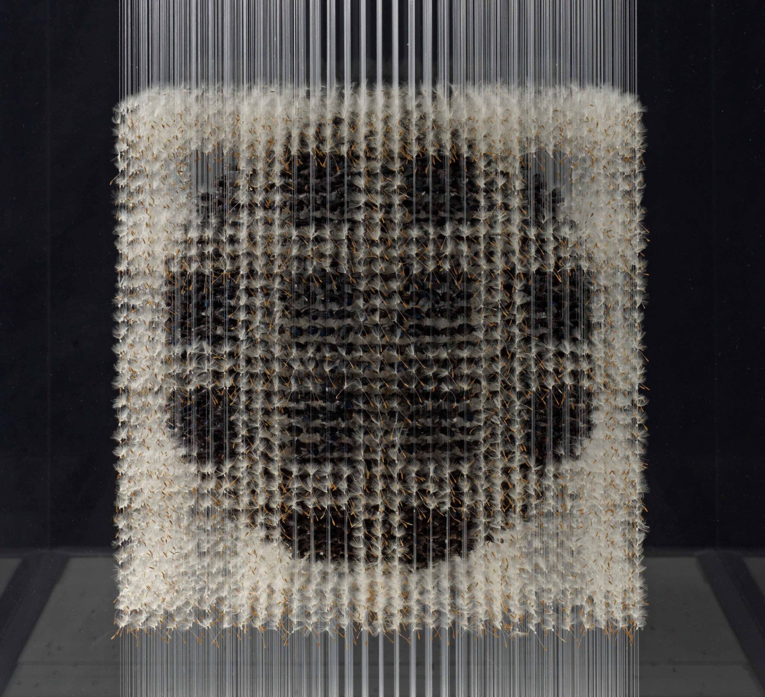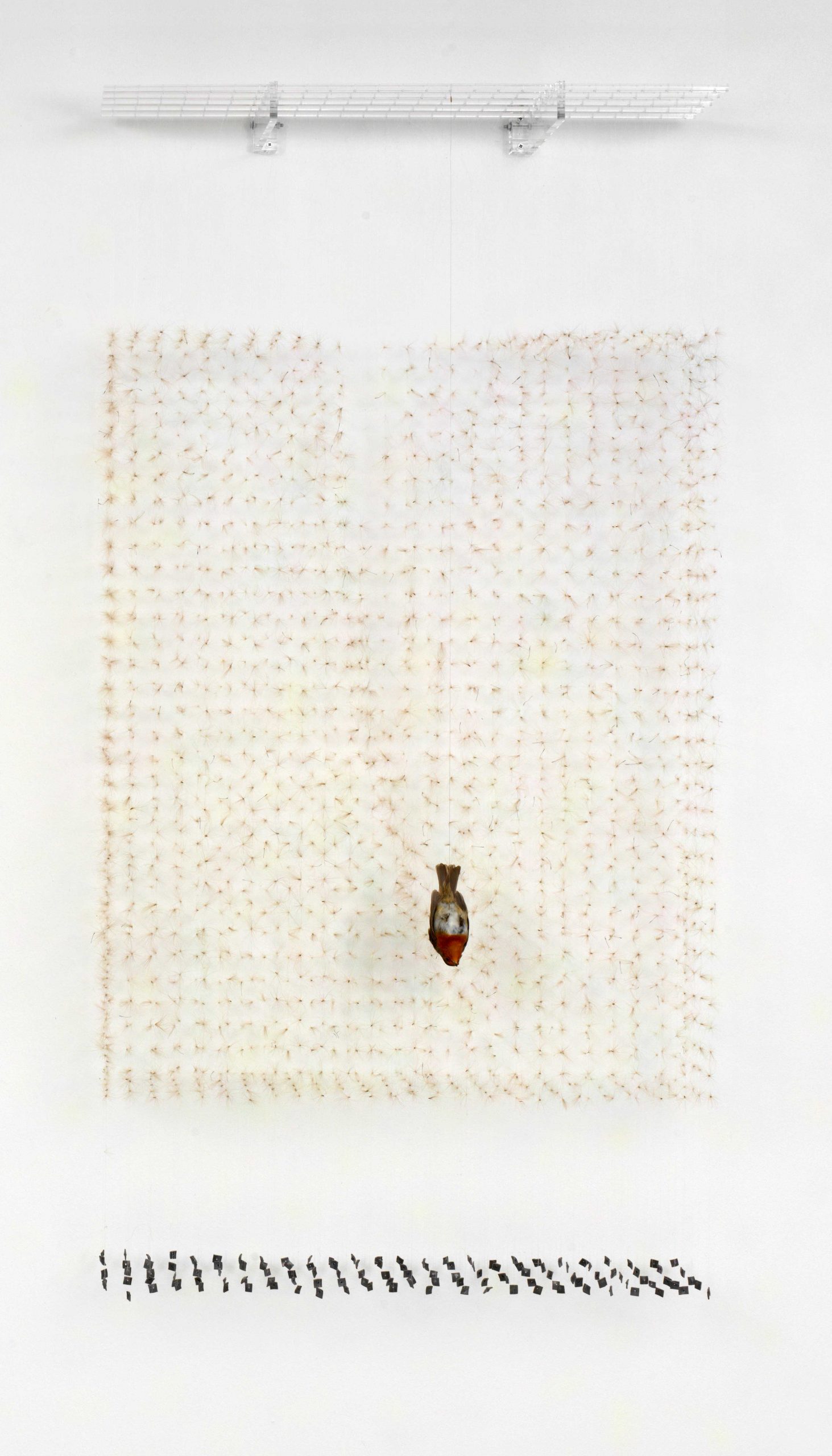 Robin (taxidermy), thistle seeds, nylon, lead, 155 x 78 cm, 2014