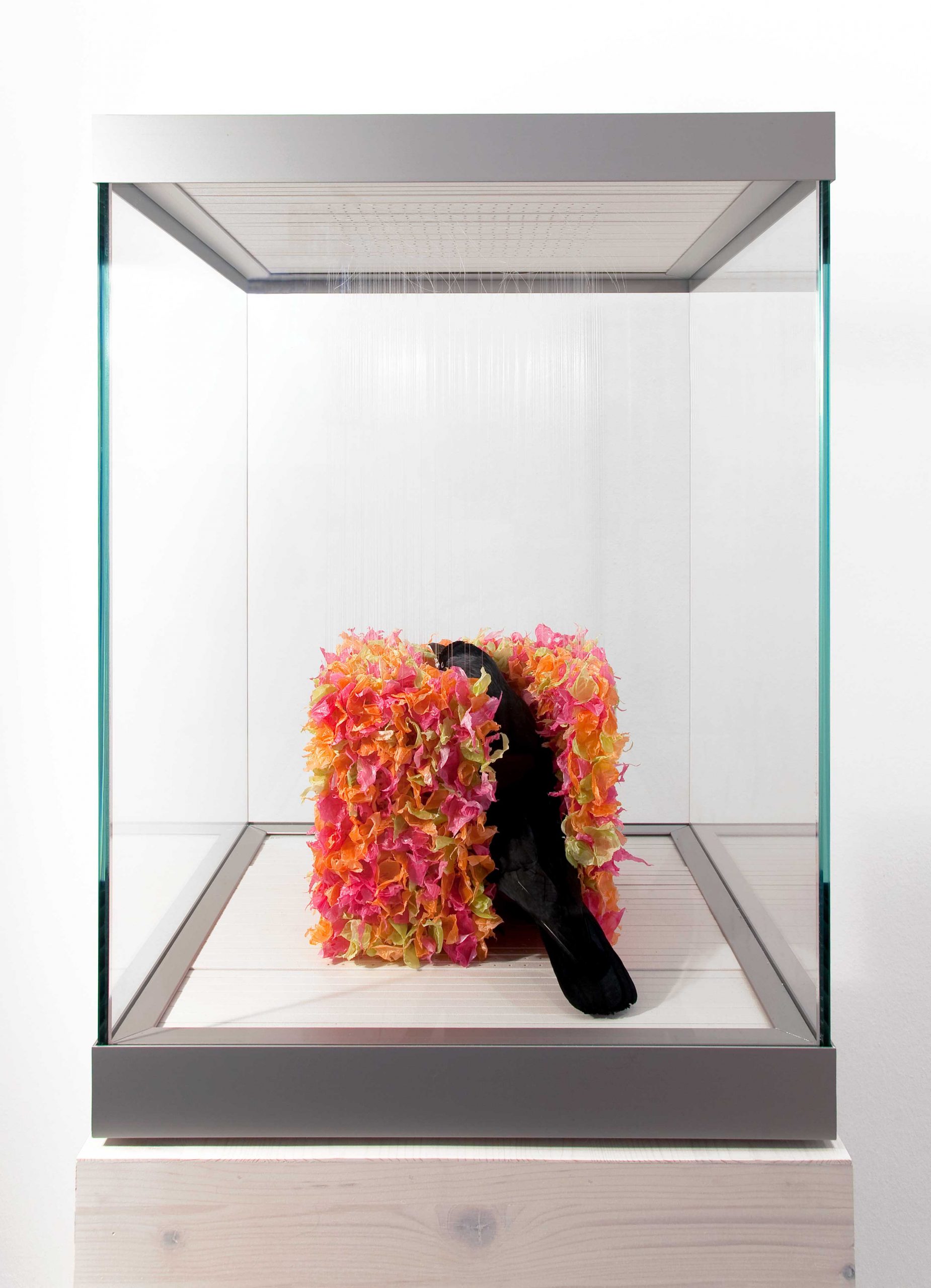Jackdaw (taxidermy) torn polythene, nylon in vitrine; 58.4 x 41.6 x 41.6 cm, 2014