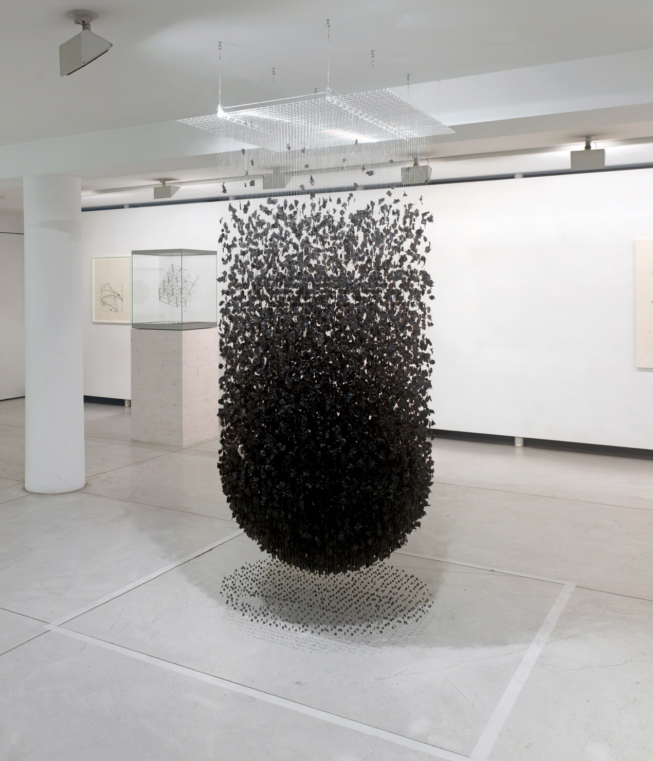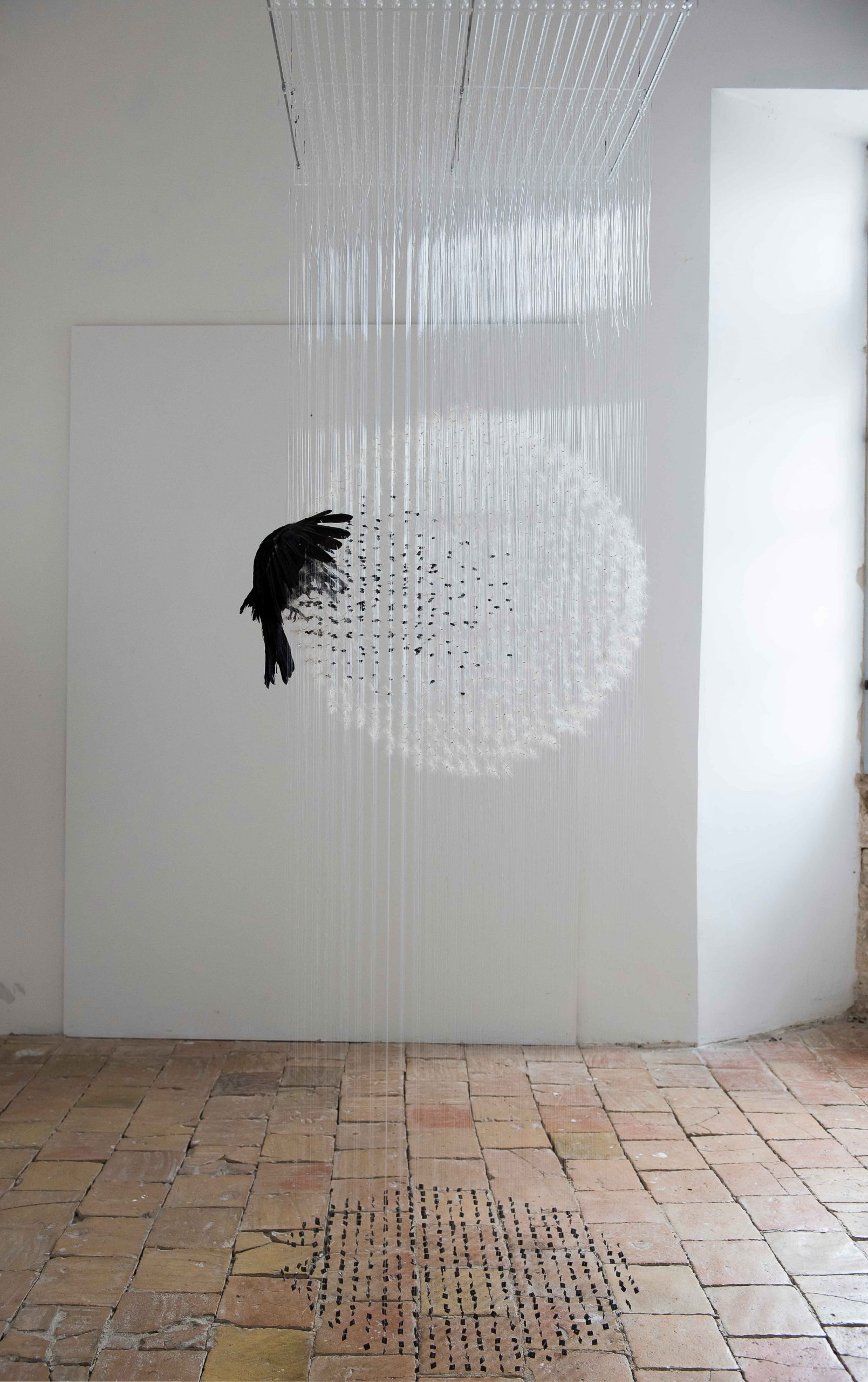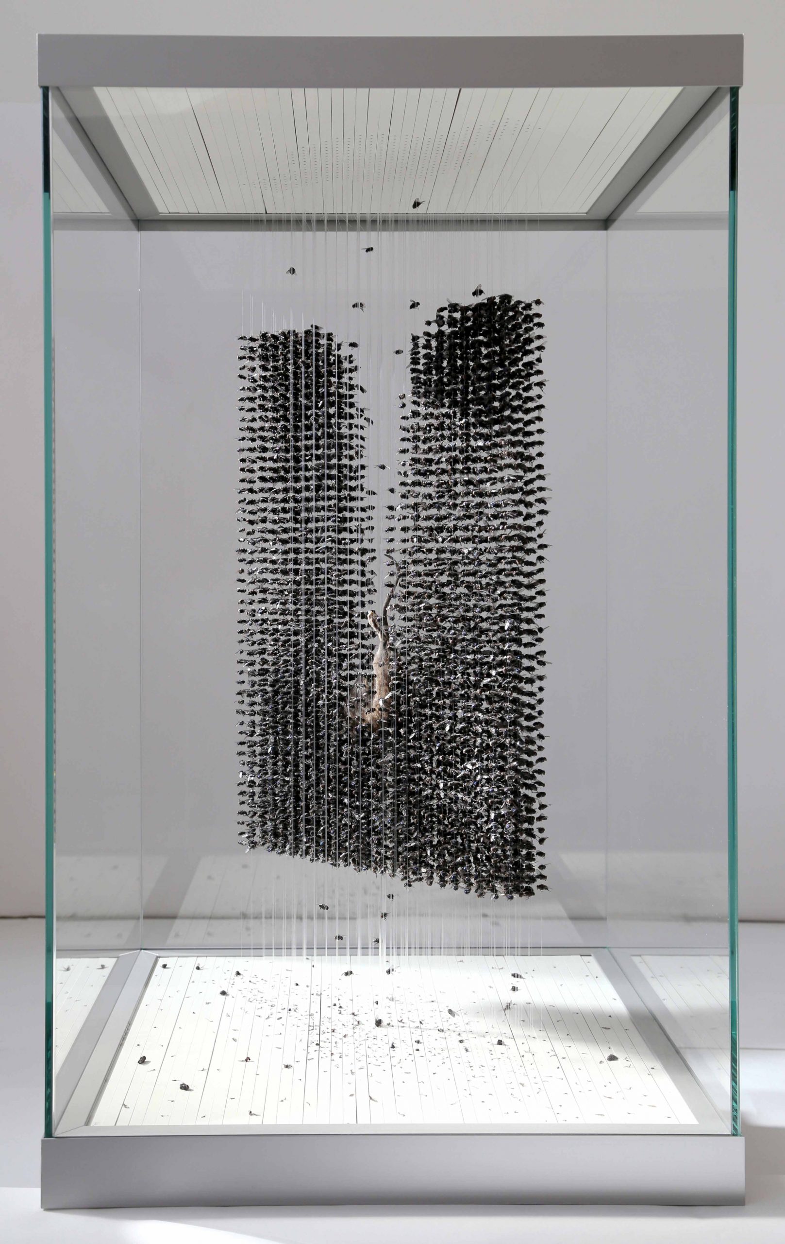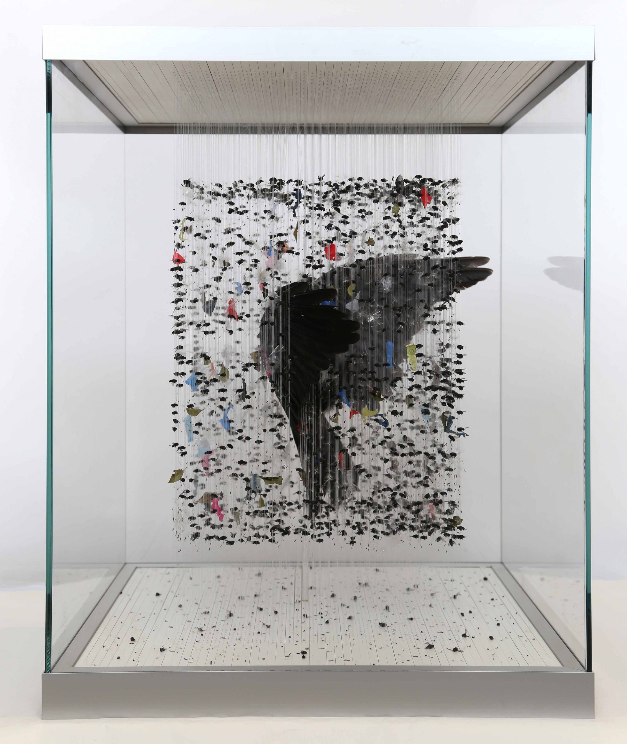 Rook (taxidermy), bluebottles, thistle seeds, nylon, lead, 250 x 75 x 75 cm, 2014