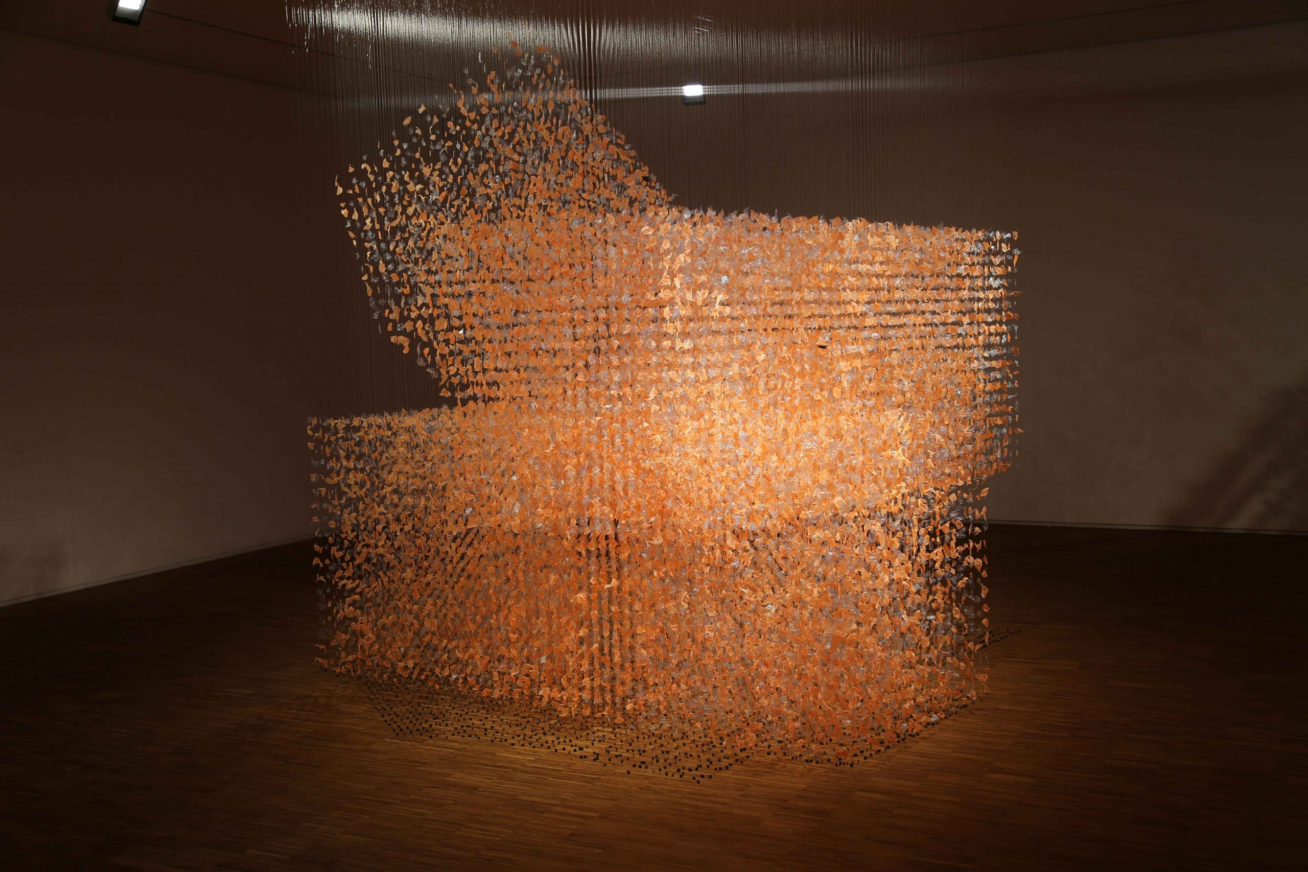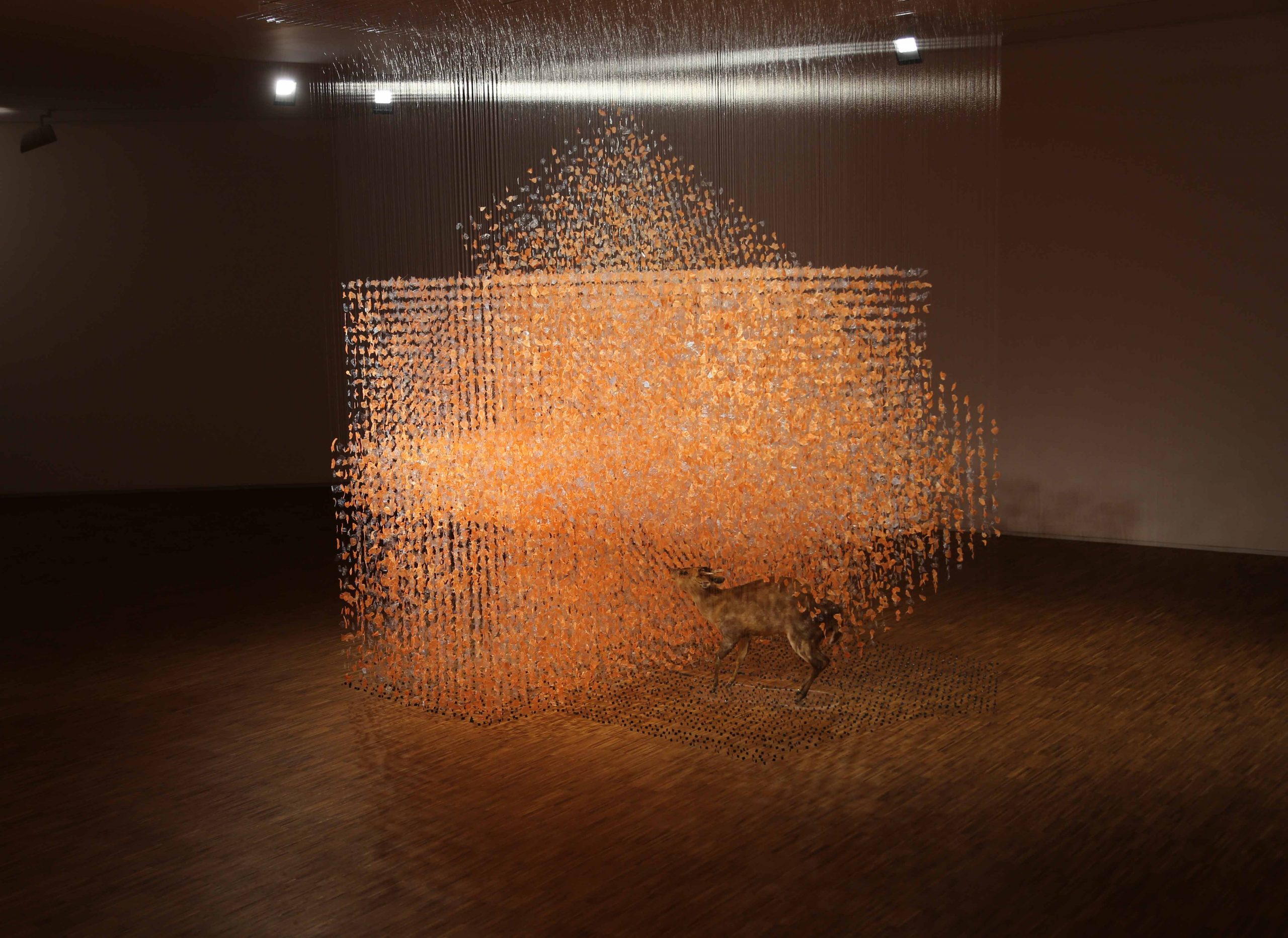 Muntjac deer (taxidermy), butterflies, torn coloured polythene, nylon, lead, 300 x 300 x 250 cm, 2014