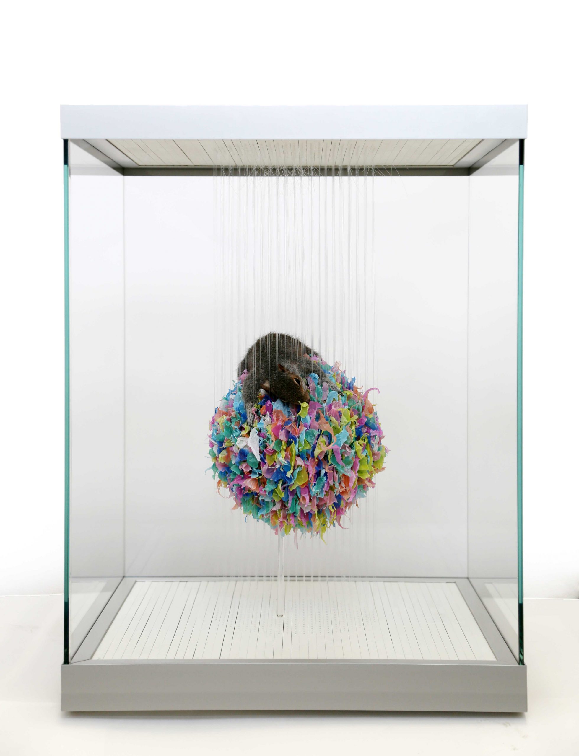 Rat (taxidermy), Bluebottles, nylon, in vitrine, 88.4 x 51.6 x 51.6 cm, 2014