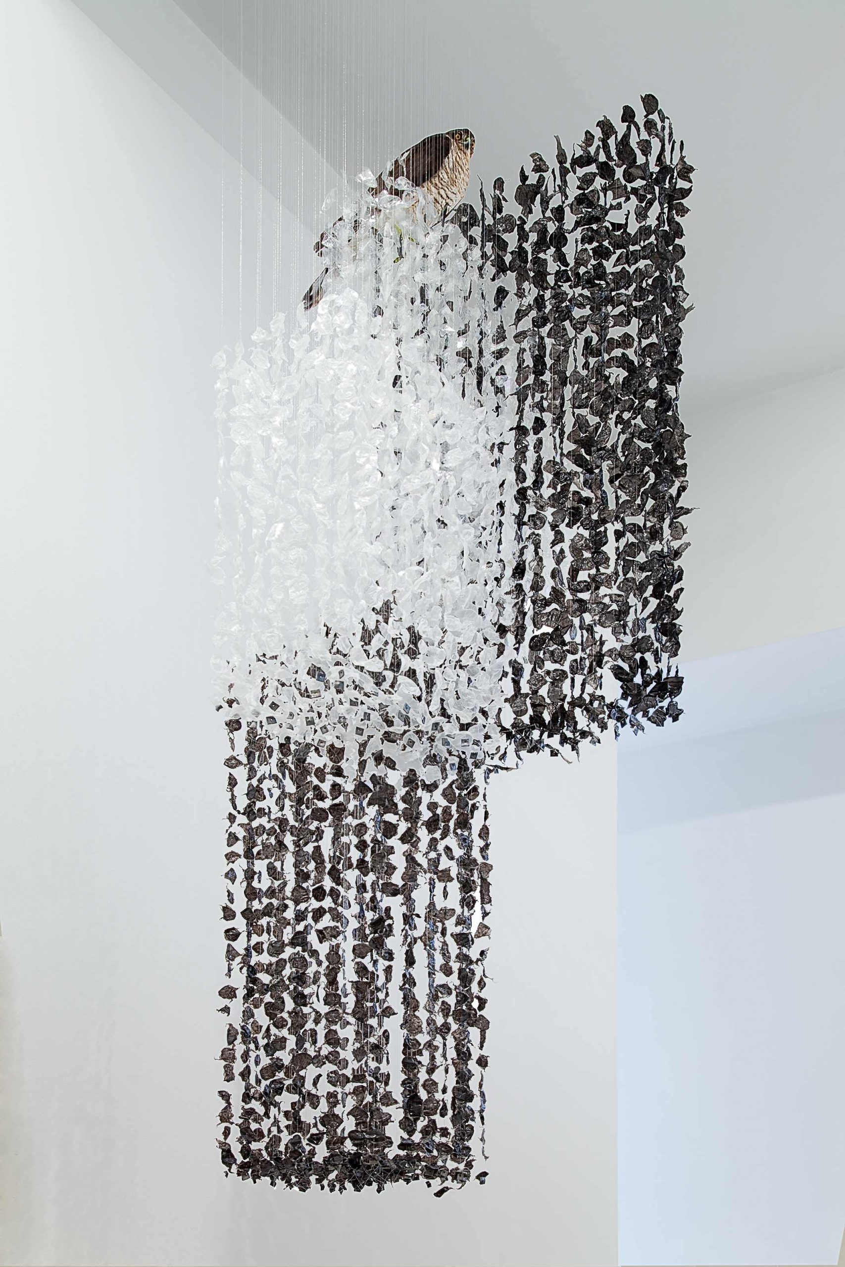 Puffin (taxidermy), black torn polythene, nylon, lead, 230 x 100 x 100 cm, 2014