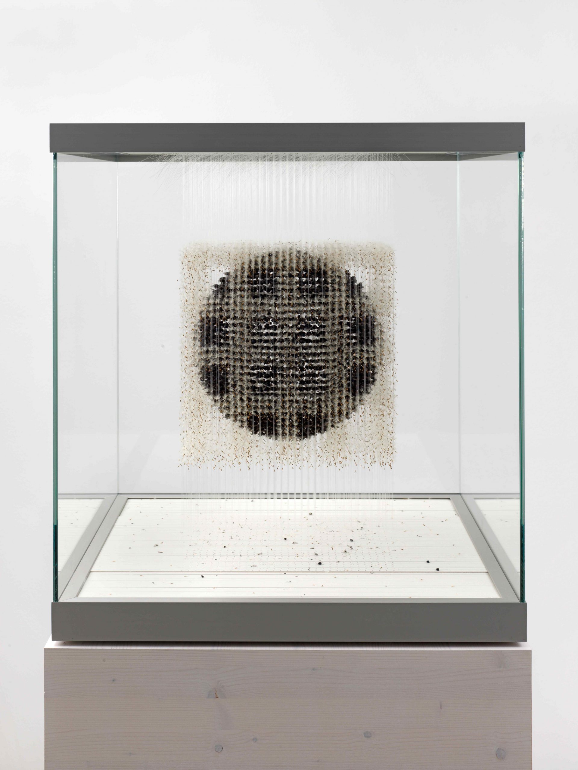 Bluebottles, dandelion seeds, nylon in vitrine, 68.4 x 61.6 x 61.6 cm, 2014