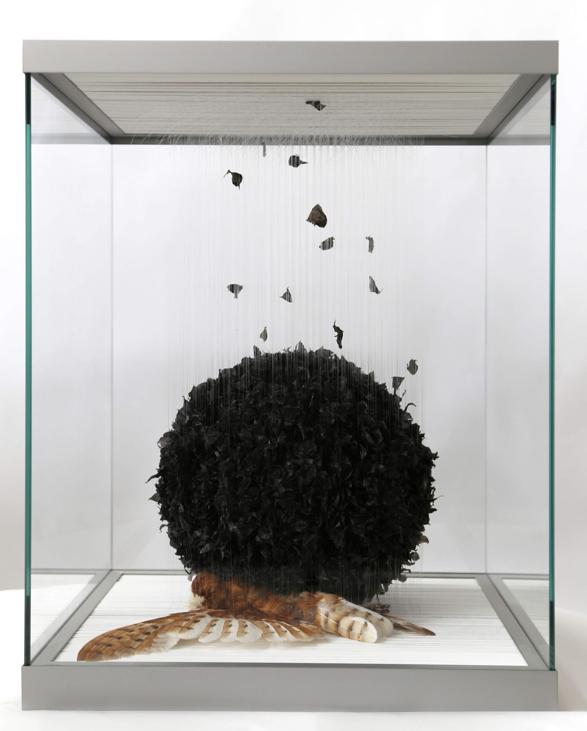 Owl (taxidermy), polythene, nylon, in vitrine, 78.4 x 61.6 x 61.6 cm, 2014