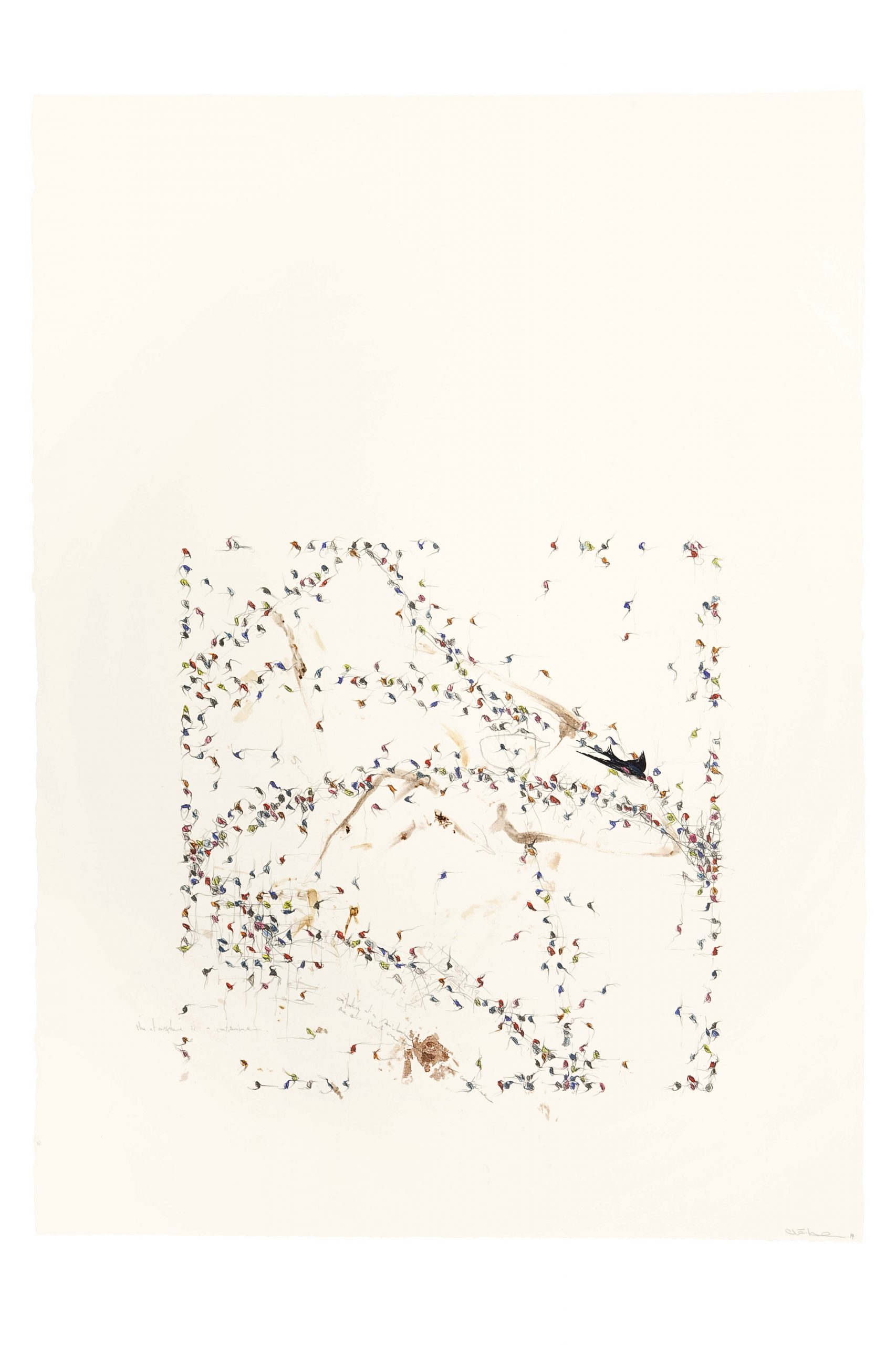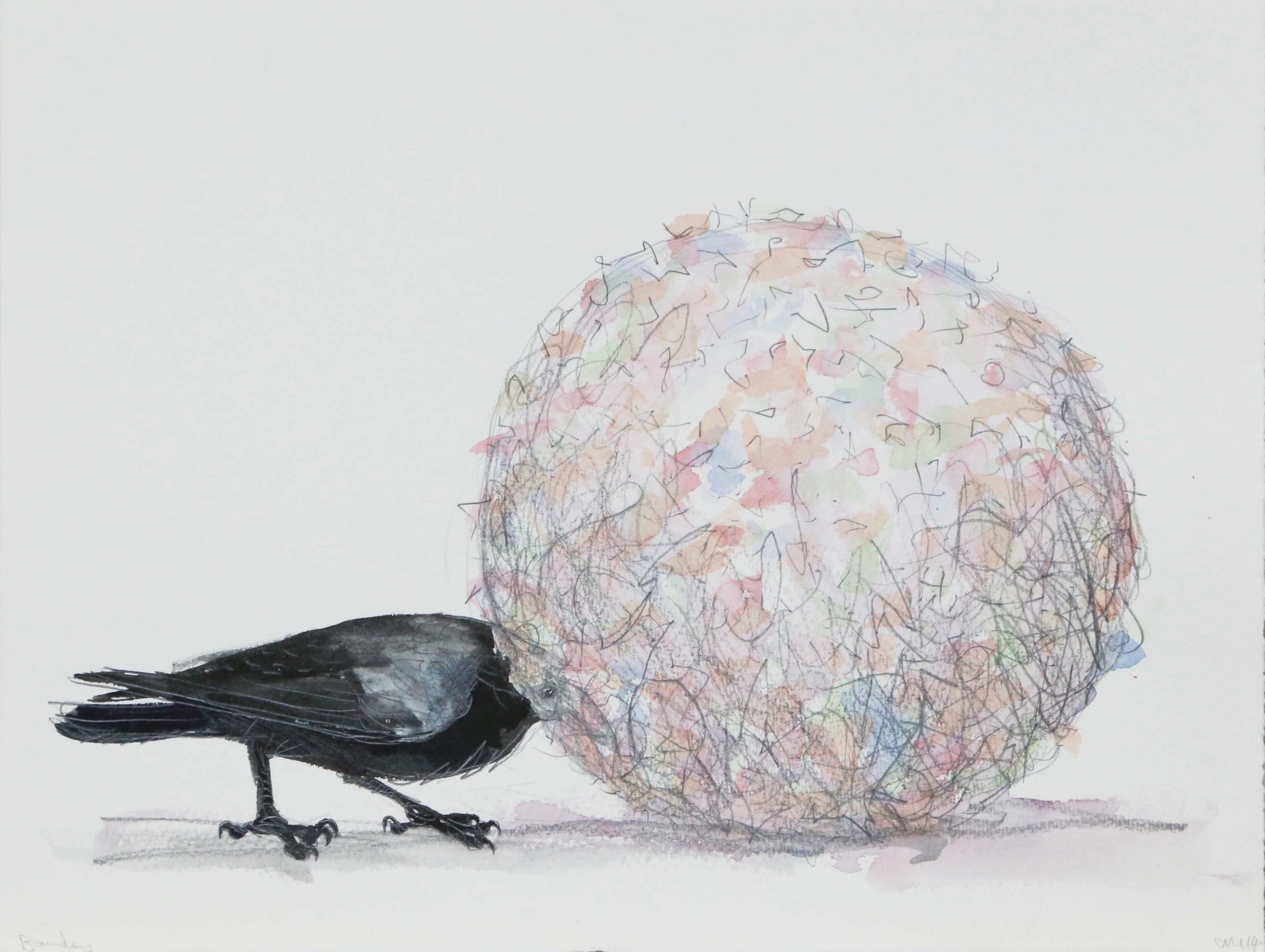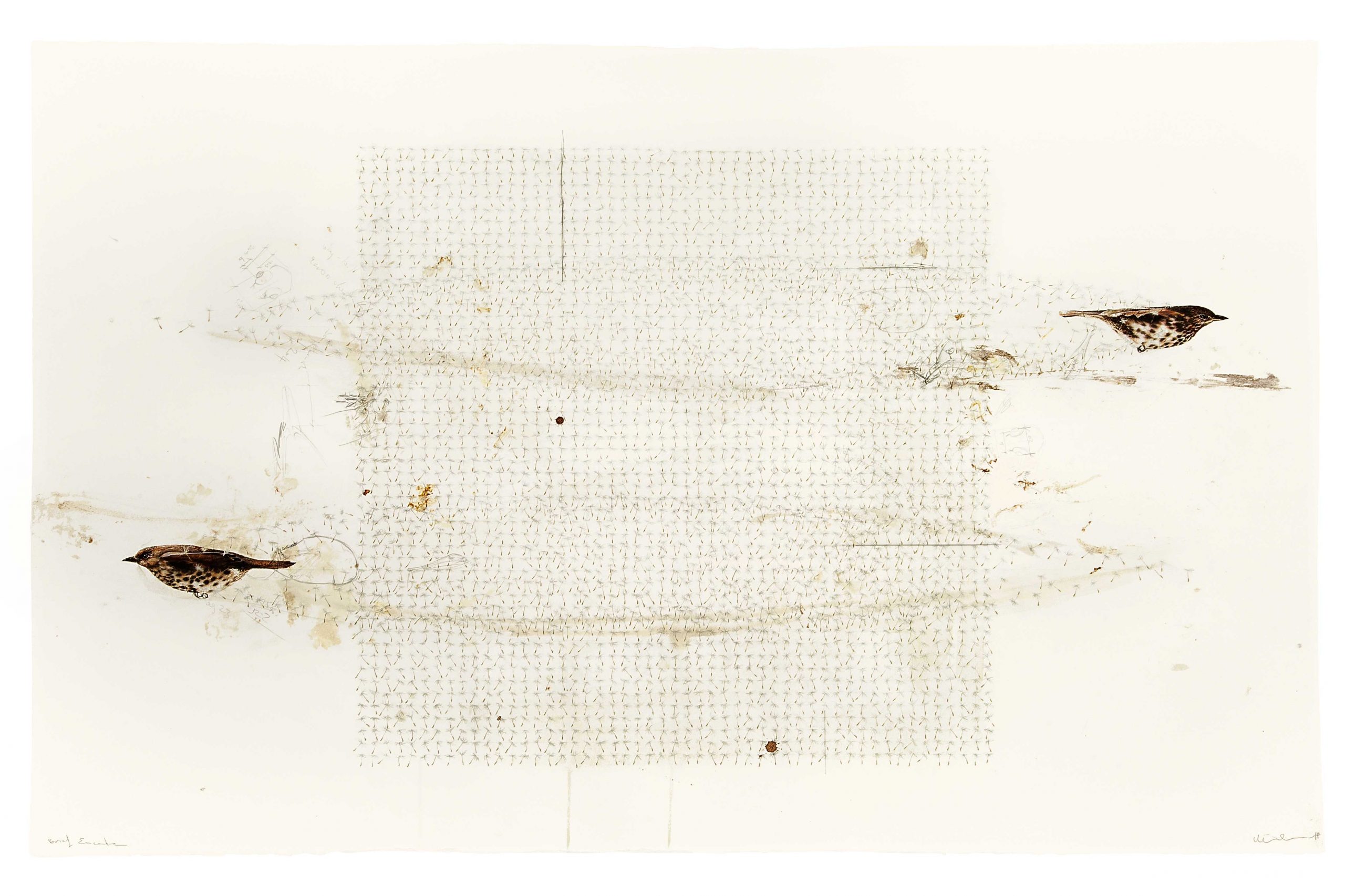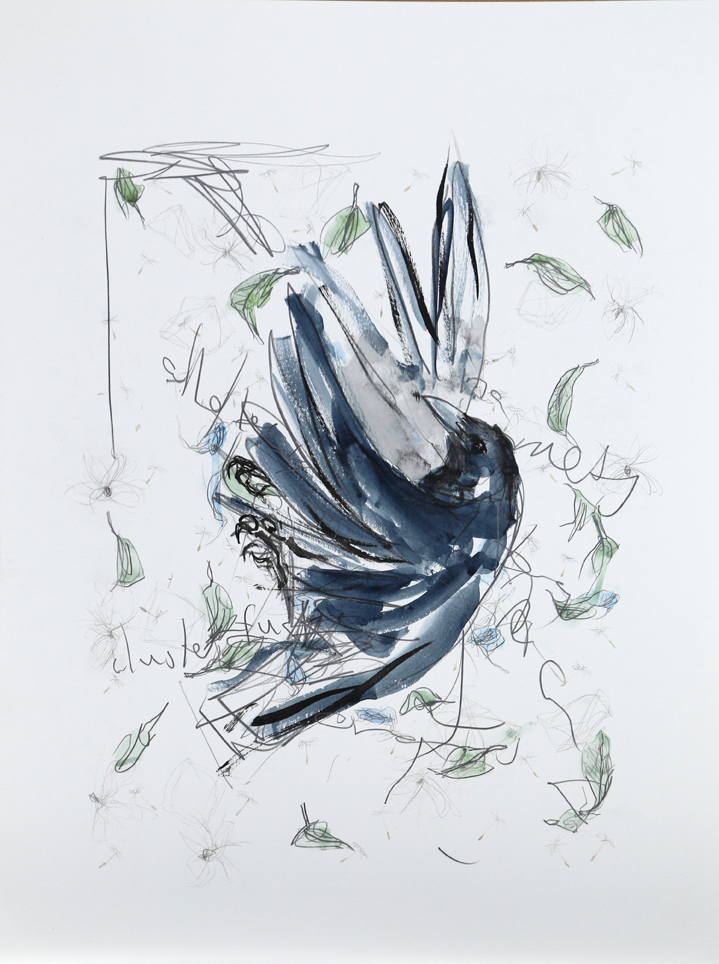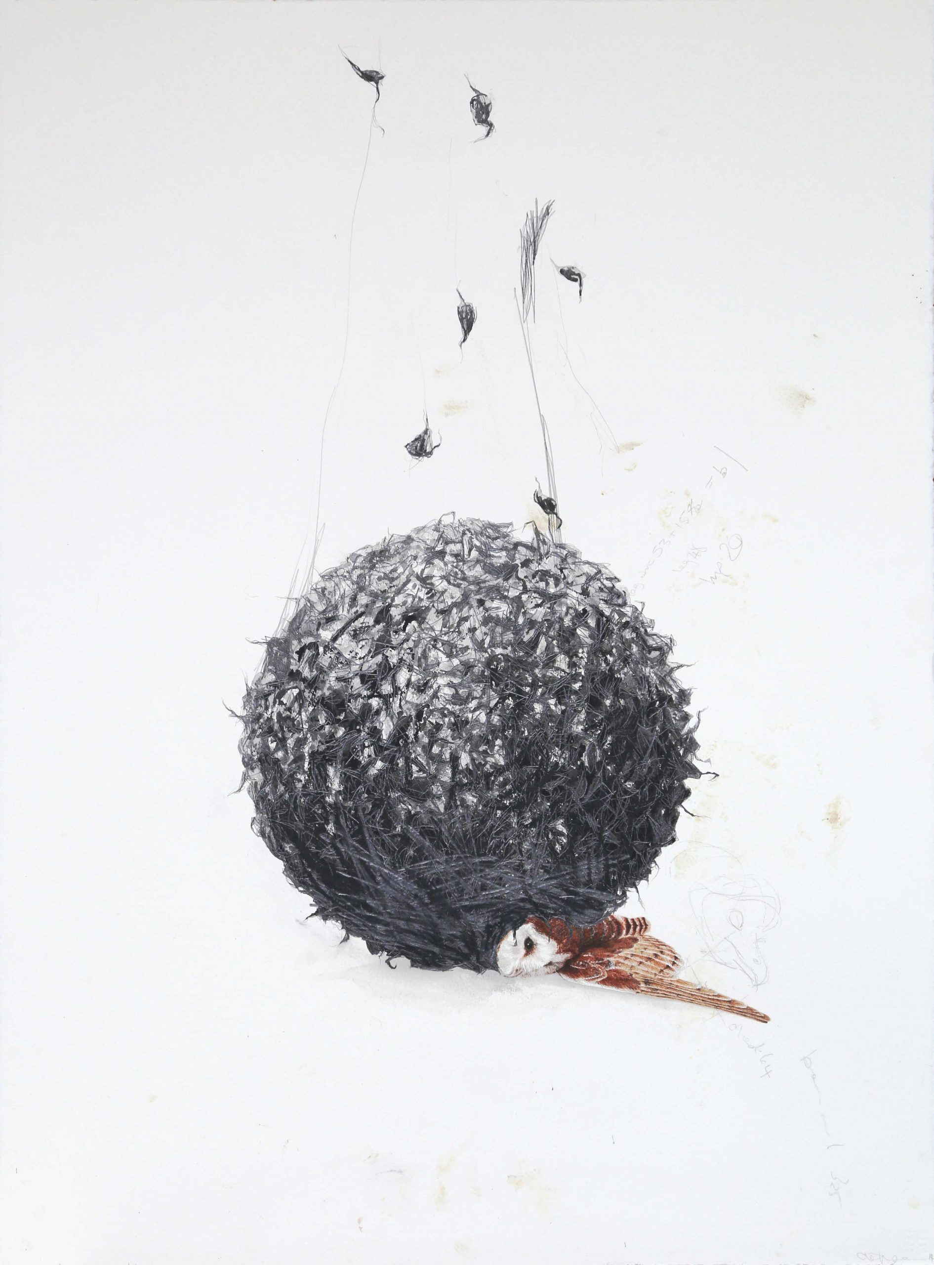 Pencil, watercolour, taxidermy residues on paper, 76 x 56.5 cm, 2014