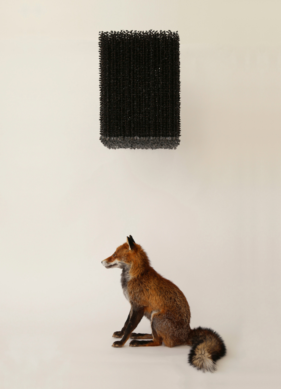 Fox (taxidermy), bluebottles, nylon, lead, 233x60x50 cm, 2014