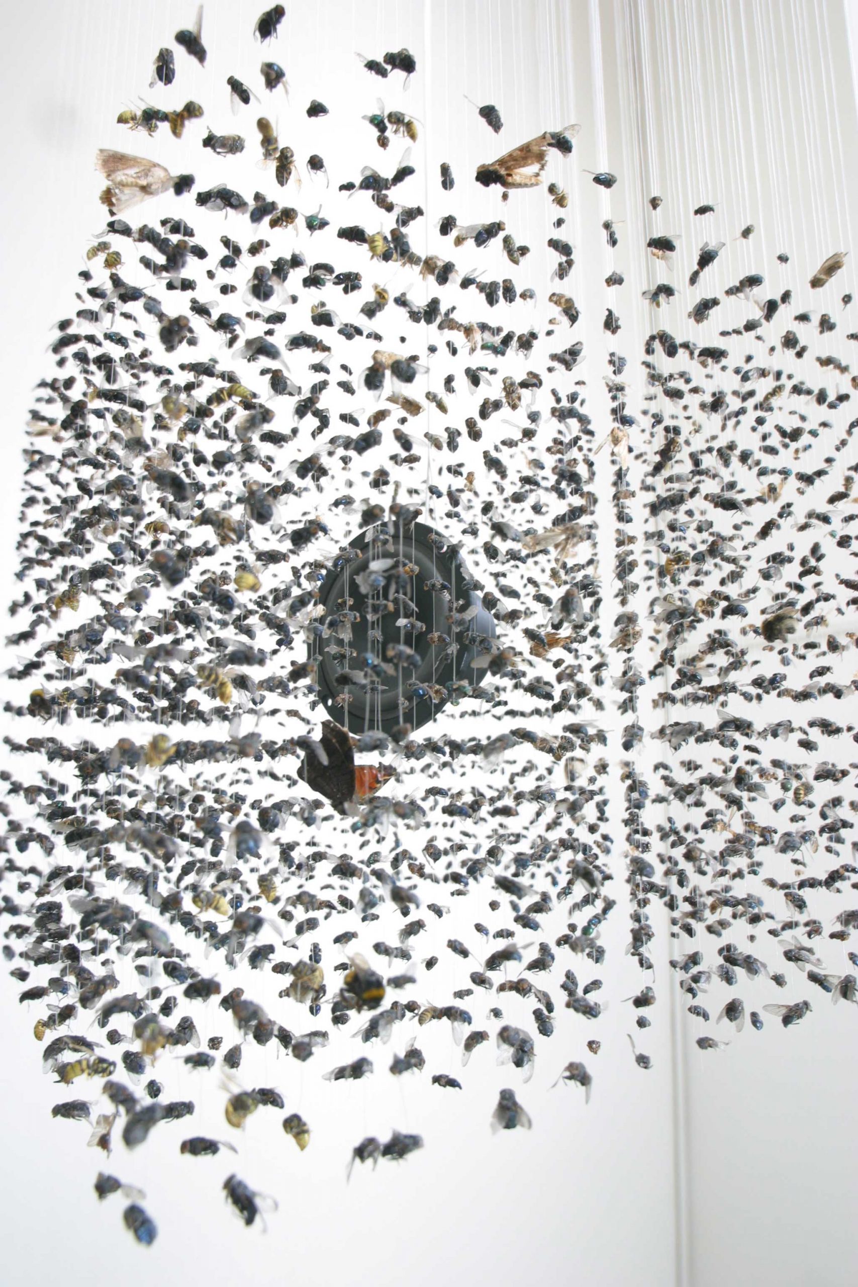 Various insects, nylon, speaker in vitrine, 30 x 30 x 30 cm, 2007