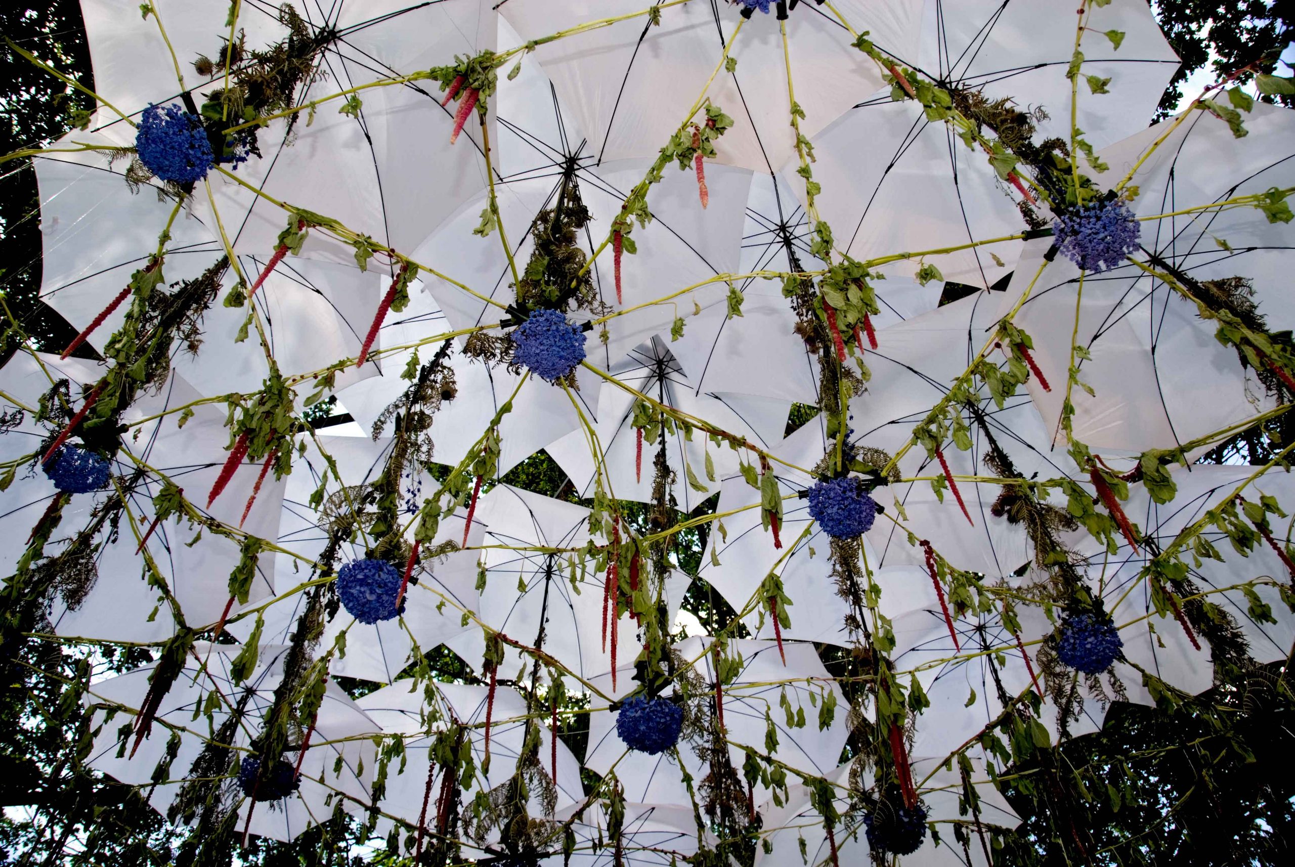 Umbrellas, nylon, steel, Hydrangea, Amaranthus, Delphinium, wild flowers collected on-site, 200 x 550 x 550 cm, 2009
