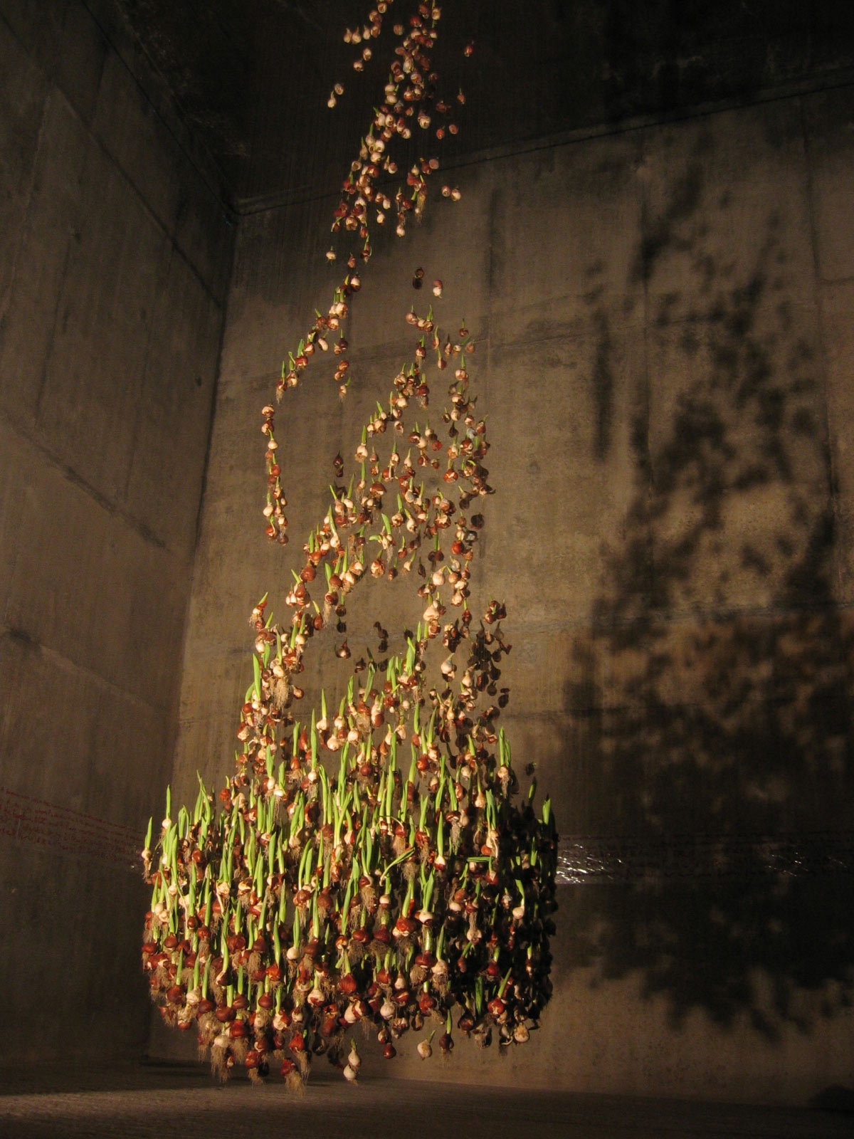 Tulip bulbs, iron oxide, nylon, 800 x 120 x 120 cm, 2004