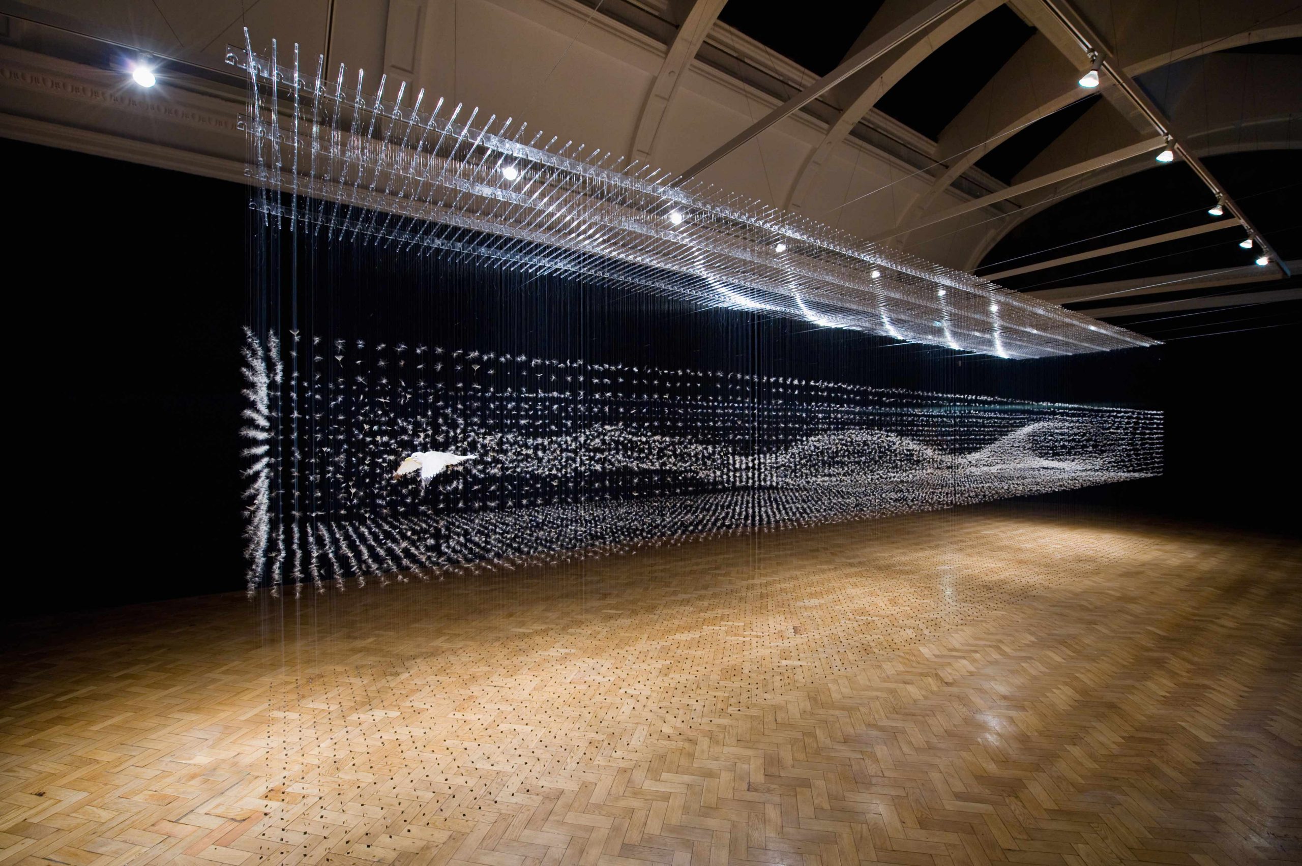 Wild flower seeds, kittiwake (taxidermy), nylon, lead, acrylic, 220 x 200 x 1100 cm, 2008
