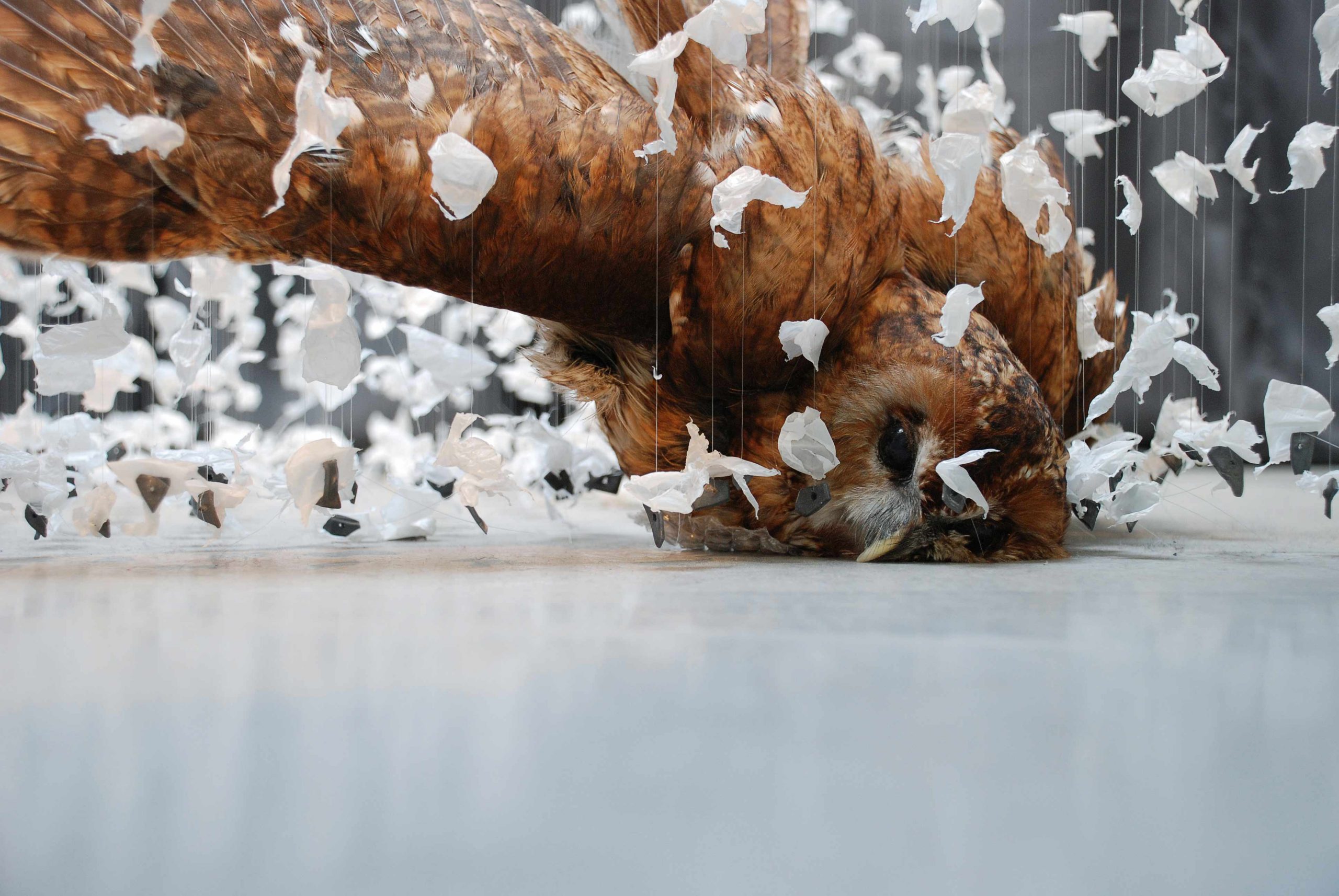 Pigeon (taxidermy), dunnock, leaves, found plastic, nylon, lead, acrylic, dimensions variable, 2008