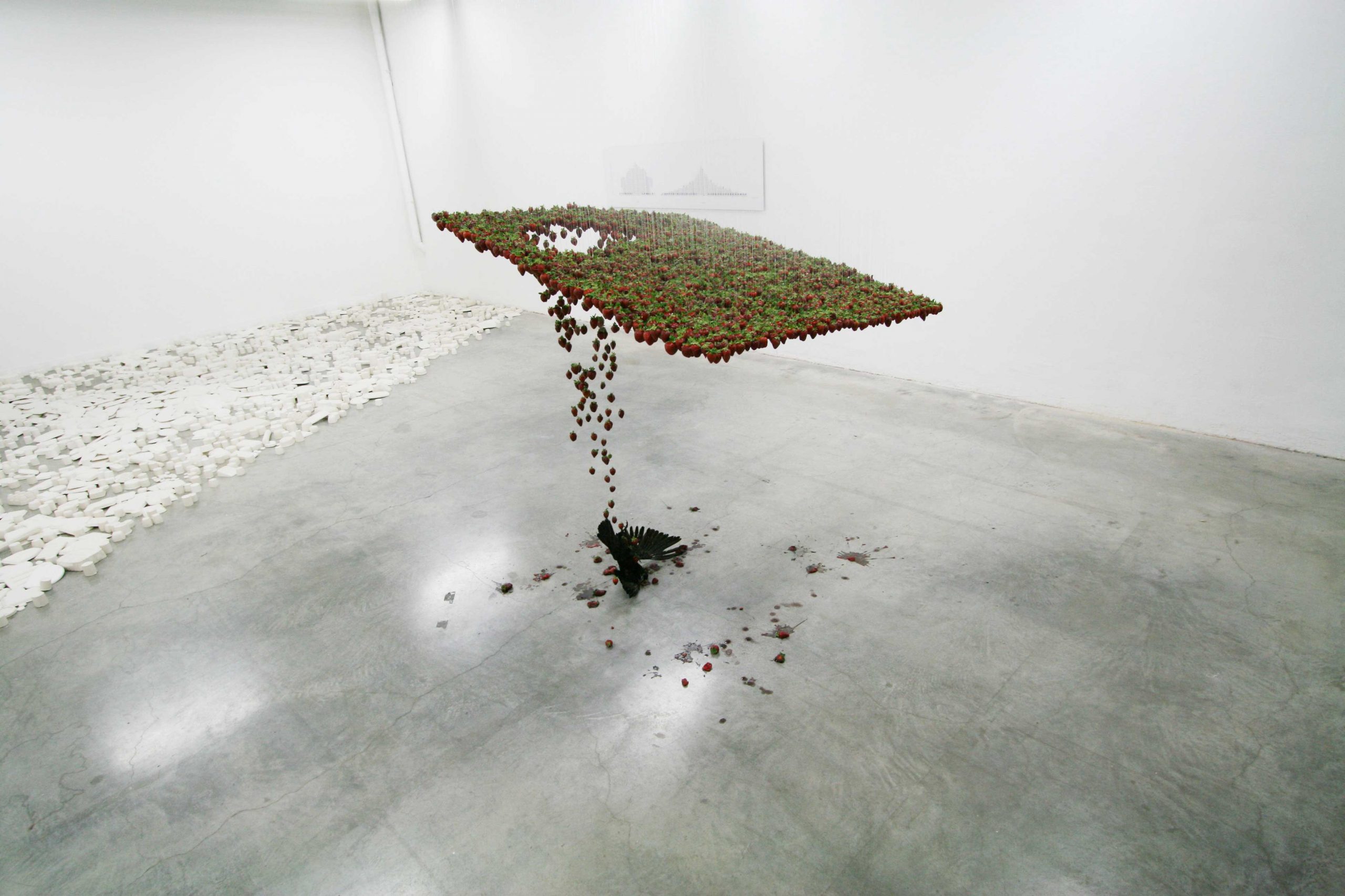 2009, Crow (taxidermy), strawberries, fishing hooks, nylon, dimensions variable