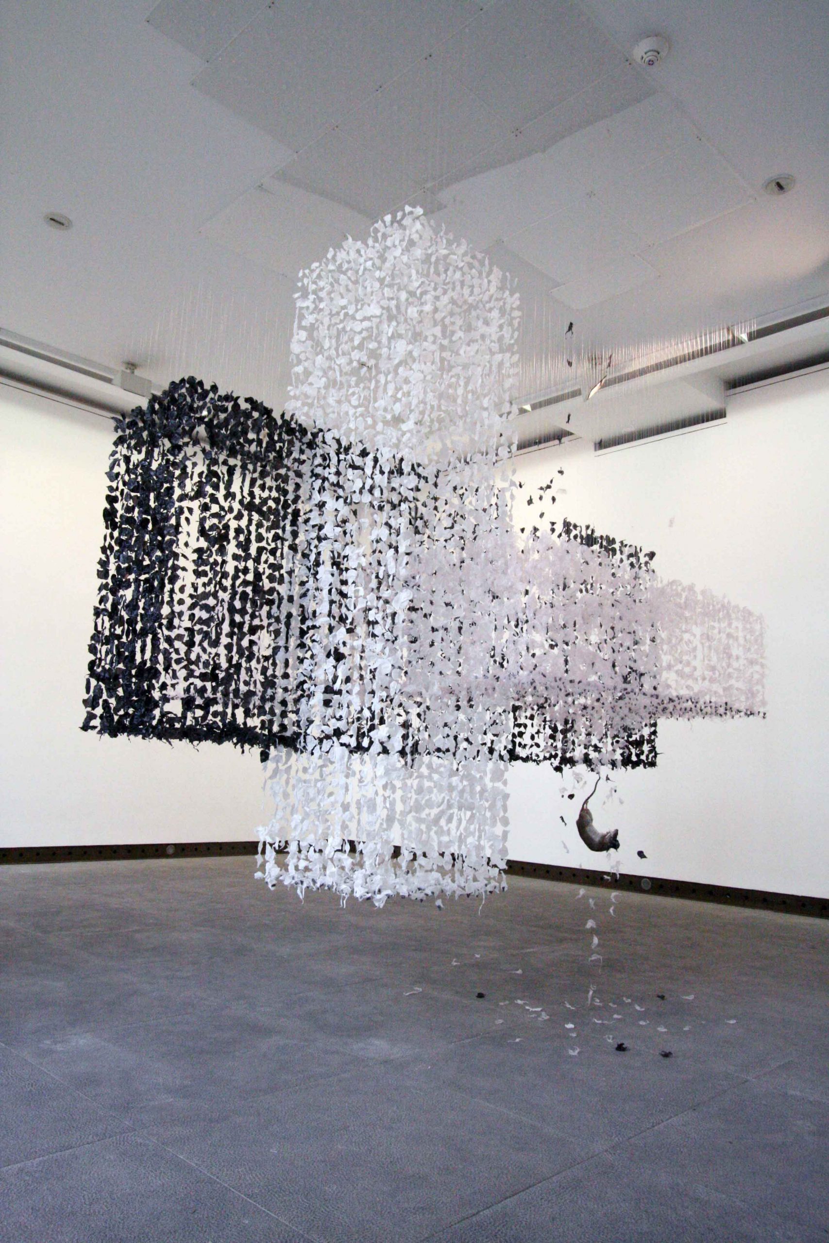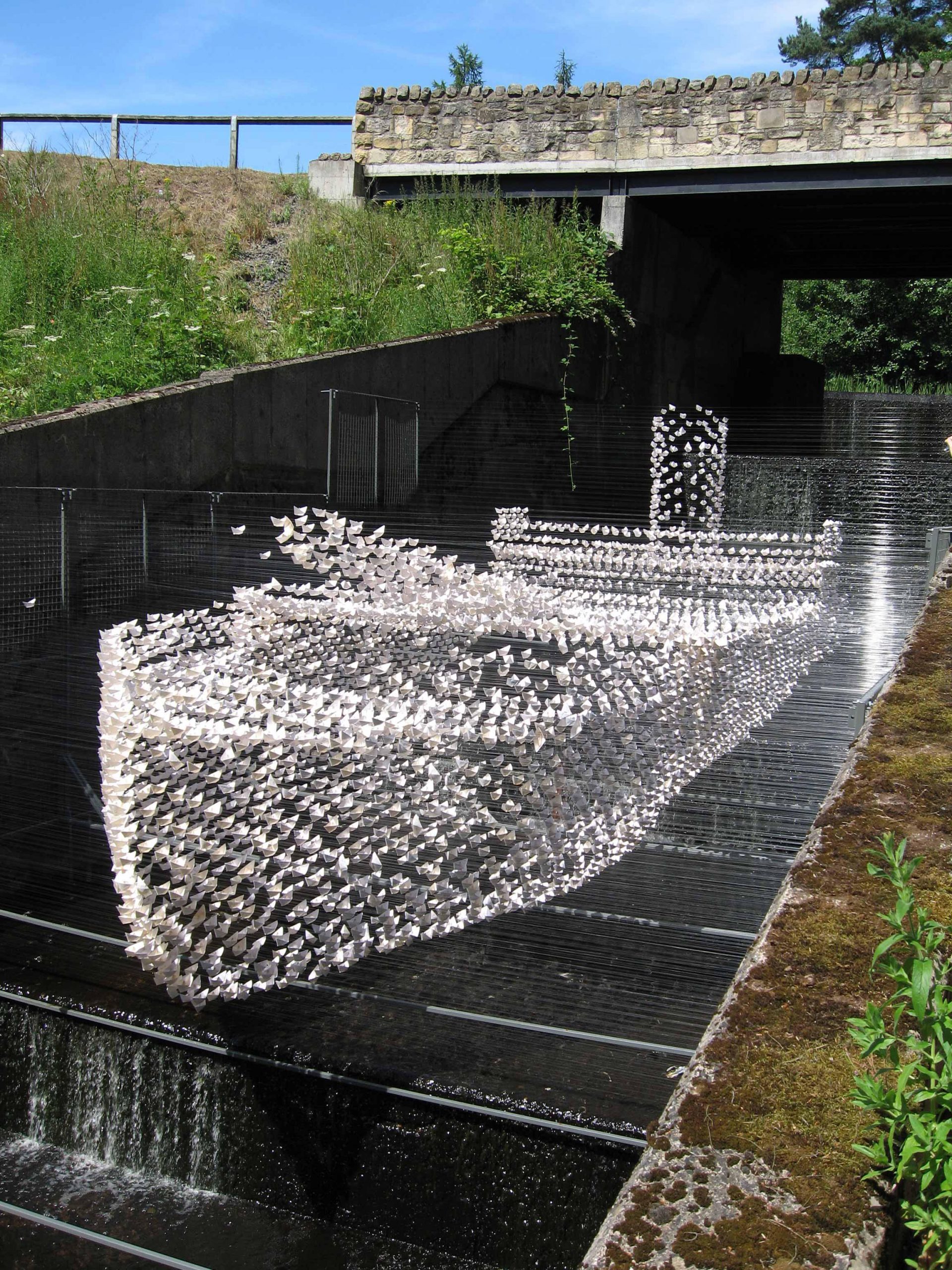 2006, 5,300 origami paper boats, fishing line, steel, 160 x 600 x 900 cm